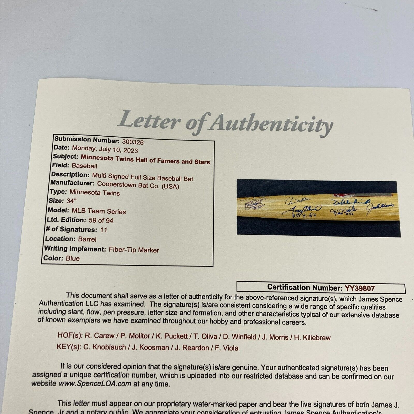 Minnesota Twins multi-signed baseball bat with HOFers. 34" Cooperstown Bat Co. Twins team series bat signed by (11) including Harmon Killebrew with "HOF 84" inscription, Kirby Puckett with "HOF 2001" inscription, Paul Molitor, Dave Winfield, Jack Morris, Rod Carew with "HOF 91" inscription, Tony Oliva with "ROY 64" inscription, Frank Viola, Chuck Knoblauch with "ROY 91" inscription, Jeff Reardon, and Jerry Koosman.