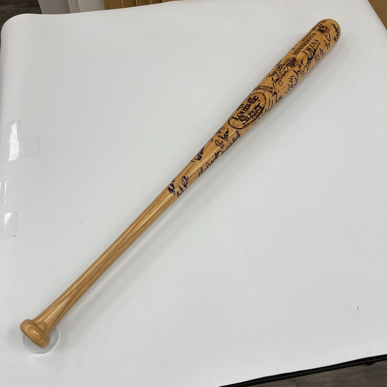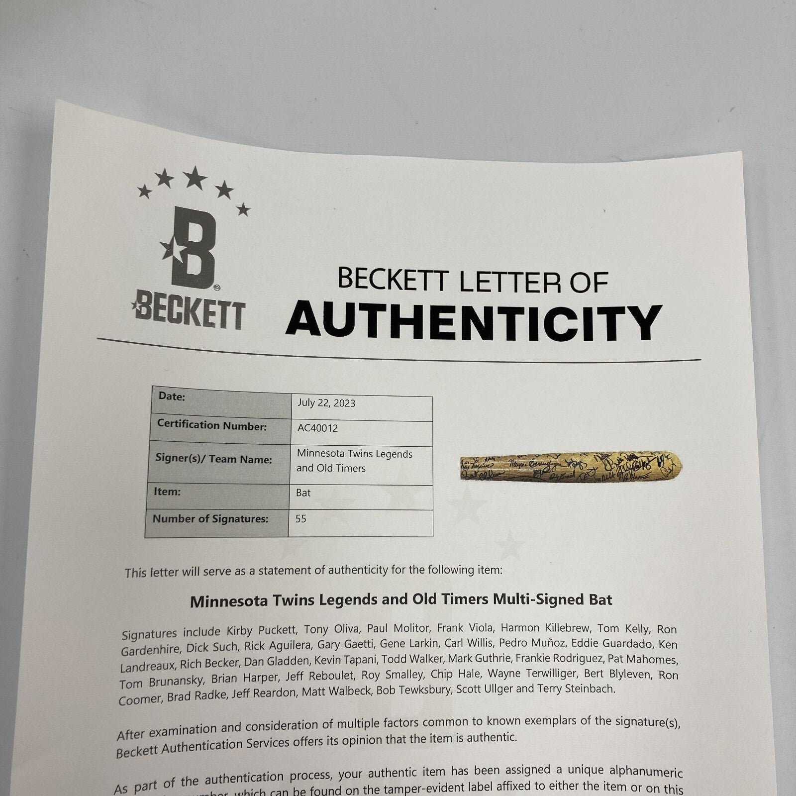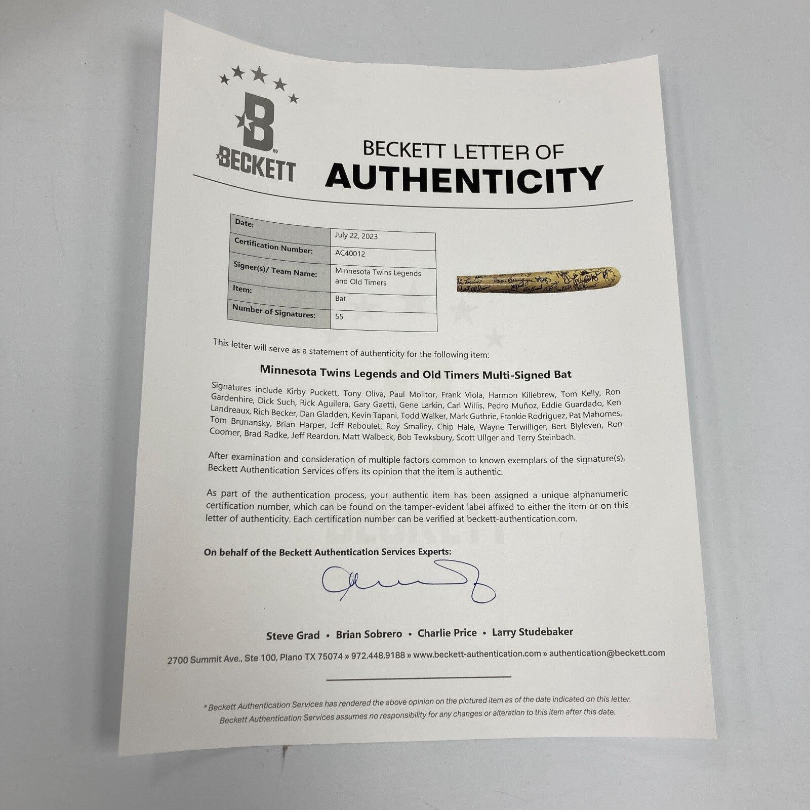 Minnesota Twins autographed bat signed by 55 former players. The Hall of Famers include Kirby Puckett, Harmon Killebrew, Bert Blyleven, Paul Molitor, & Tony Oliva. Other key signatures include Tom Kelly, Frank Viola, Brian Harper, & Tom Brunansky. Accompanied by a full Beckett Letter of Authenticity.