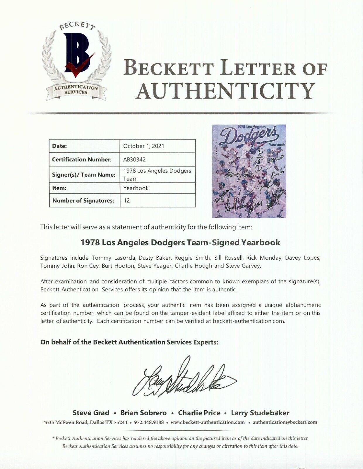 This 1978 Los Angeles Dodgers yearbook is signed by 12 different members of the team. Signatures include: Tommy Lasorda, Dusty Baker, Reggie Smith, Bill Russell, Rick Monday, Davy Lopes, Tommy John, Ron Cey, Burt Hooton, Steve Yeager, Charlie Hough and Steve Garvey. Full LOA from BAS.