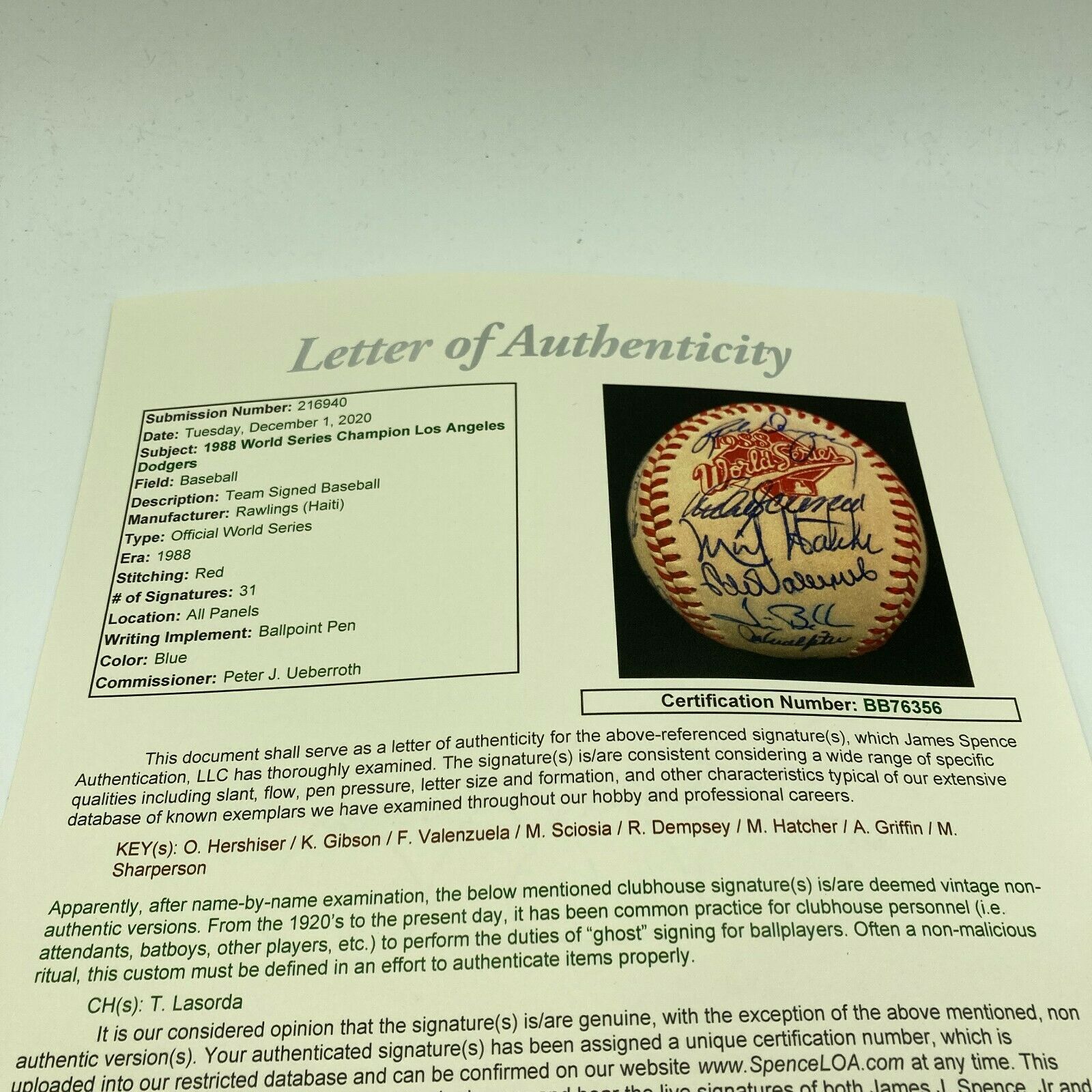 1988 Los Angeles Dodgers team signed World Series baseball. P.Ueberroth 1988 World Series ball signed by (31) members of the champion Dodgers including Orel Hershiser, Kirk Gibson, Mike Scioscia, Fernando Valenzuela, Tim Belcher, John Shelby, Brian Holton, Rick Dempsey, Alejandro Pena, Tim Crews, Dave Anderson, John Tudor, Jesse Orosco, Mike Sharperson, Jeff Hamilton, Mickey Hatcher, Alfredo Griffin, Franklin Stubbs, and others (Lasorda is clubhouse signed).