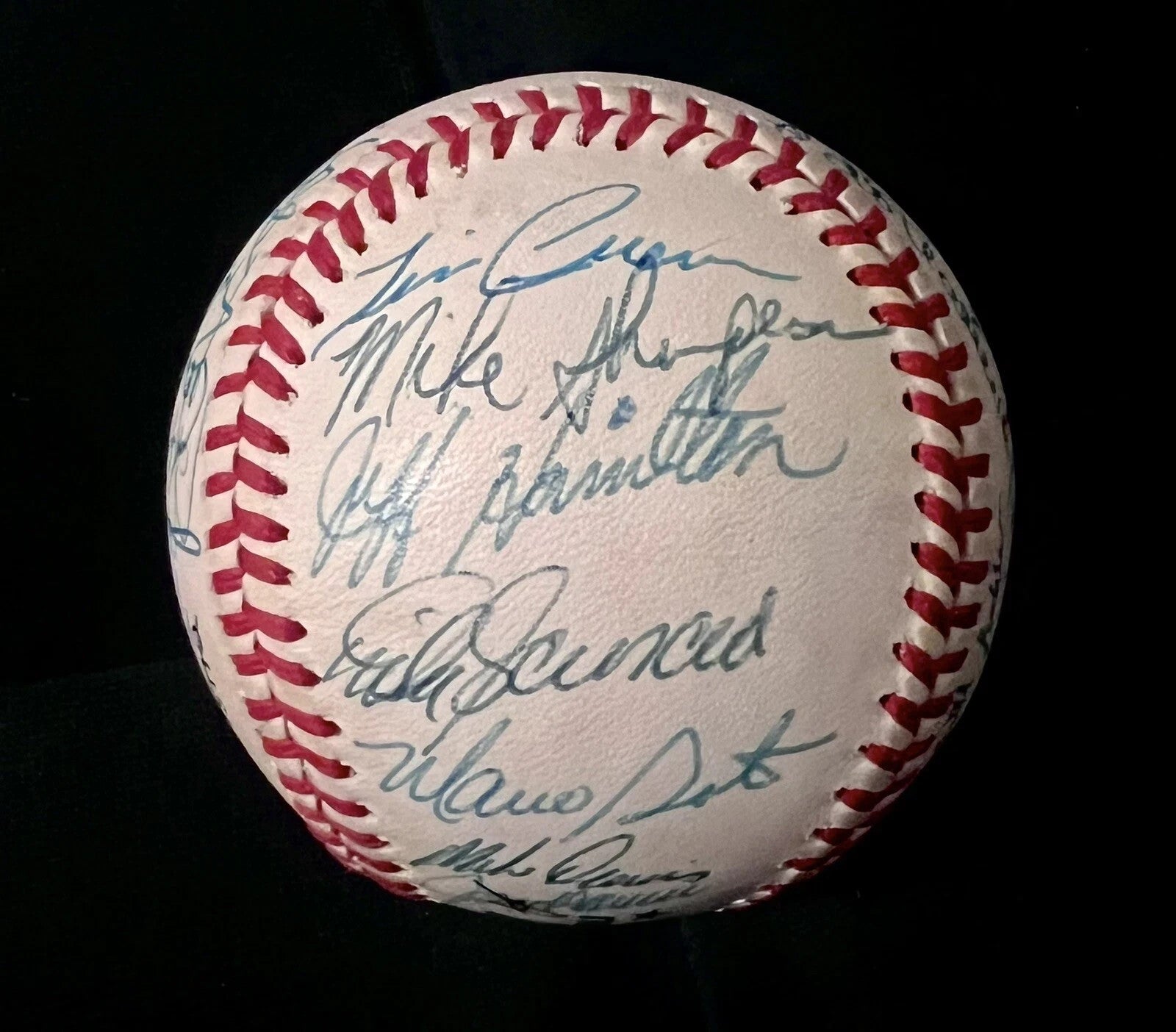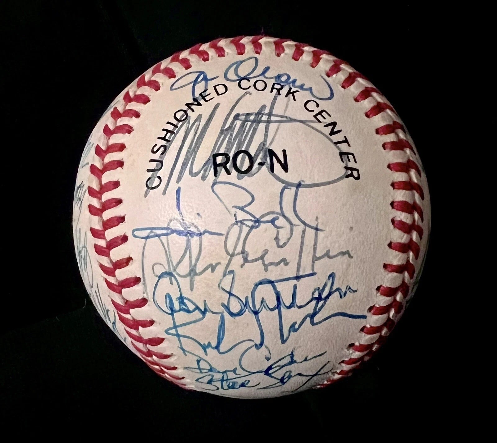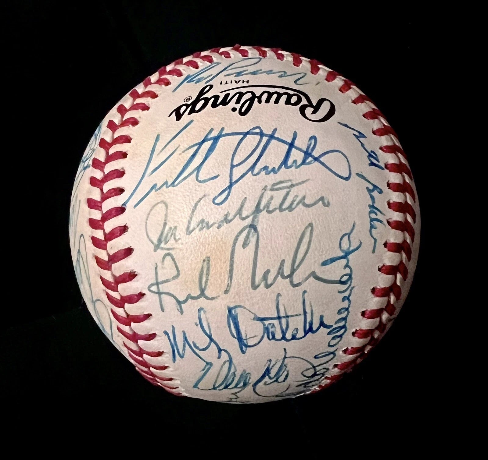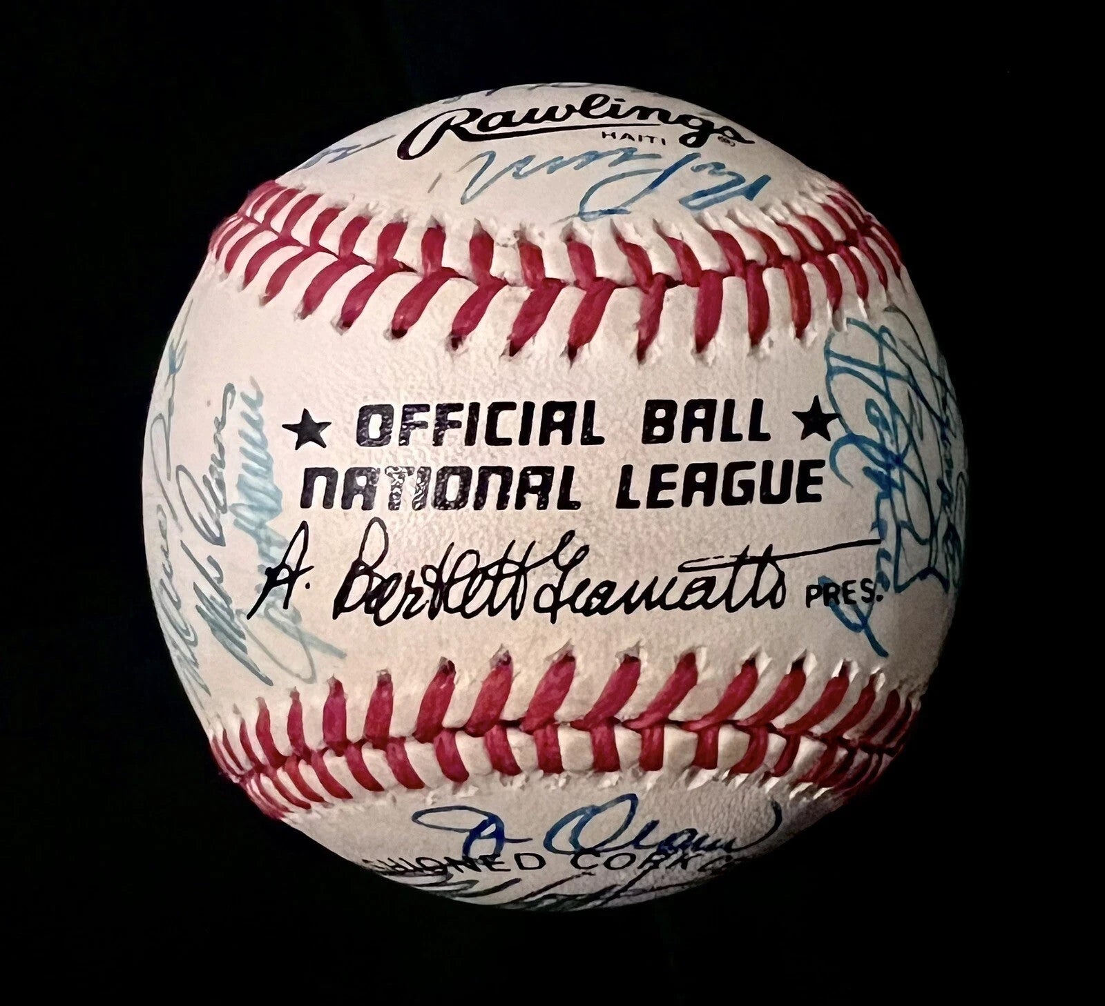 Official National League (Giamatti) baseball signed in ink by 30 members (31 signatures, Gibson x2) of the 1988 World Series Champion Los Angeles Dodgers, including Hall of Famers: Don Sutton and Tommy Lasorda. Other key signatures include: Orel Hershiser (WS MVP), Kirk Gibson (x2), Pedro Guerrero, Valenzuela, Sax, Crews, Scioscia, Marshall and Sharperson