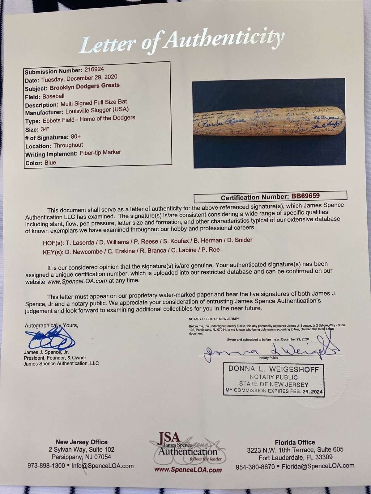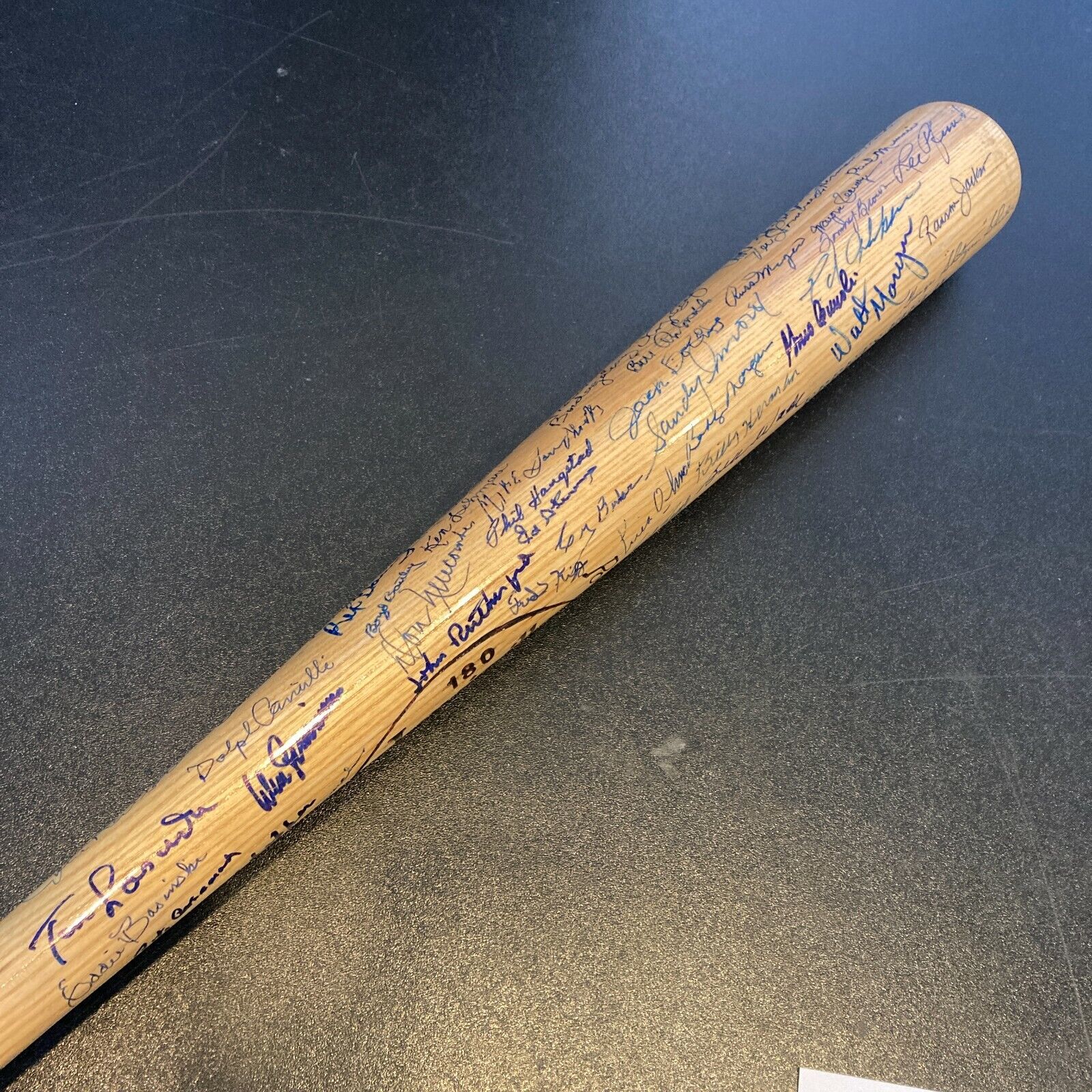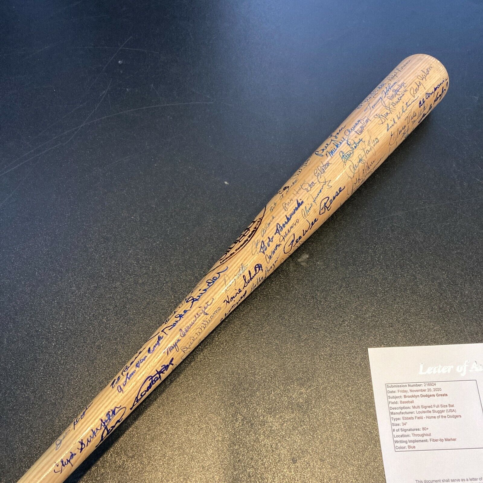 Extraordinary Louisville Slugger Ebbets Field Commemorative bat signed by 90+ former Brooklyn/LA Dodgers. Signatures include: Sandy Koufax, Tom Lasorda, Pee Wee Reese, Duke Snider, Dick Williams, Billy Herman, Ralph Branca, Don Newcombe, Clem Labine, Carl Erskine, Preacher Roe, George Shuba, Andy Pafko, Sandy Amoros and Roger Craig and MANY others. Full letter JSA COA.
