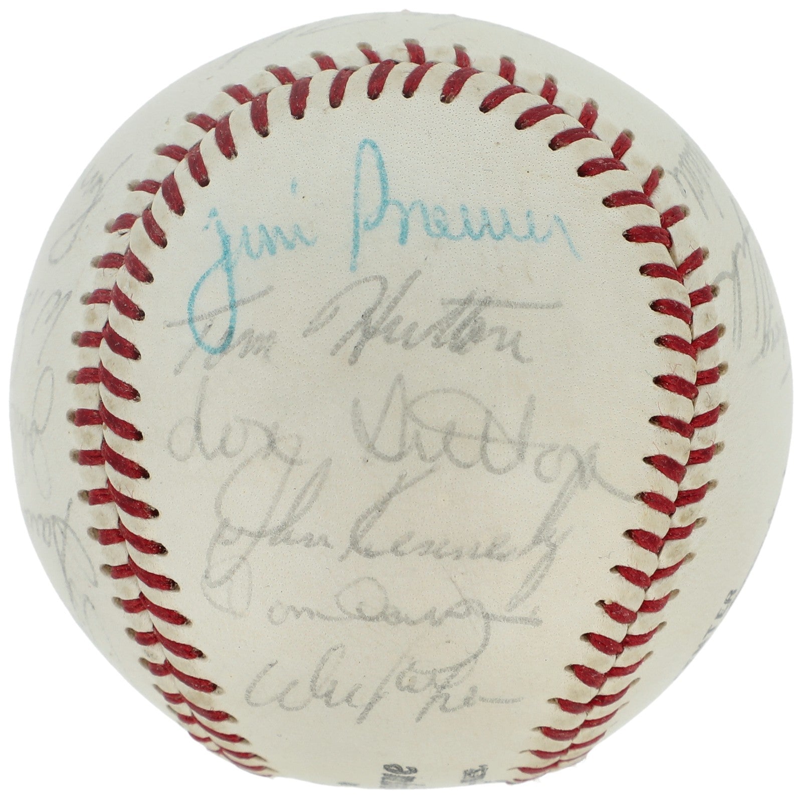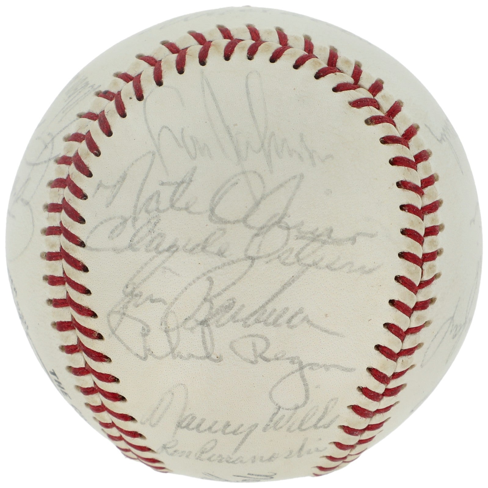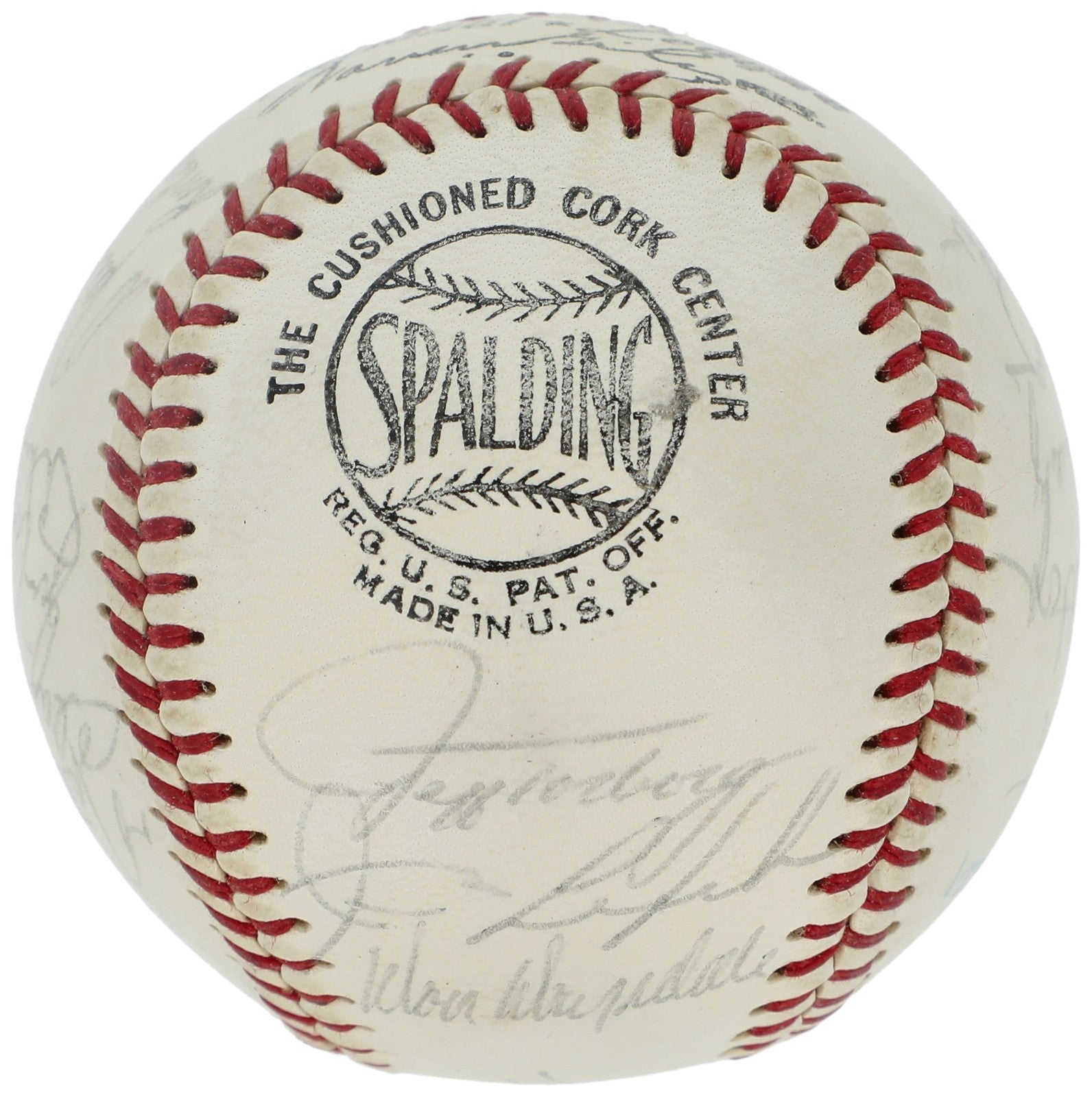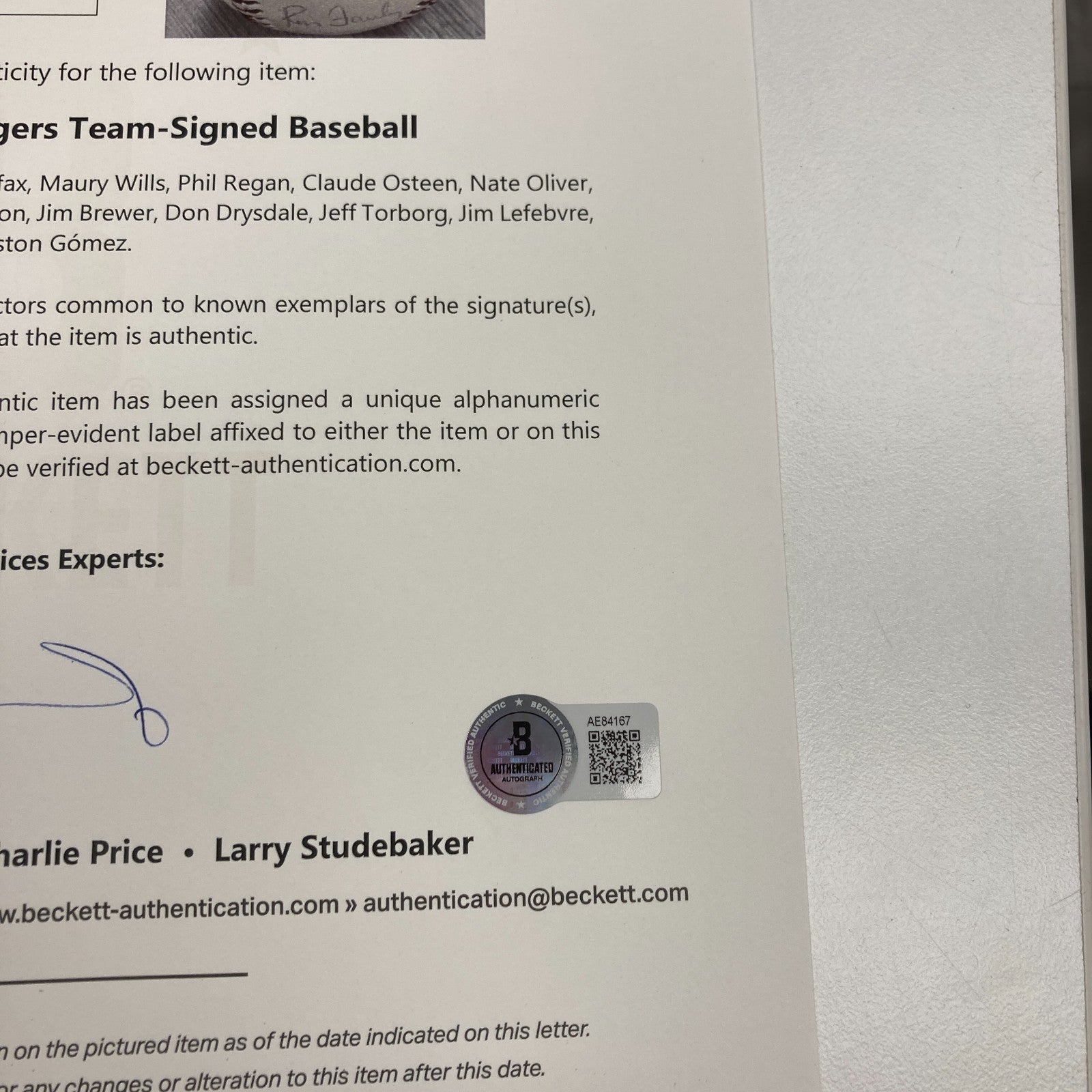 Presented is an Official National League (Giles) baseball signed by members of the 1966 National League Champion Los Angeles Dodgers. 22 Stars and Hall of Famers including Walt Alston, Sandy Koufax, Maury Wills, Phil Regan, Claude Osteen, Nate Oliver, Tommy Davis, John Kennedy, Don Sutton, Tom Hutton, Jim Brewer, Don Drysdale, Jeff Torborg, Jim Lefebvre, Ron Fairly, John Roseboro, Ron Perranoski and Preston Gomez have penned their blue and black signatures across the entirety of the baseball (22 signatures). The off-white baseball displays minor soiling and scuff marks, with black Spalding manufacturer stamps. LOA from Beckett for the signature accompanies.