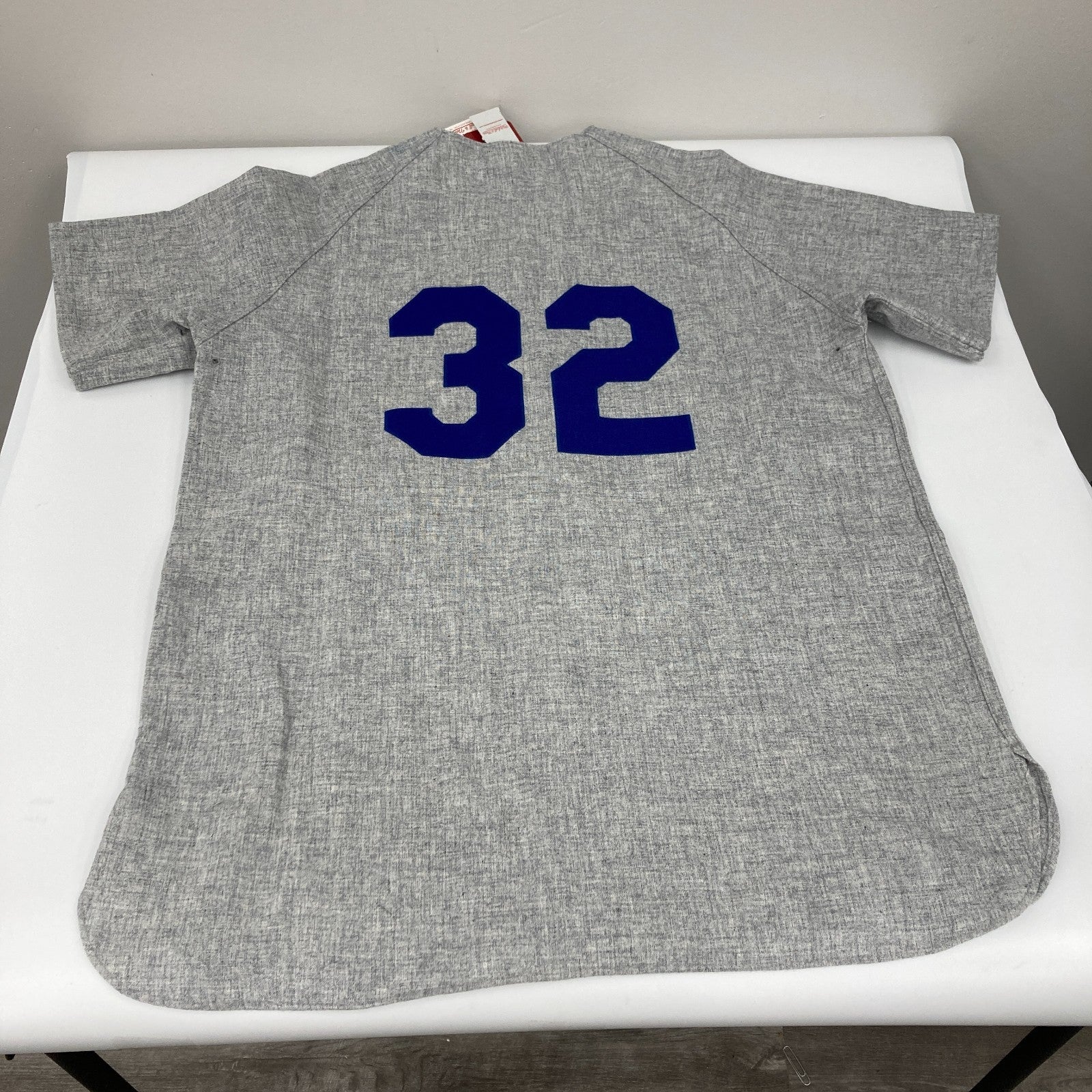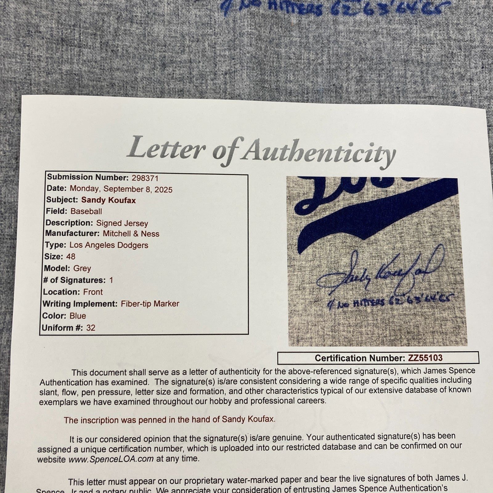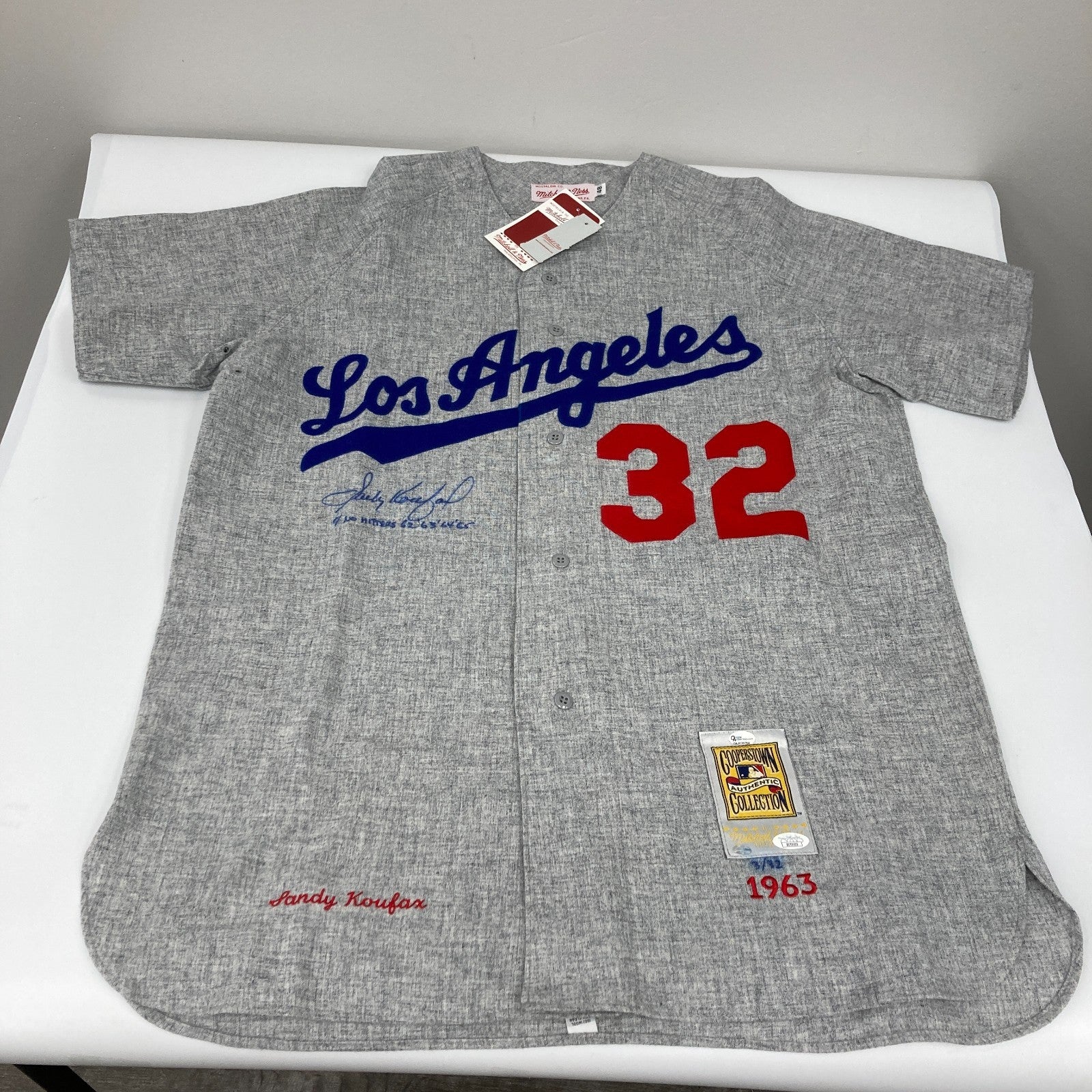 The offered jersey has a Mitchell & Ness manufacturer's tag in the collar, with an adjacent size "48" tag. Across the chest is "Los Angeles" in blue, sewn-on script. Below the team name is "32" in red sewn-on numerals. Five gray buttons run down the front. On the left front outer tail is a Mitchell & Ness Cooperstown Collection manufacturer's tag with an Online Authentic hologram and an Online Authentics sticker: OA-8185259. Three cardstock tags are attached to the collar: Cooperstown Collection; A Mitchell & Ness tag, with a Mitchell & Ness hologram: MN00327262; a Mitchell & Ness price tag and size C48. On the lower left outside tail is a hand printed "3/32" in fine-tip blue marker, signifying the item is limited edition 3-out-of-32. Beneath the limited edition marking is "1963" embroidered in red. On the red outside lower tail is "Sandy Koufax" embroidered in red script. On the inside of the back tail is a tag showing the jersey to be "100% wool." On back is "32" in blue sewn-on numerals. Below the team name on the front, Koufax has signed and inscribed, "4 No Hitters 62, '63, '64, '65," both meticulously in fine tip blue marker. The Koufax signature is a beautiful autograph. The jersey is in very good condition.
