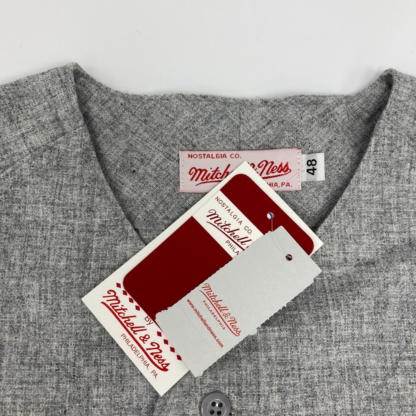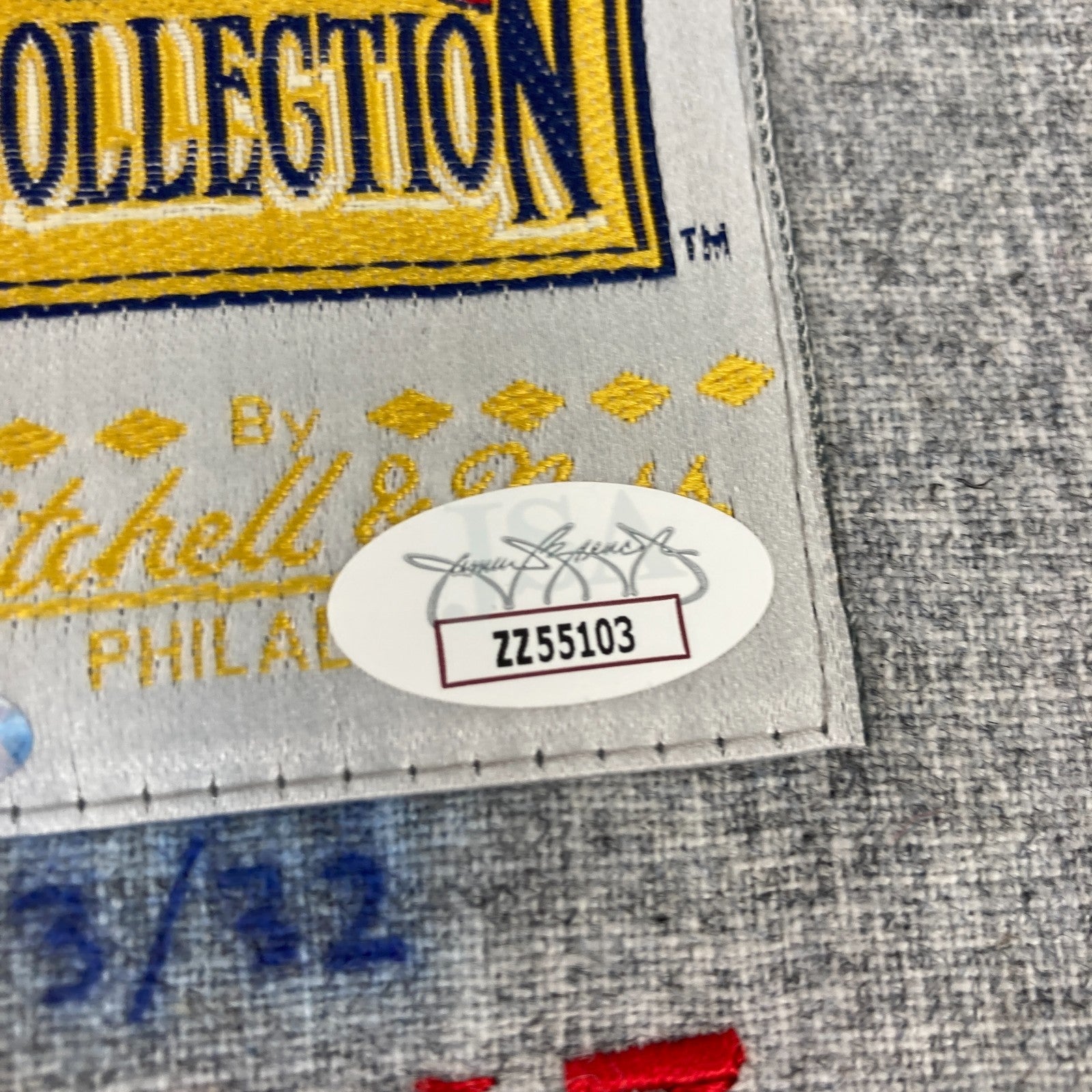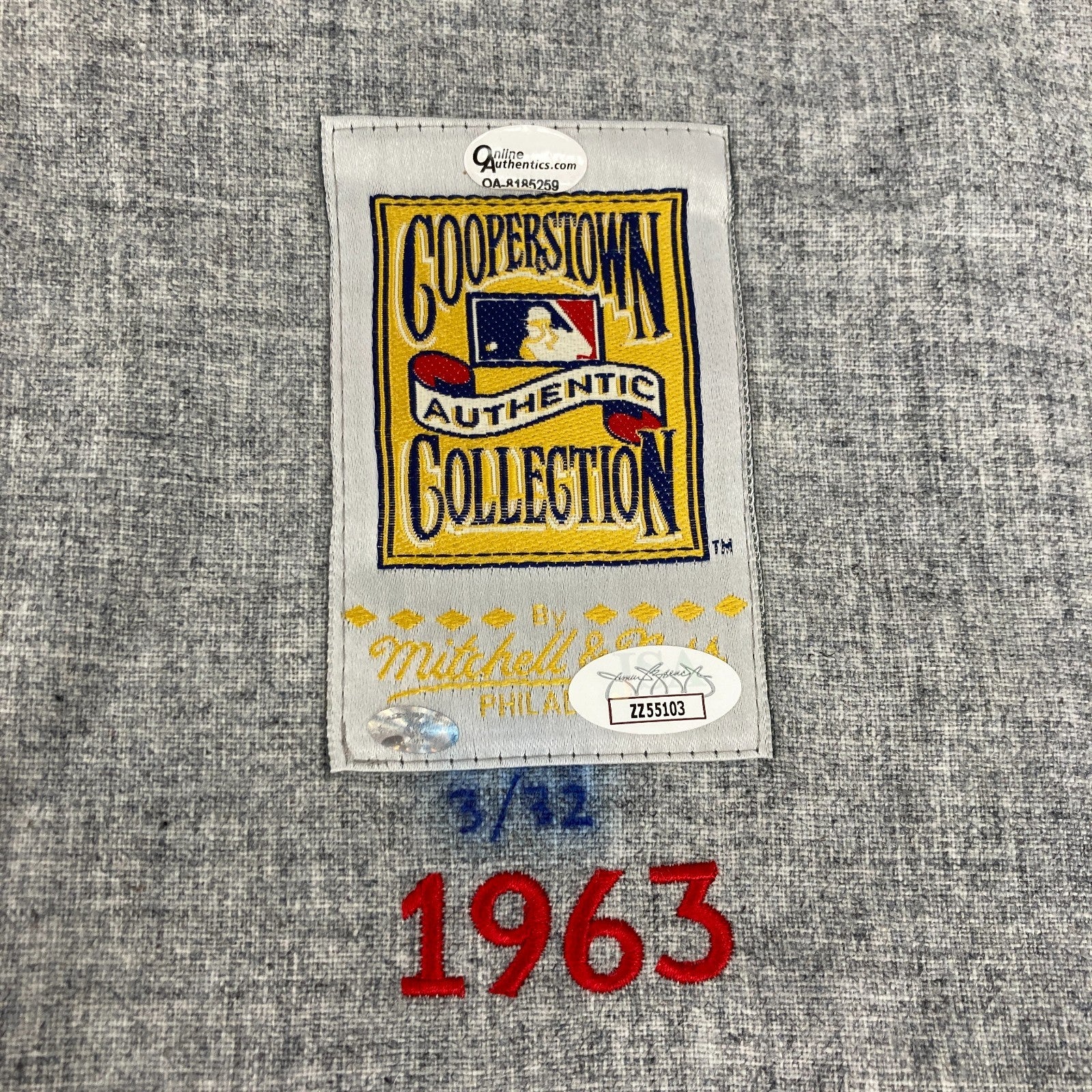 The offered jersey has a Mitchell & Ness manufacturer's tag in the collar, with an adjacent size "48" tag. Across the chest is "Los Angeles" in blue, sewn-on script. Below the team name is "32" in red sewn-on numerals. Five gray buttons run down the front. On the left front outer tail is a Mitchell & Ness Cooperstown Collection manufacturer's tag with an Online Authentic hologram and an Online Authentics sticker: OA-8185259. Three cardstock tags are attached to the collar: Cooperstown Collection; A Mitchell & Ness tag, with a Mitchell & Ness hologram: MN00327262; a Mitchell & Ness price tag and size C48. On the lower left outside tail is a hand printed "3/32" in fine-tip blue marker, signifying the item is limited edition 3-out-of-32. Beneath the limited edition marking is "1963" embroidered in red. On the red outside lower tail is "Sandy Koufax" embroidered in red script. On the inside of the back tail is a tag showing the jersey to be "100% wool." On back is "32" in blue sewn-on numerals. Below the team name on the front, Koufax has signed and inscribed, "4 No Hitters 62, '63, '64, '65," both meticulously in fine tip blue marker. The Koufax signature is a beautiful autograph. The jersey is in very good condition.