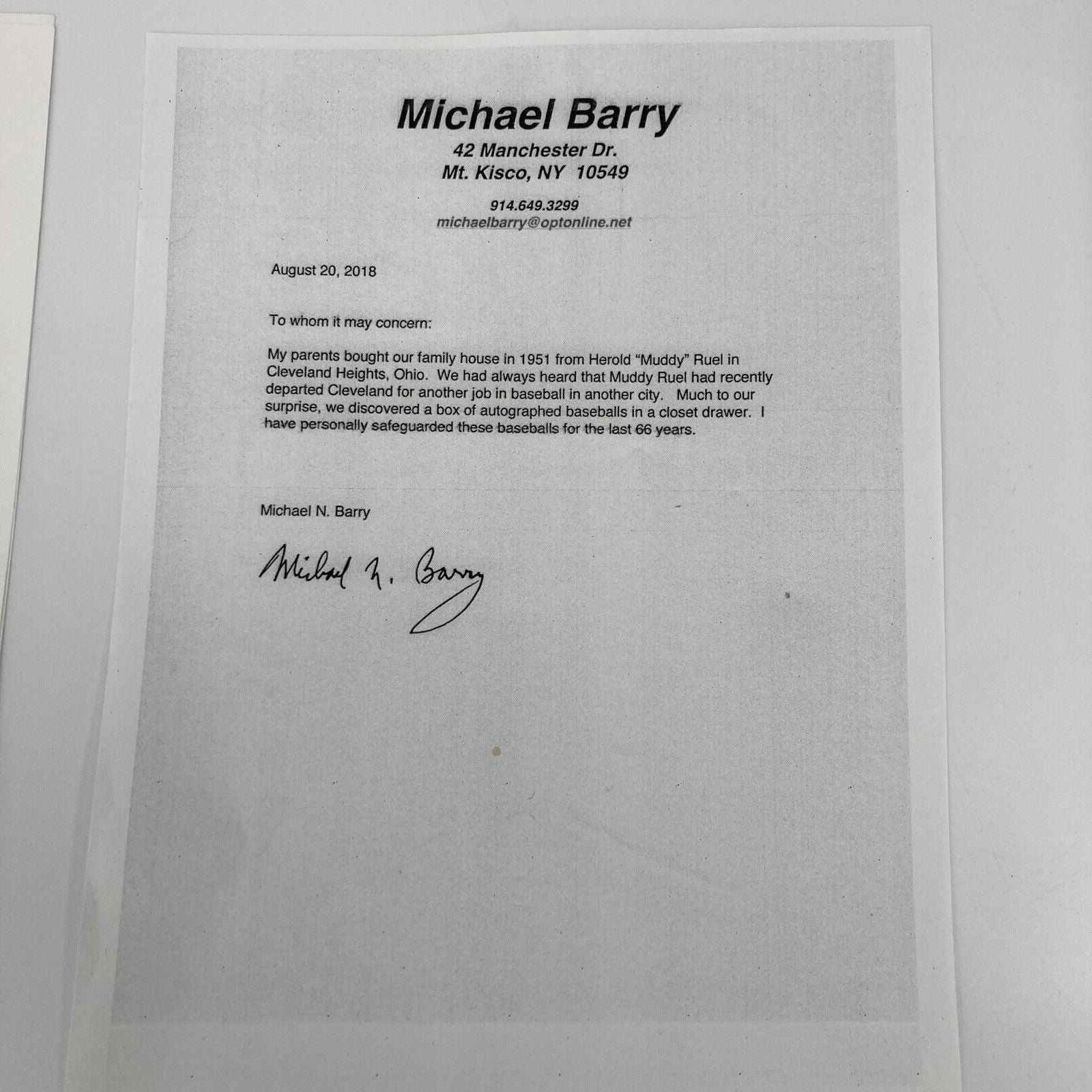 The ball was originally part of the personal collection of Muddy Ruel and a letter of provenance (copy only) from the ball's previous owner attends. Letter of provenance from Michael Barry (copy).