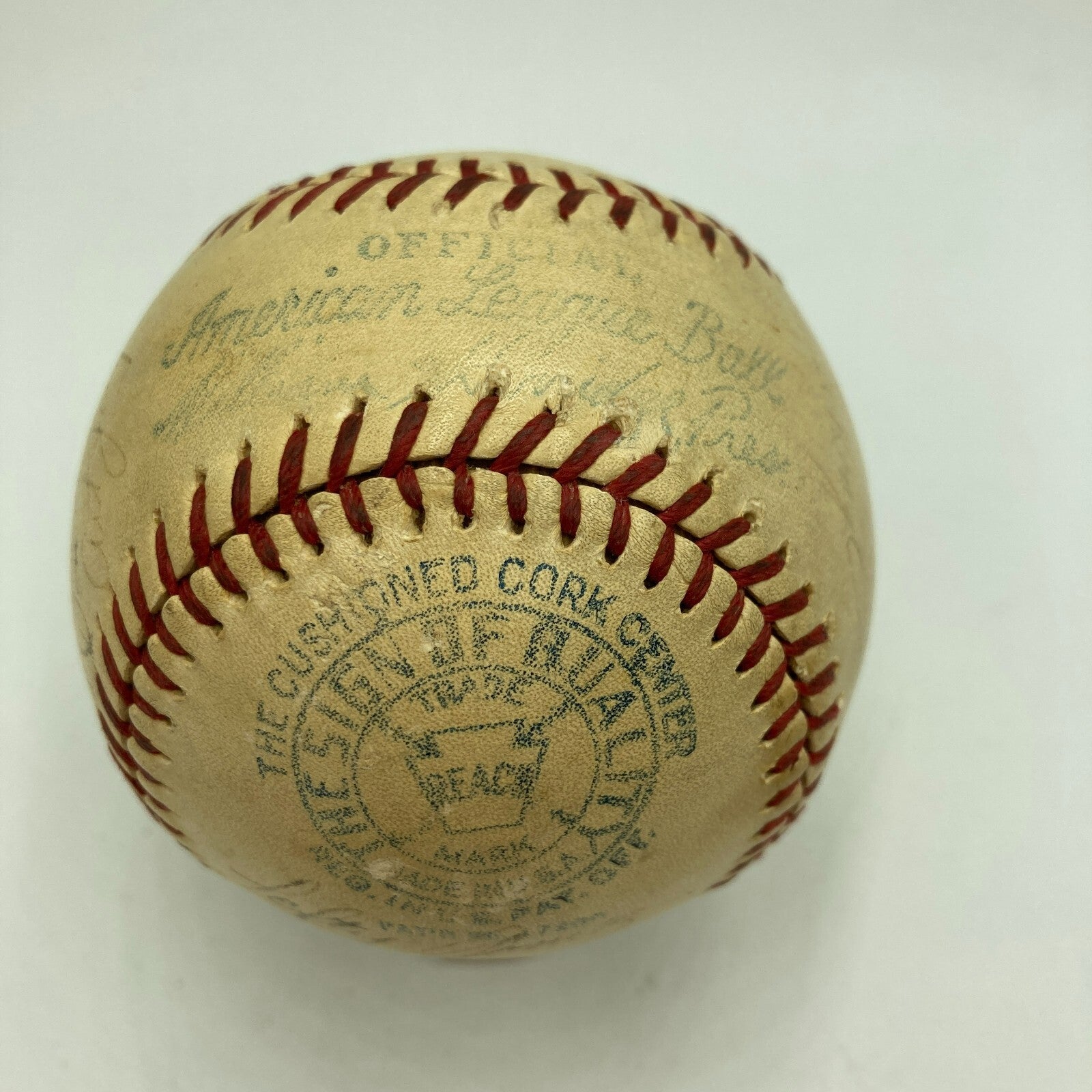 1937 New York Yankees team signed baseball - World Series Champions. Reach W.Harridge Official American League baseball has been signed by (23) with Lou Gehrig appearing across the sweetspot and Joe DiMaggio positioned just to the right making this an ideal example for display. Others include Tony Lazzeri, Bill Dickey, Red Ruffing, Frank Crosetti, George Selkirk, Tom Henrich, Red Rolfe, Joe Glenn, and others. Lefty Gomez and Pat Malone are clubhouse. All are done in period fountain pen.