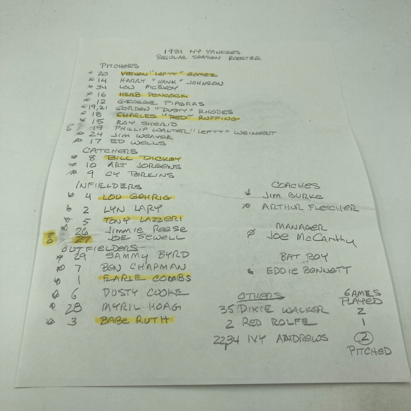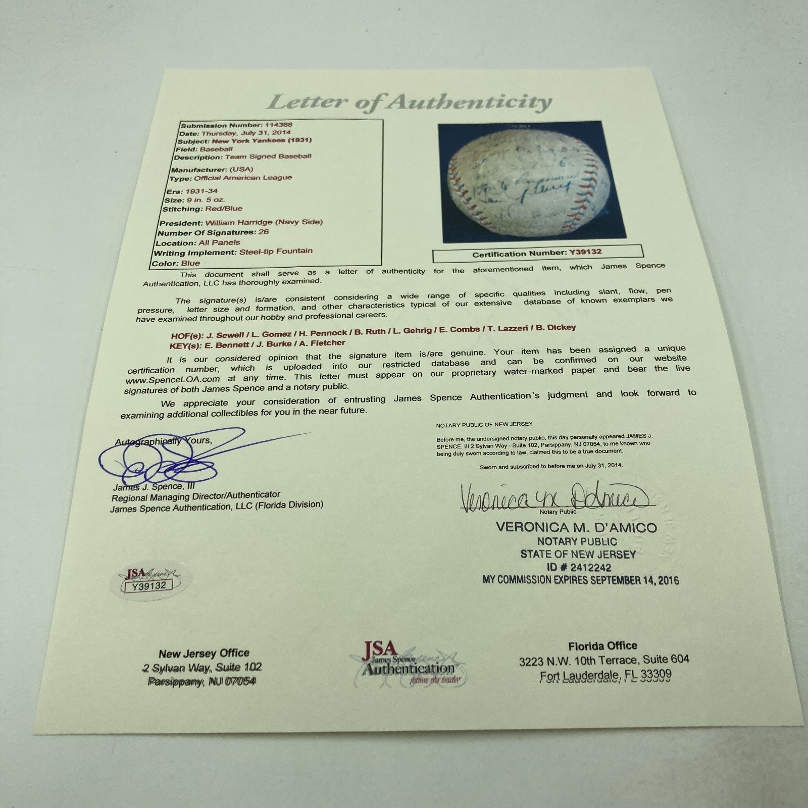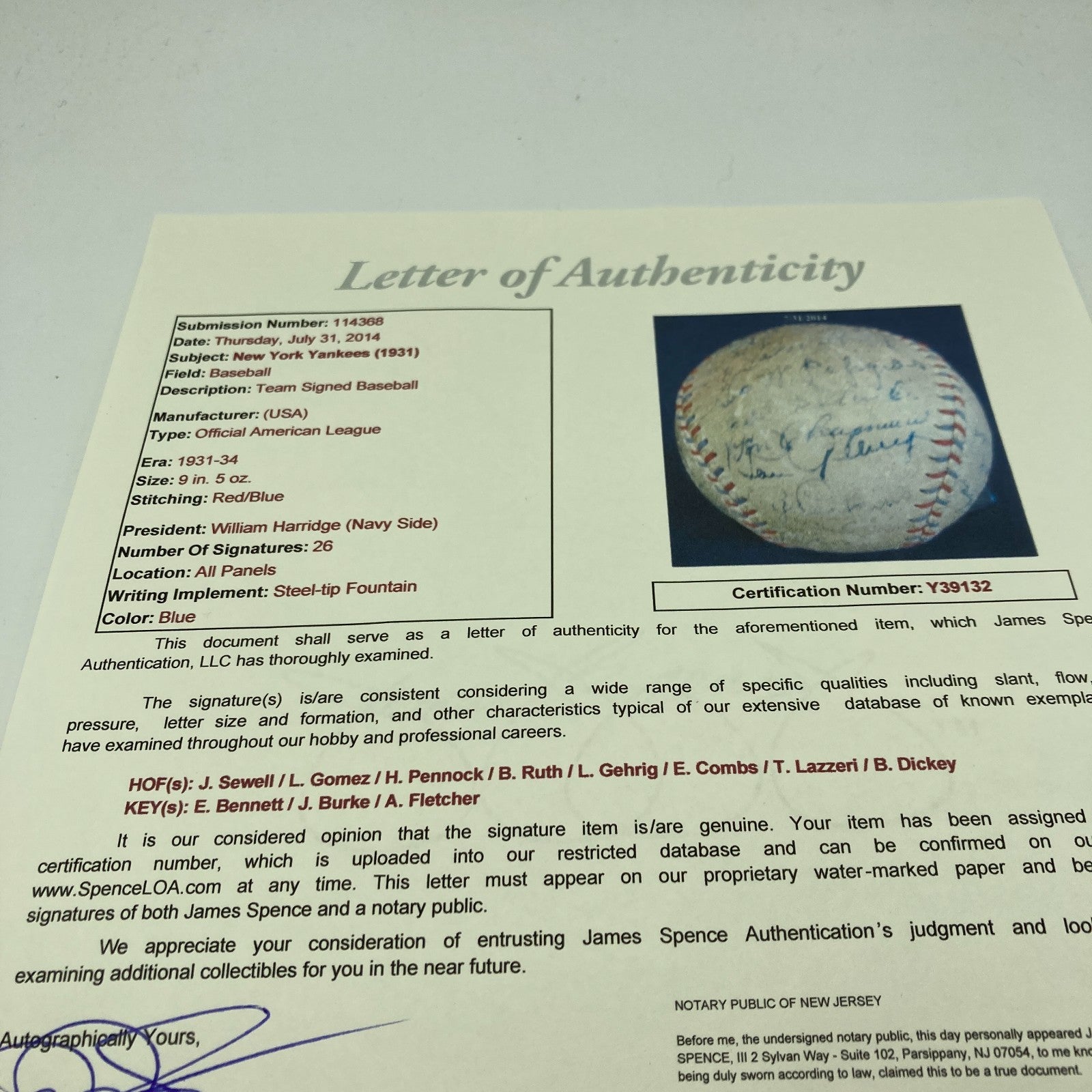 1931 New York Yankees team signed baseball.