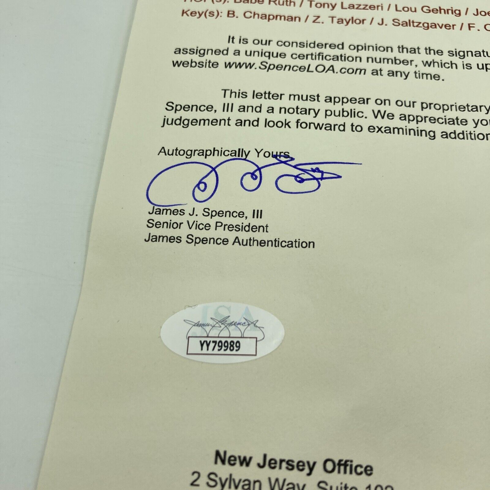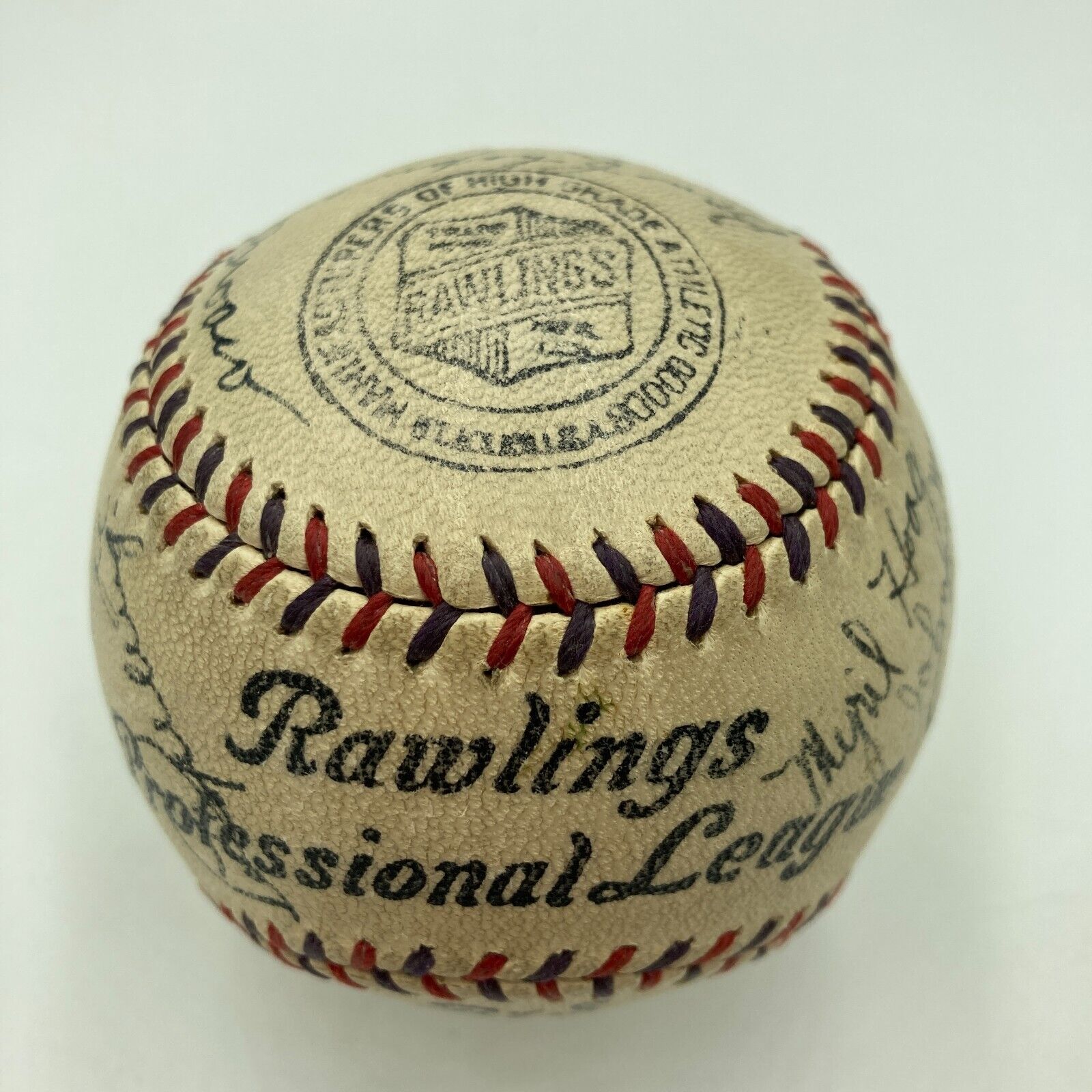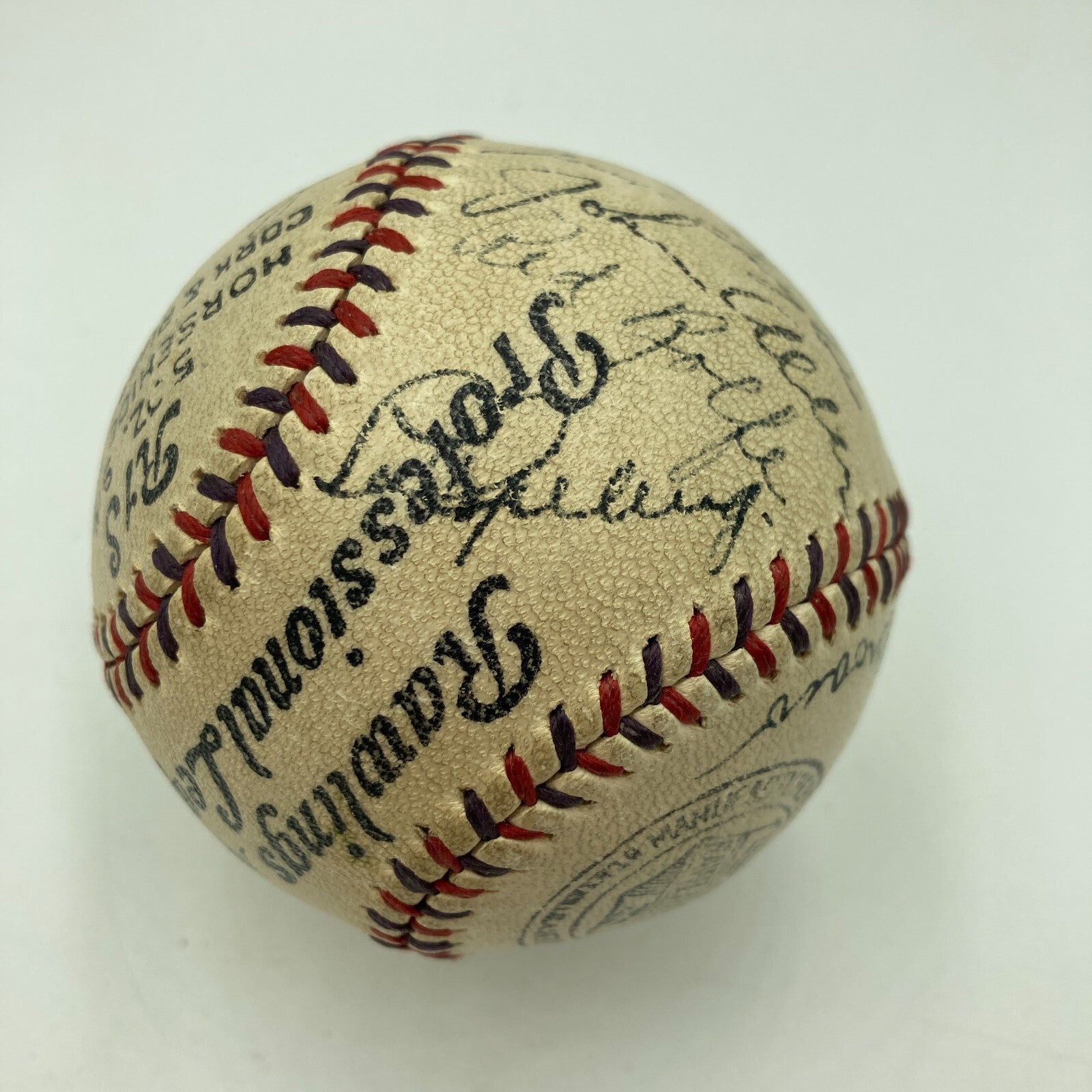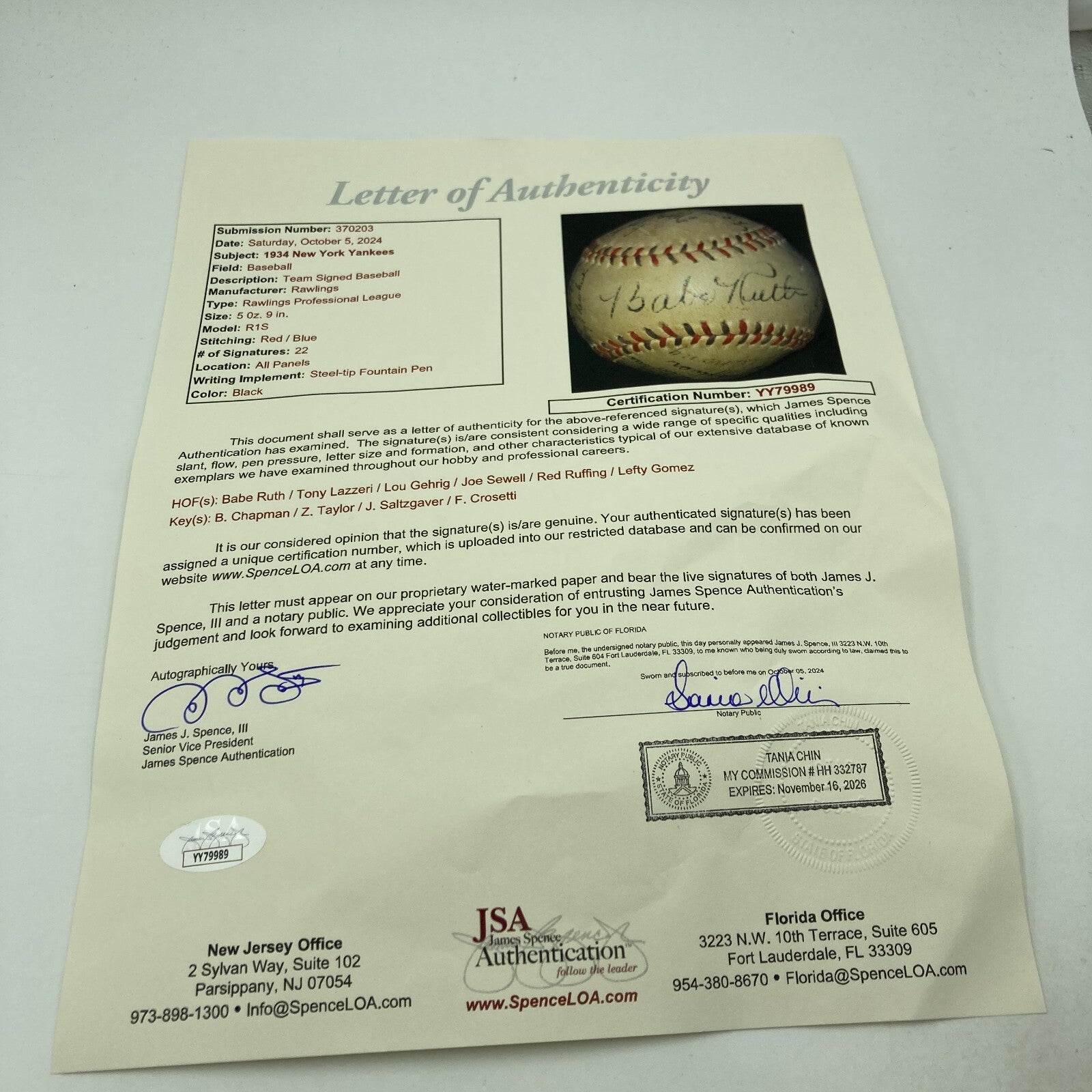 Beautiful Rawlings Baseball ball signed in black fountain pen by the following twenty-two members of the 1934 New York Yankees: Babe Ruth, Lou Gehrig, Tony Lazzeri, Sewell, Ruffing, Gomez, Broaca, Chapman, Van Atta, Heffner, Newkirk, Byrd, Jorgens, MacFayden, Crosetti, Taylor, Allen, Rolfe, Hoag, Murphy, Saltzgaver, and Deshong. Signatures average 7/10. Excellent to Mint condition. Although the Yankees failed to win the pennant in 1934, it was still a memorable year for the Bronx Bombers. Gehrig finally emerged from Ruth's shadow by winning the Triple Crown with league-leading totals in home runs (49), RBI (166), and batting average (.363). However, even more important was the fact that unbeknownst to all at the time, the season marked Babe Ruth's last season in pinstripes. This is an exceptional New York Yankees team ball featuring one of the last signatures of Babe Ruth as a member of the Yankees. Full LOA from JSA.