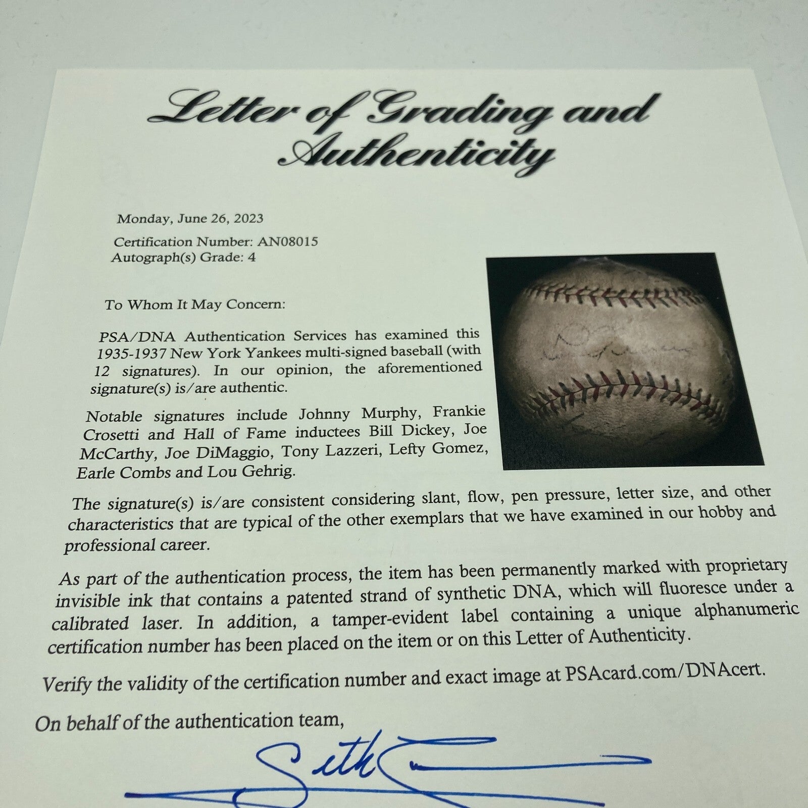 Signatures include Hall of Famers Lou Gehrig (a desirable sweet spot scripting), Bill Dickey, Joe McCarthy, Joe DiMaggio, Tony Lazzeri, Lefty Gomez, and Earle Combs, as well as Johnny Murphy and Frankie Crosetti. LOA from PSA DNA accompanies.