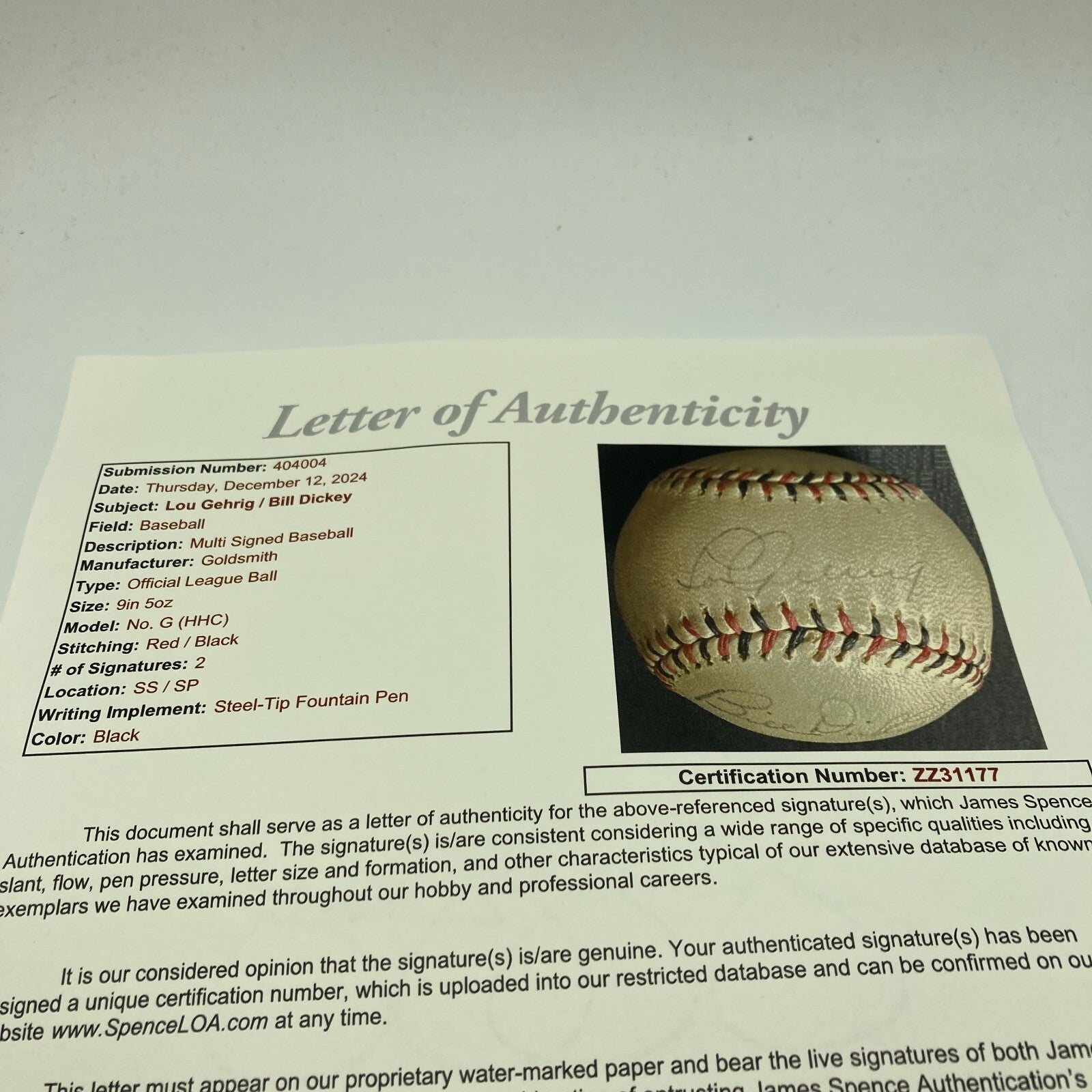 Goldsmith "Official League" baseball signed in black ink by New York Yankees Hall of Famers Lou Gehrig and Bill Dickey in 1938. Gehrig has signed across the sweet spot and Dickey has penned his name on the panel directly below. The date "April 1, 1938" is noted on a side panel. Excellent condition overall. Full LOA from James Spence/JSA.