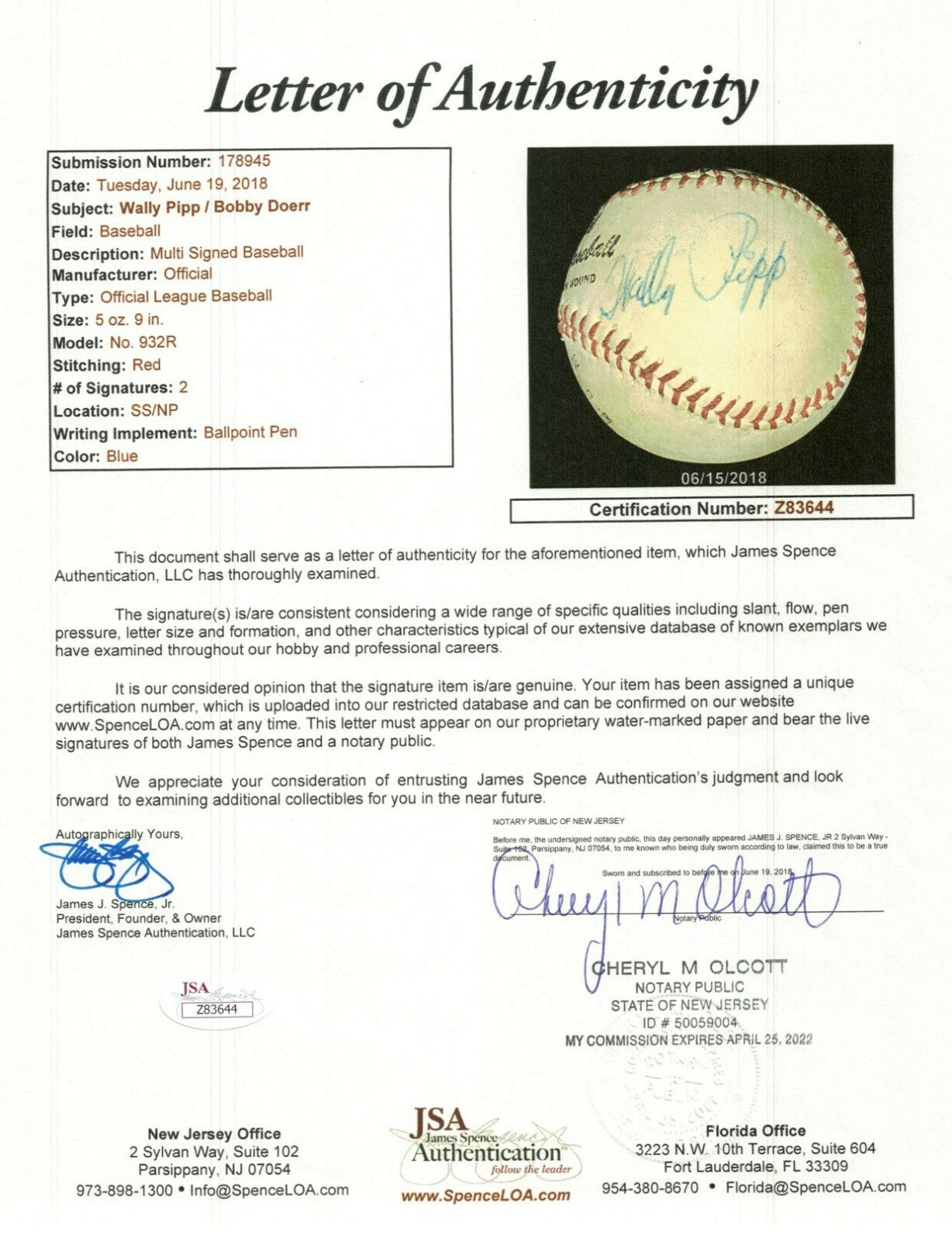 Suffering the most famous headache in baseball history, Wally Pipp (d.1965) was replaced in the New York Yankees lineup on 6/2/25 by Lou Gehrig, who famously didn't miss a game for the next fourteen seasons, causing the Yankees to put Pipp on waivers. A fairly productive hitter throughout his lengthy career, Pipp is joined in the signing of the offered Official League Baseball by Hall of Famer Bobby Doerr, who has signed on the sweet spot. Full photo LOA from JSA. One of only a few Wally Pipp signed baseballs known to exist.
