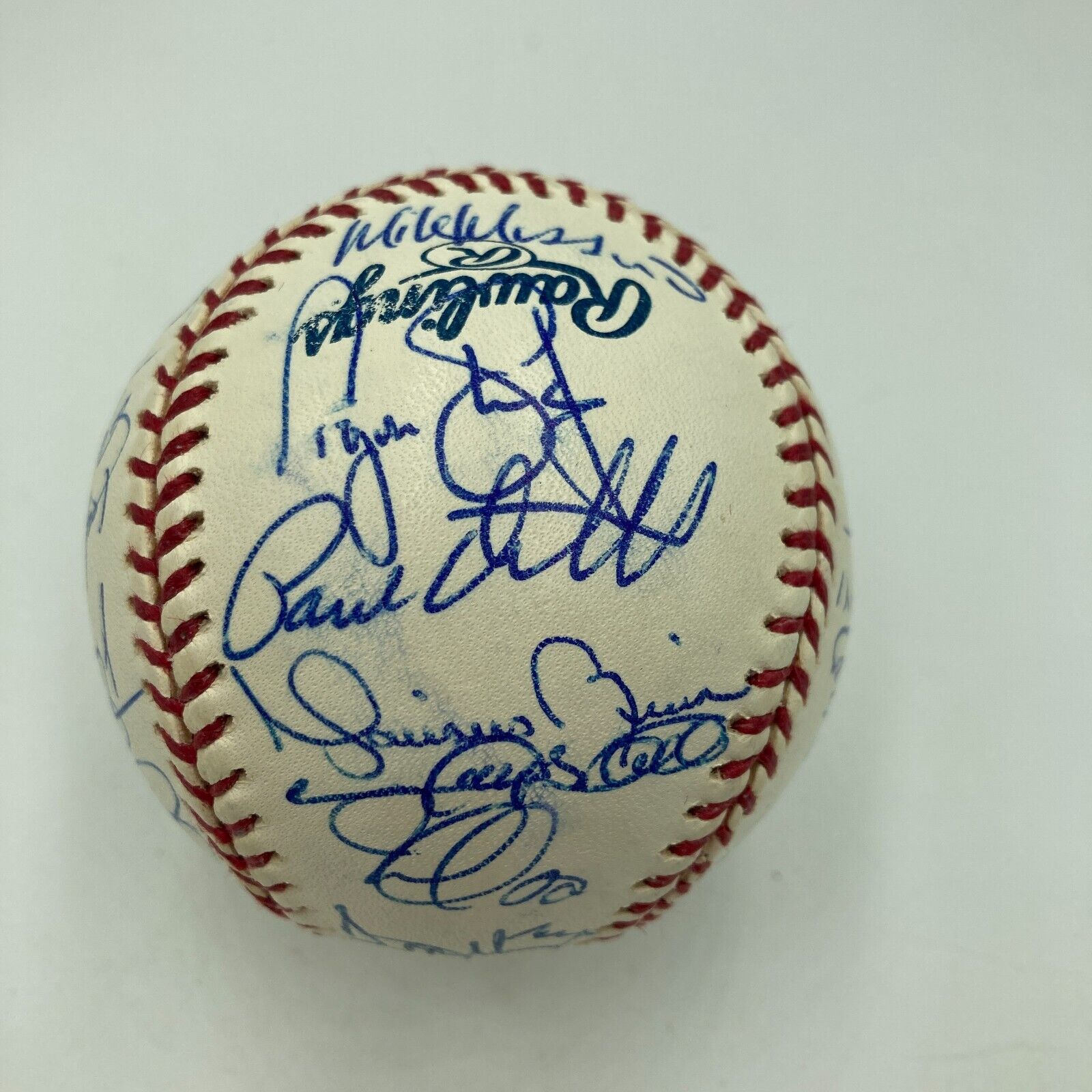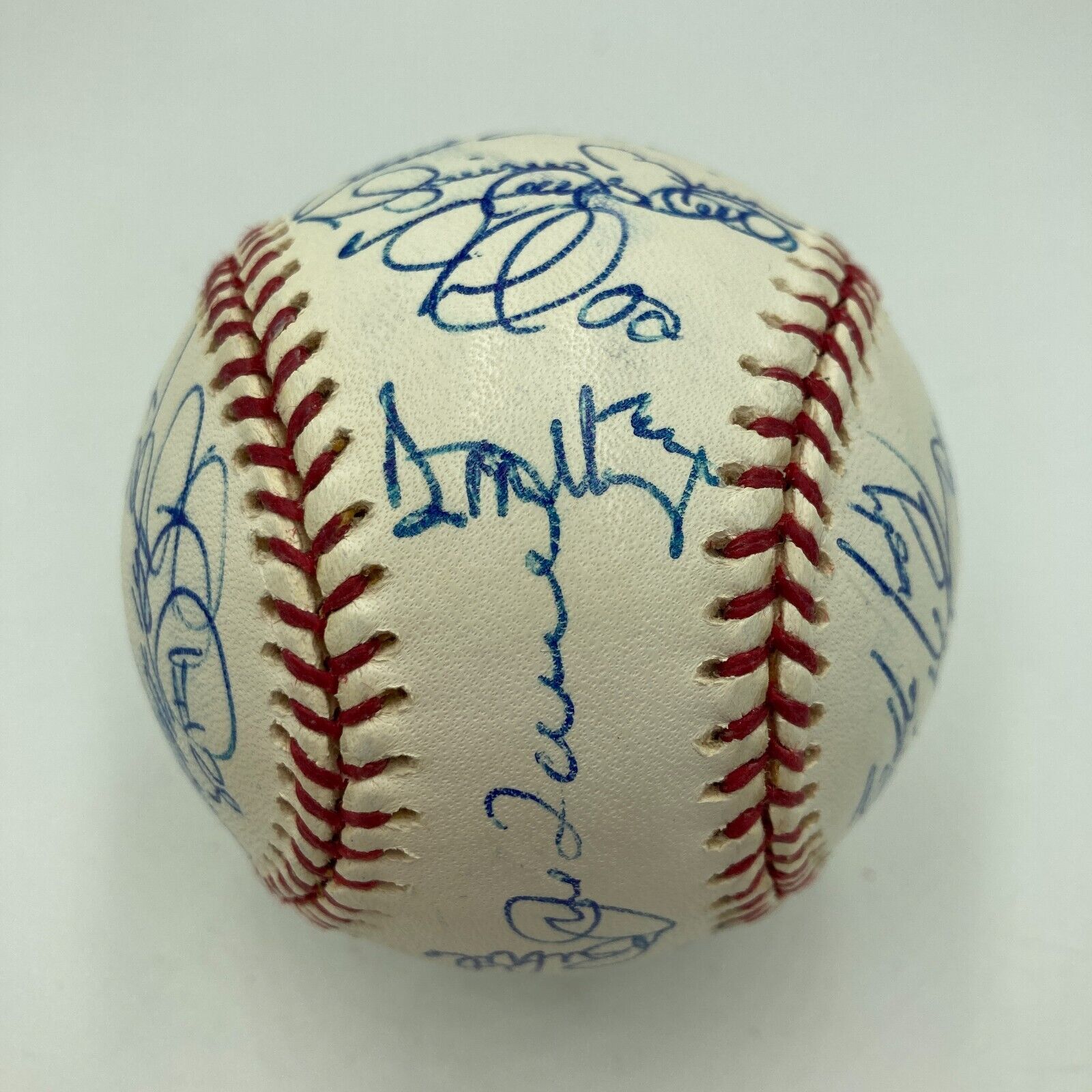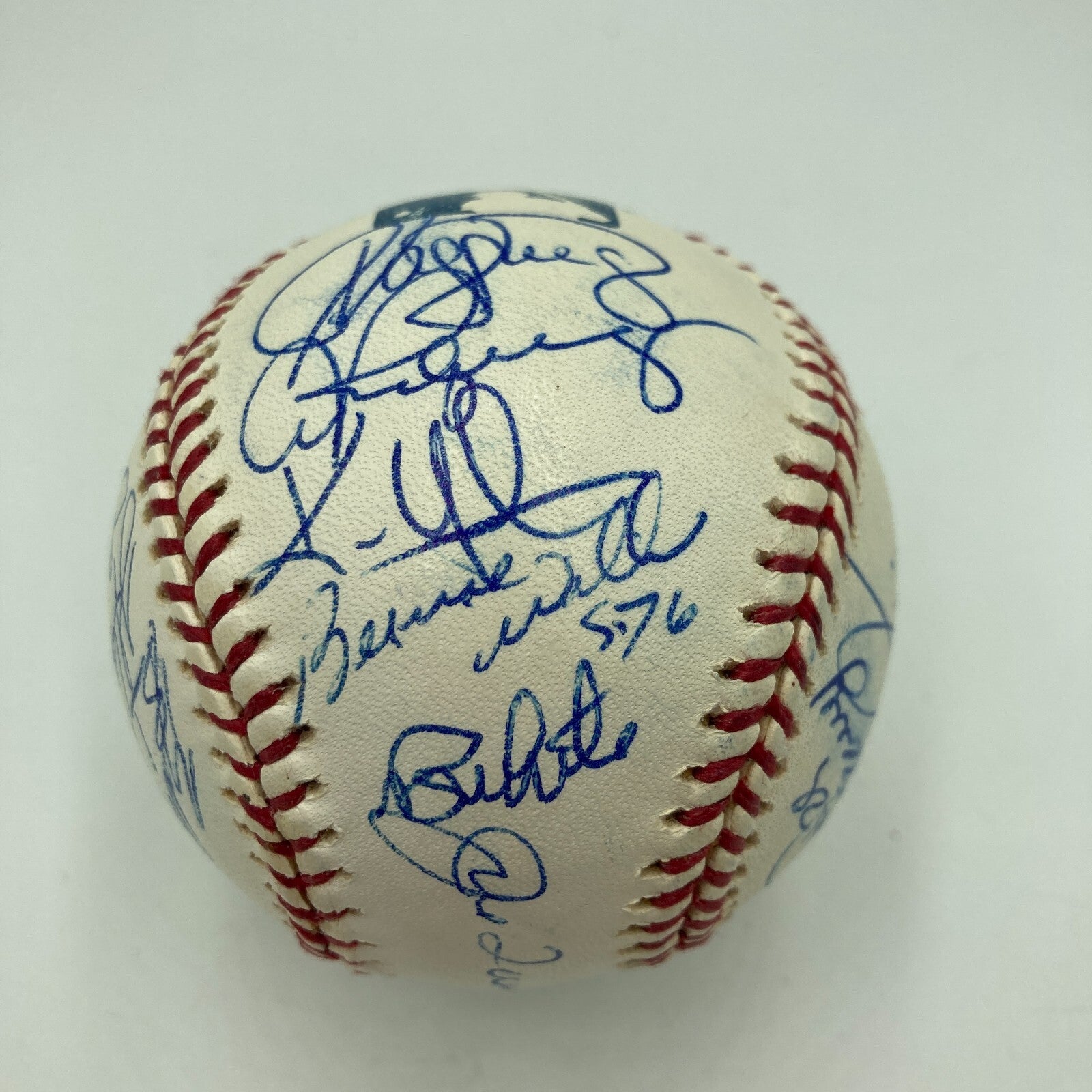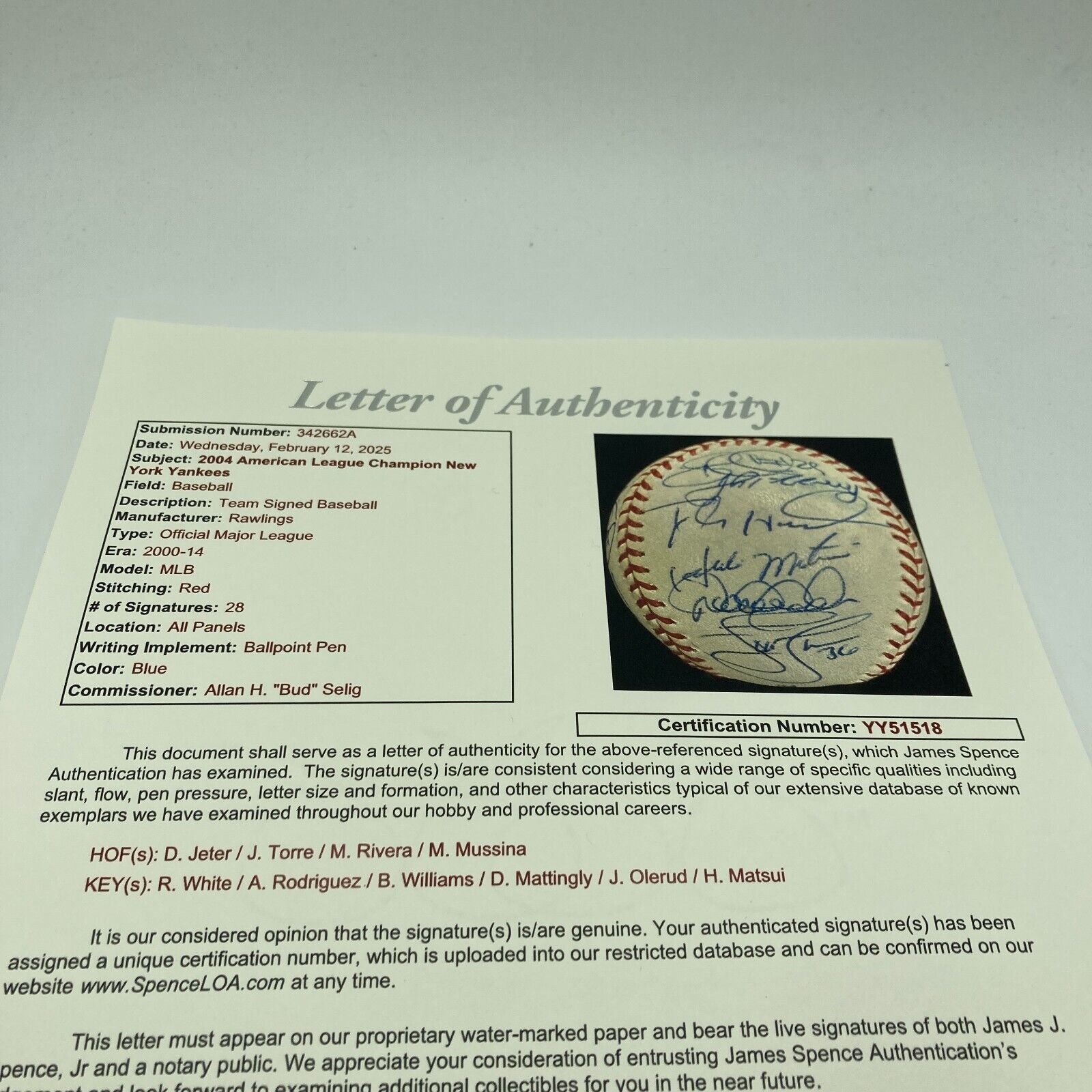 An Official Major League Baseball (Selig) signed by members of the 2003 team that made the World Series. Signatures on the ball include: Hideki Matsui, Don Mattingly, Mike Mussina, Derek Jeter, Bernie Williams, Alex Rodriguez, Mariano Rivera, Joe Torre, Willie Randolph, and Paul O'Neill. The 2003 Yankees would win 101 games during the regular season and defeat the Minnesota Twins and the Boston Red Sox in the playoffs before falling to the Miami Marlins in the World Series.