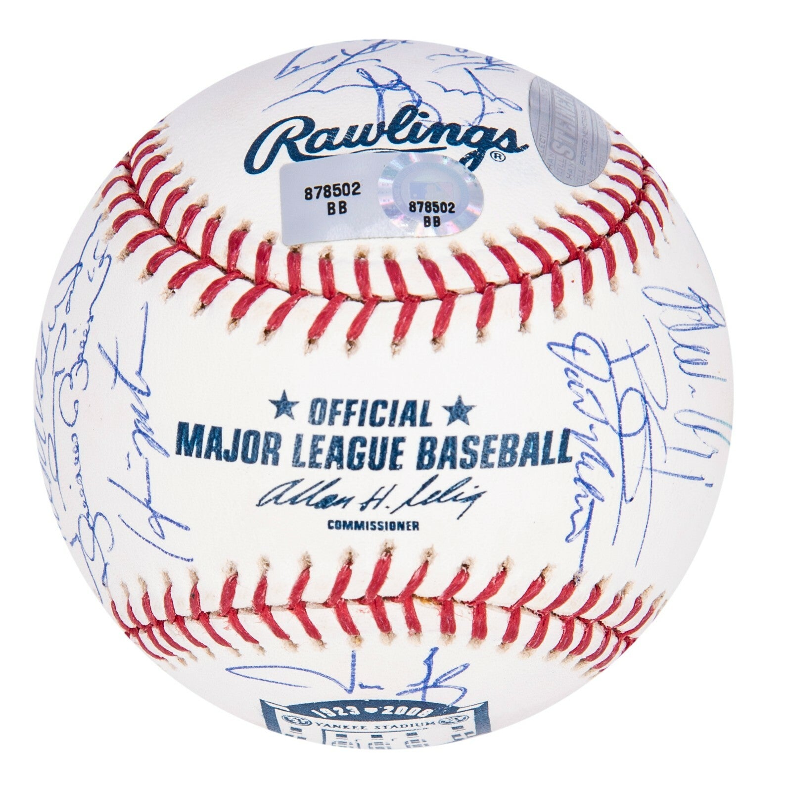 Presented here is an Official Major League Allan H. Selig baseball that has been signed by 29 members of the 2008 New York Yankees. Manager Joe Girardi and Alex Rodriguez's signatures grace the sweet spot. Other signatures include Hall of Famers Mariano Rivera, Derek Jeter and Mike Mussina, along with Jason Giambi, Phillip Hughes, Kevin Long, Rob Thompson, Shelley Duncan, Wilson Betemit, Tony Pena, Jose Molina, Bobby Mechum, Ian Kennedy, Andy Pettitte, Ross Ohlendorf, Johnny Damon, Darrell Rasner, and several others. All signatures have been signed in blue ink and a Yankee Stadium Final Season logo is stamped on this baseball. This ball comes with an MLB Authenticated hologram (BB878502) and a COA from Steiner Sports for the signatures.