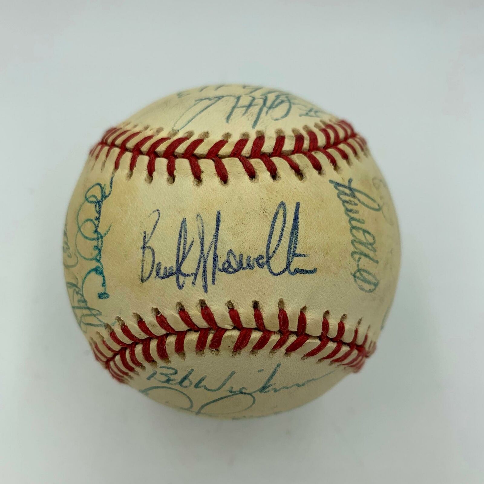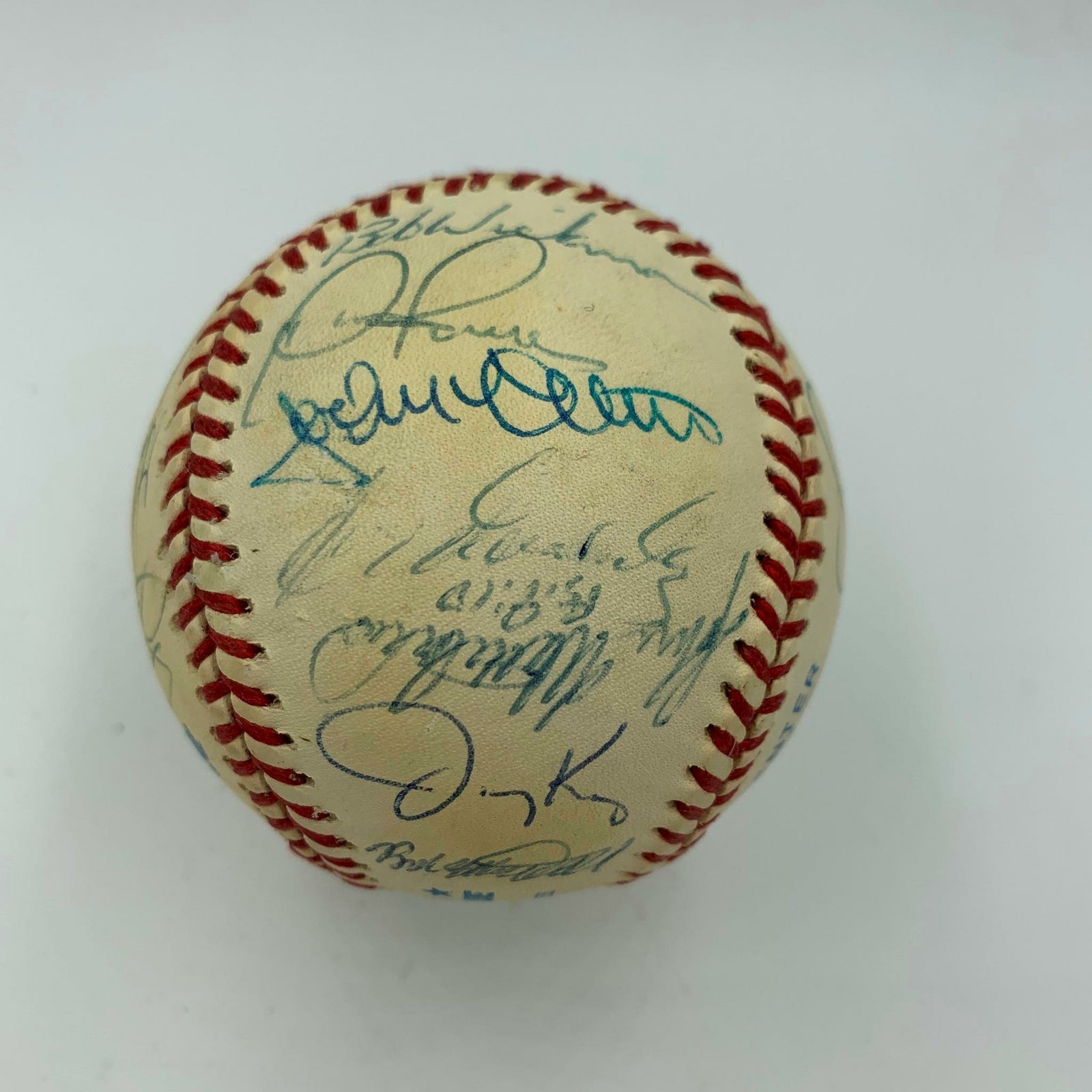 1995 Yankees team signed baseball. The team had a 79-65 season record, finished second in the American League East and lost in the Division Series to the Seattle Mariners. 26 signatures: Derek Jeter (rookie), Mariano Rivera (rookie), Don Mattingly, Wade Boggs, Paul O'Neill, Bernie Williams, Strawberry, Showalter (ss), Key, Stanley, Leyritz, Cone and more. Jeter and Rivera are two of the Yankees "Core Four" players (the other being Jorge Posada and Andy Pettitte), who came up through the Yankees system, made their MLB debuts in 1995, and won four World Series for the Yankees in five years in the late 1990s.