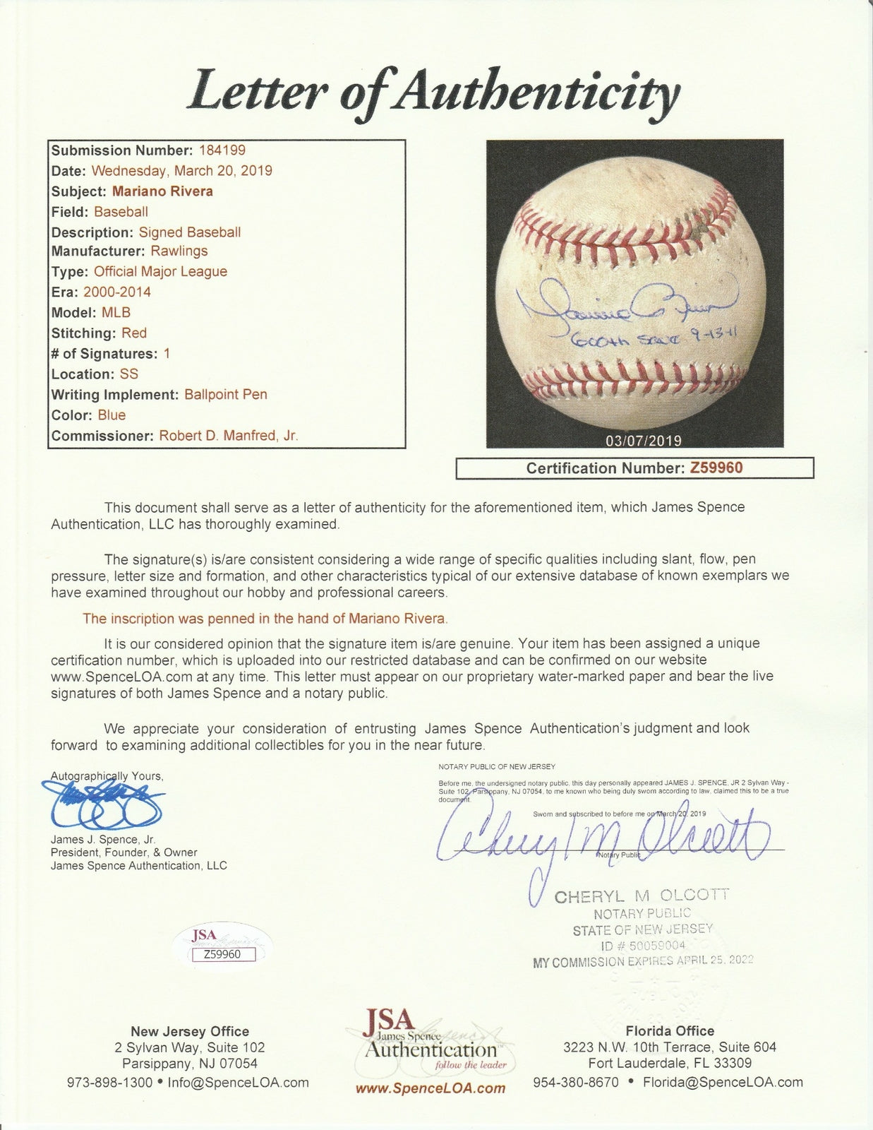 Historic Mariano Rivera 600th Save Signed Game Used Baseball JSA COA & MLB Auth