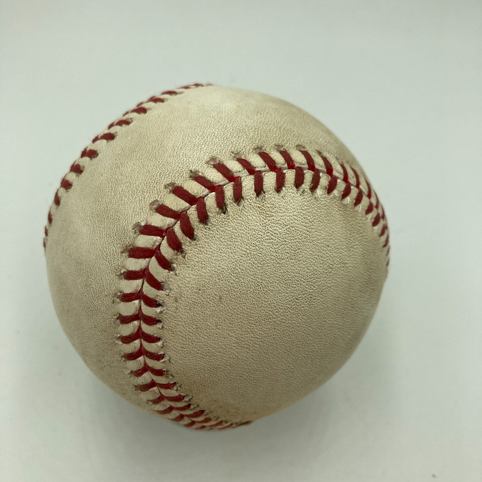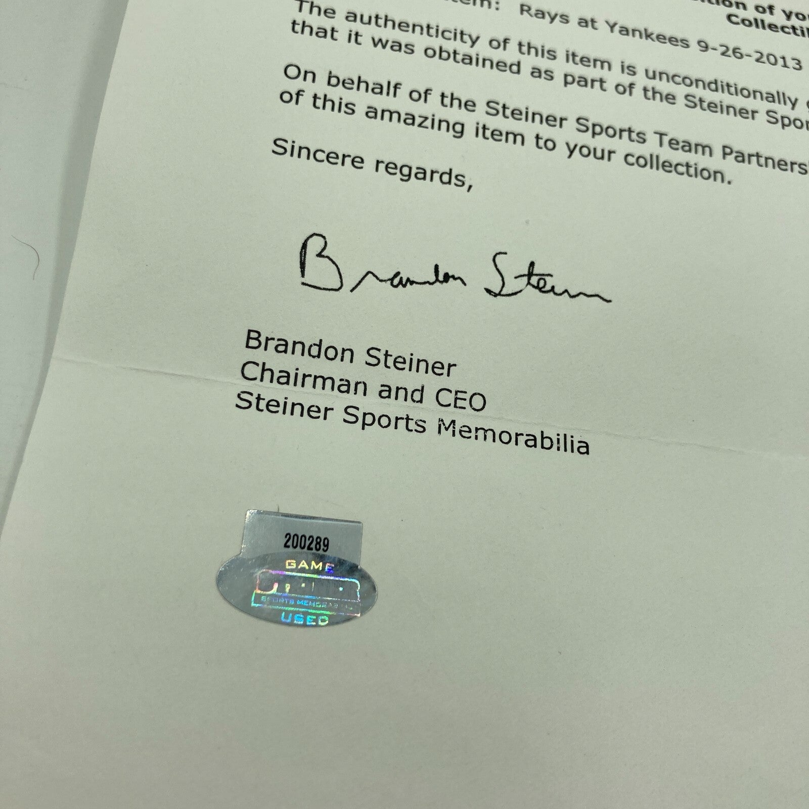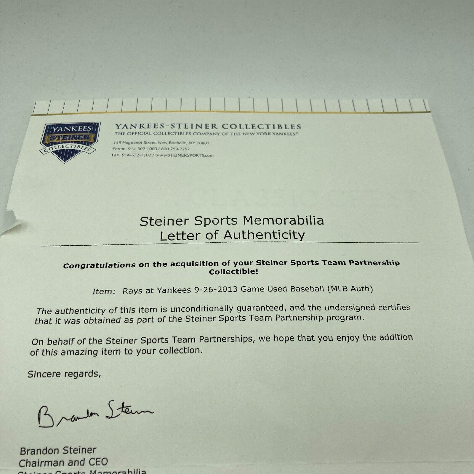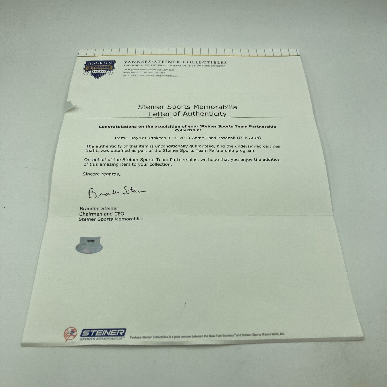 This baseball was used during Mariano Rivera's final game on Sept. 26, 2013 vs. Tampa, and is signed on the side panel in blue ballpoint pen. Rivera added "Final Season in Pinstripes, Exit Sandman 9/26/13" under his signature and the ball is hand-numbered 11/24. The ball includes Steiner Game-Used, MLB and Steiner holograms affixed near the label.
