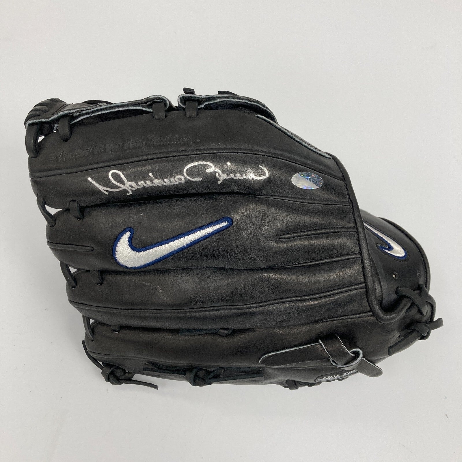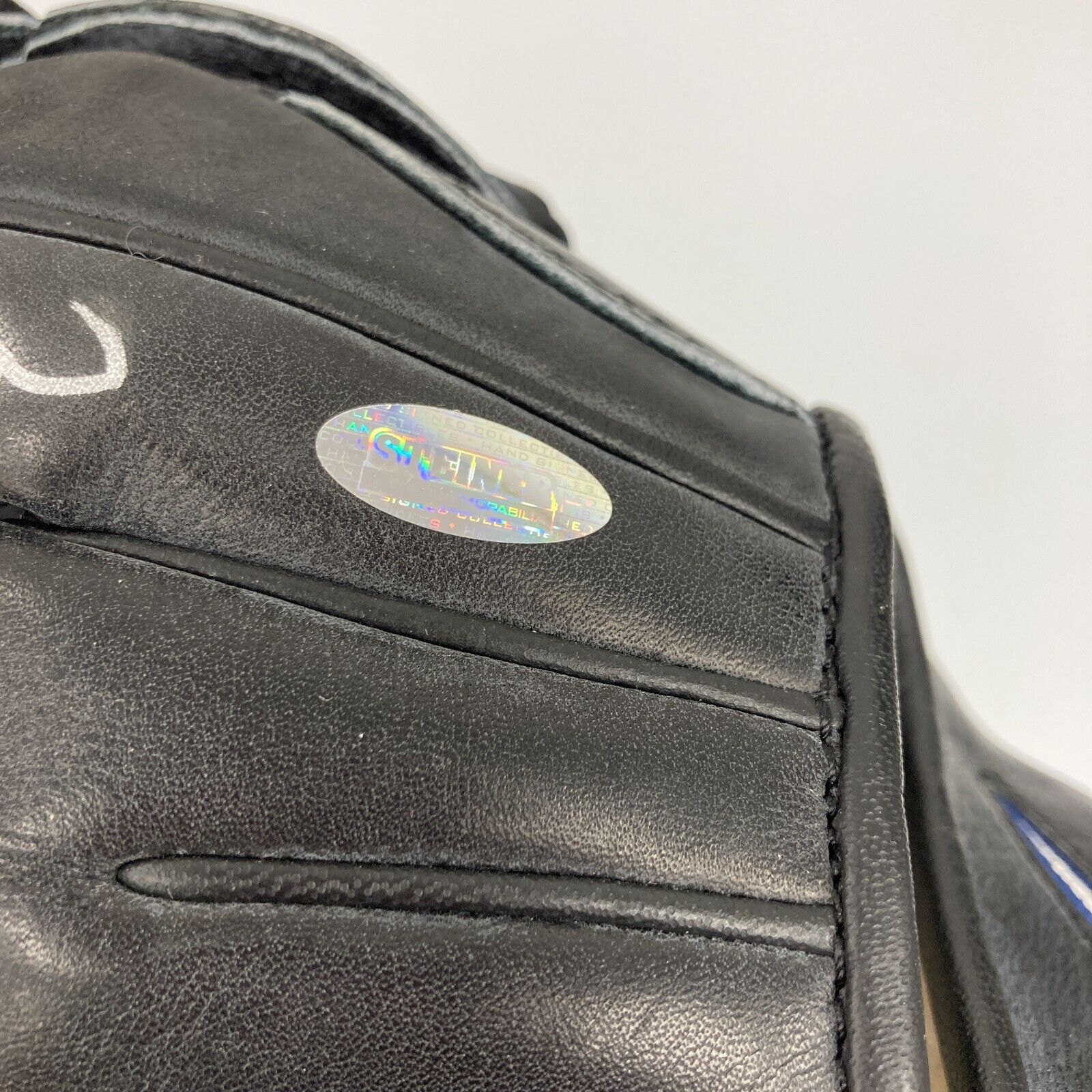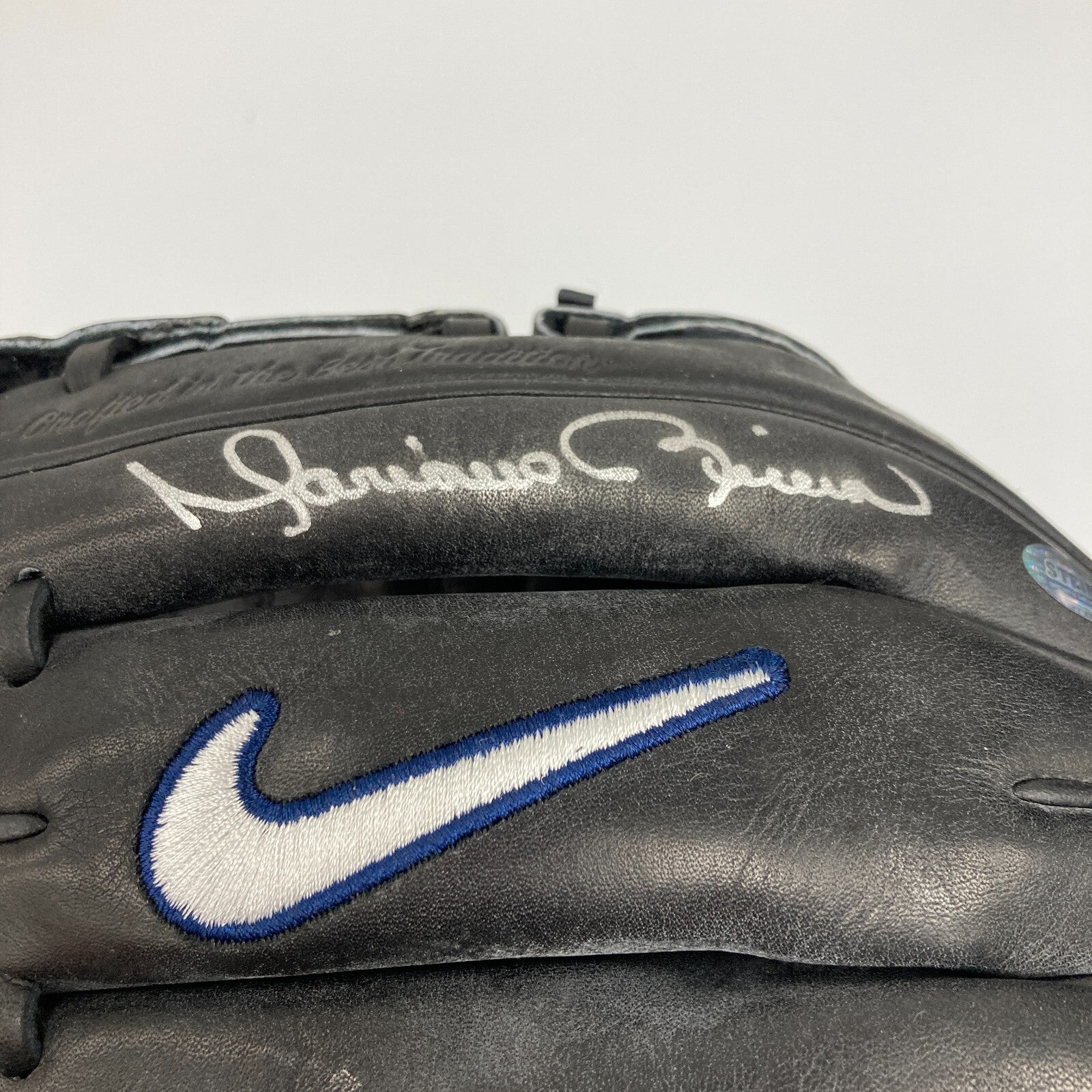 black leather Nike glove displays "Mariano Rivera," "Phil 4:13," "42" and Swoosh in white embroidery. Signed on the outside of the index finger sleeve in perfect silver sharpie. Steiner holographic sticker affixed.