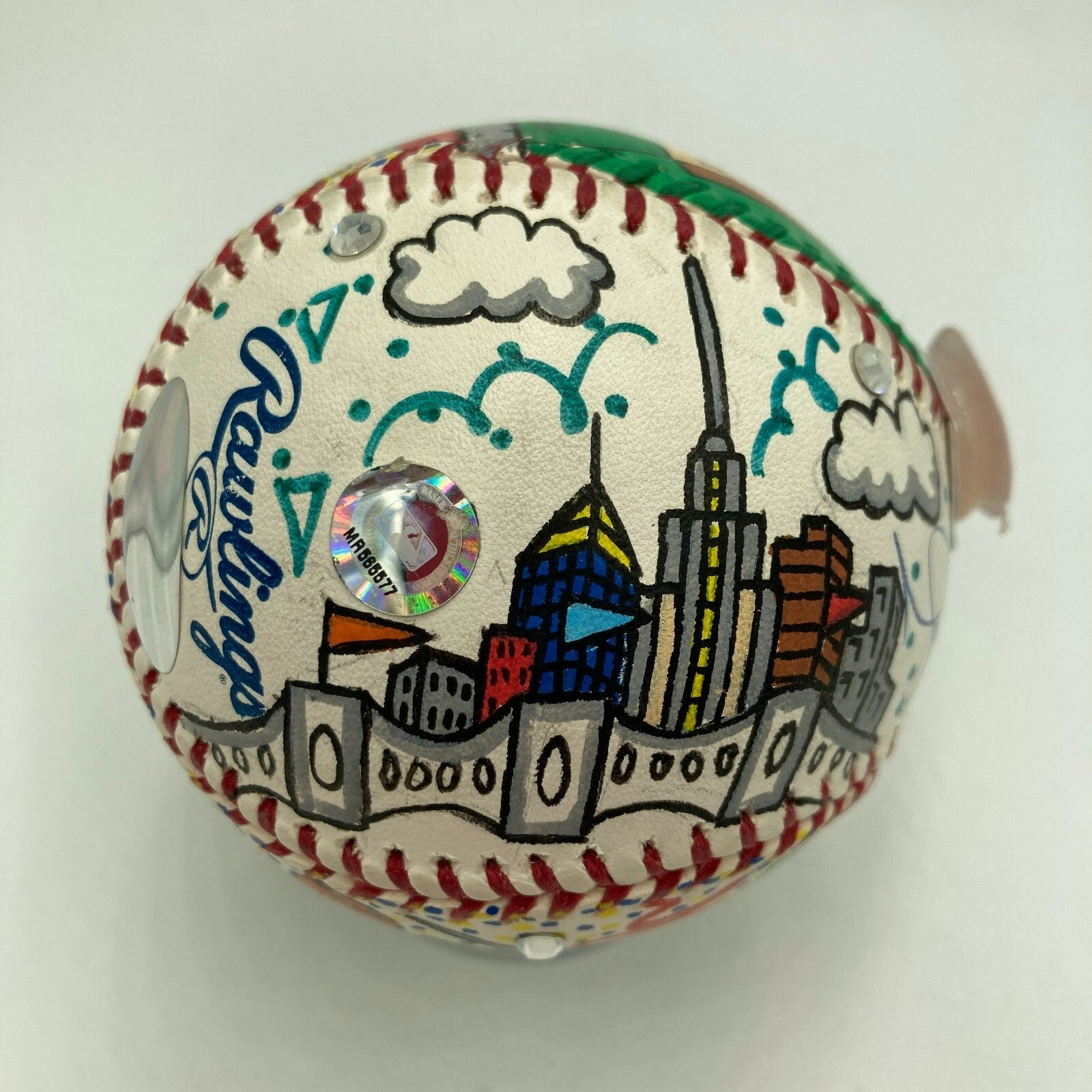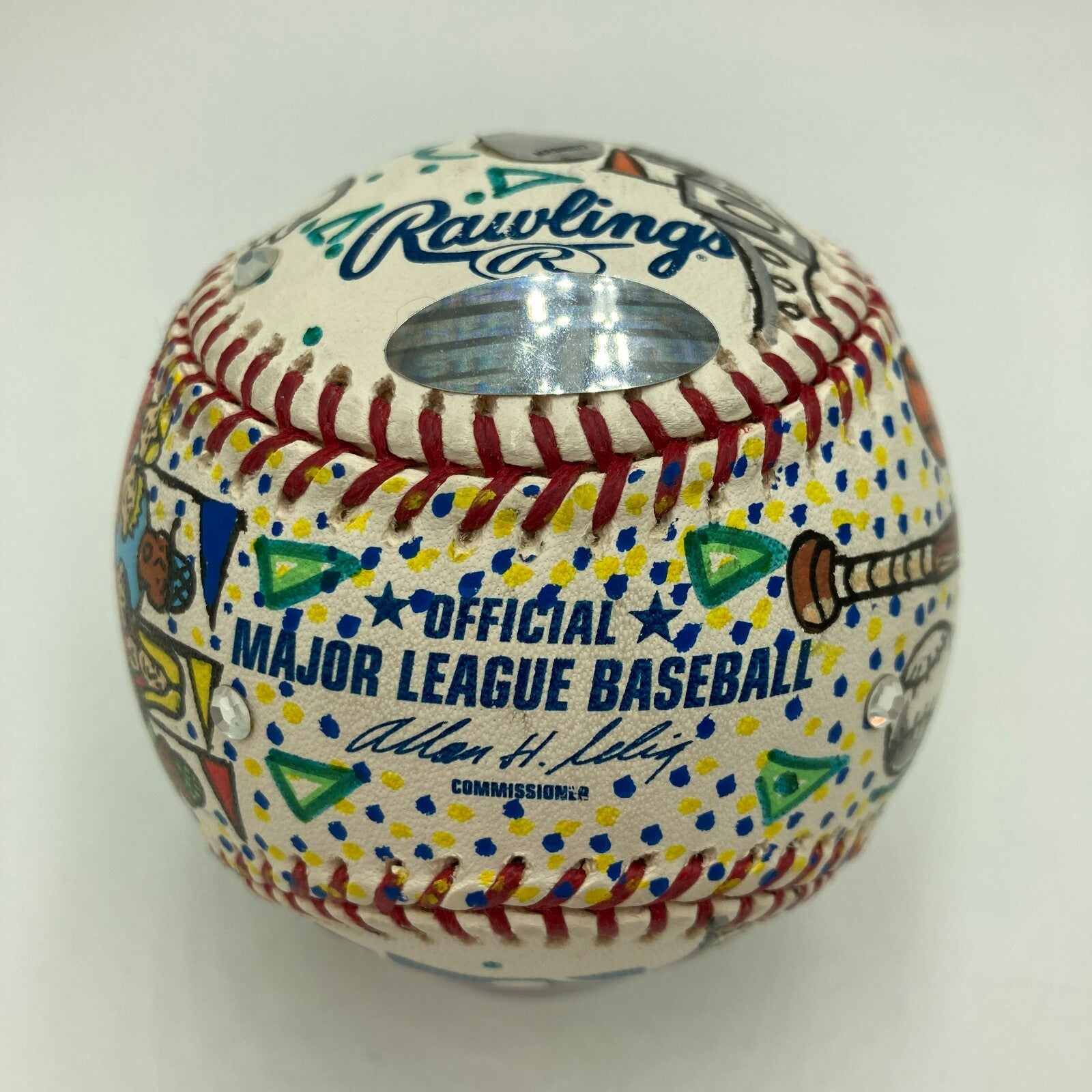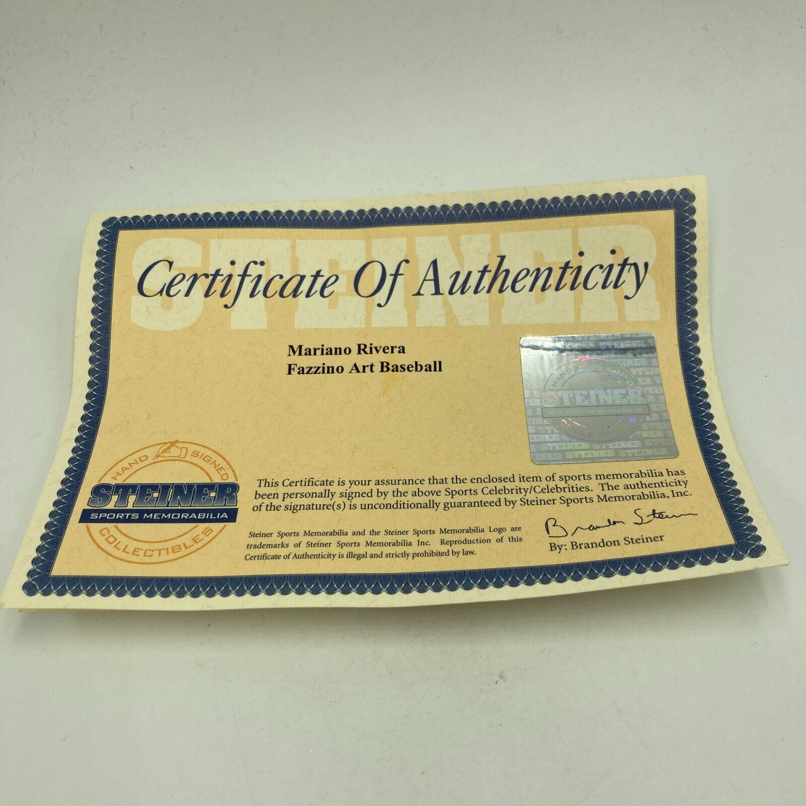 Mariano Rivera autographed Charles Fazzino hand painted artwork baseball. Rawlings B.Selig OML ball has been signed "Mariano Rivera" across the sweetspot. It has been hand painted and decorated throughout by noted artist Charles Fazzino in his inimitable pop art style. A number of Swarovski crystals are attached. Includes COA from Steiner Sports and their authentication hologram is affixed