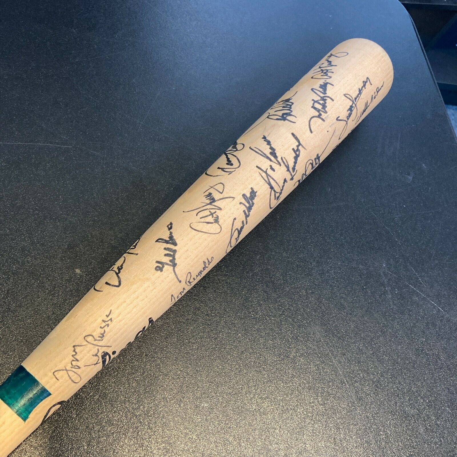 This Mark McGwire Game Issued Rawlings Bat has been signed by the team including Mark McGwire, Jose Canseco, Tony LaRussa, Baseball Hall Of Famers Rickey Henderson and Dennis Eckersley, Carney Lansford, Rick Honeycutt, Willie Randolph, Dave Henderson, Ron Hassey, Willie McGee, and many more. The Athletics' 1990 campaign ranks among the organization's finest. Winning 103 games, A's led the league outright in wins for a third consecutive season. The team's offense was led by eventual Hall-of-Famer Rickey Henderson, who finished the season with 65 stolen bases, 28 home runs, a .325 batting average, and the 1990 American League MVP Award. Also strong performances by superstars Mark McGwire and Jose Canseco. The pair clubbed 39 and 37 home runs, respectively; in doing so, they drove in a combined total of 209 runs. Clean, MINT signatures on this RARE Rawlings Adirondack Bat. PSA/DNA LOA Included.