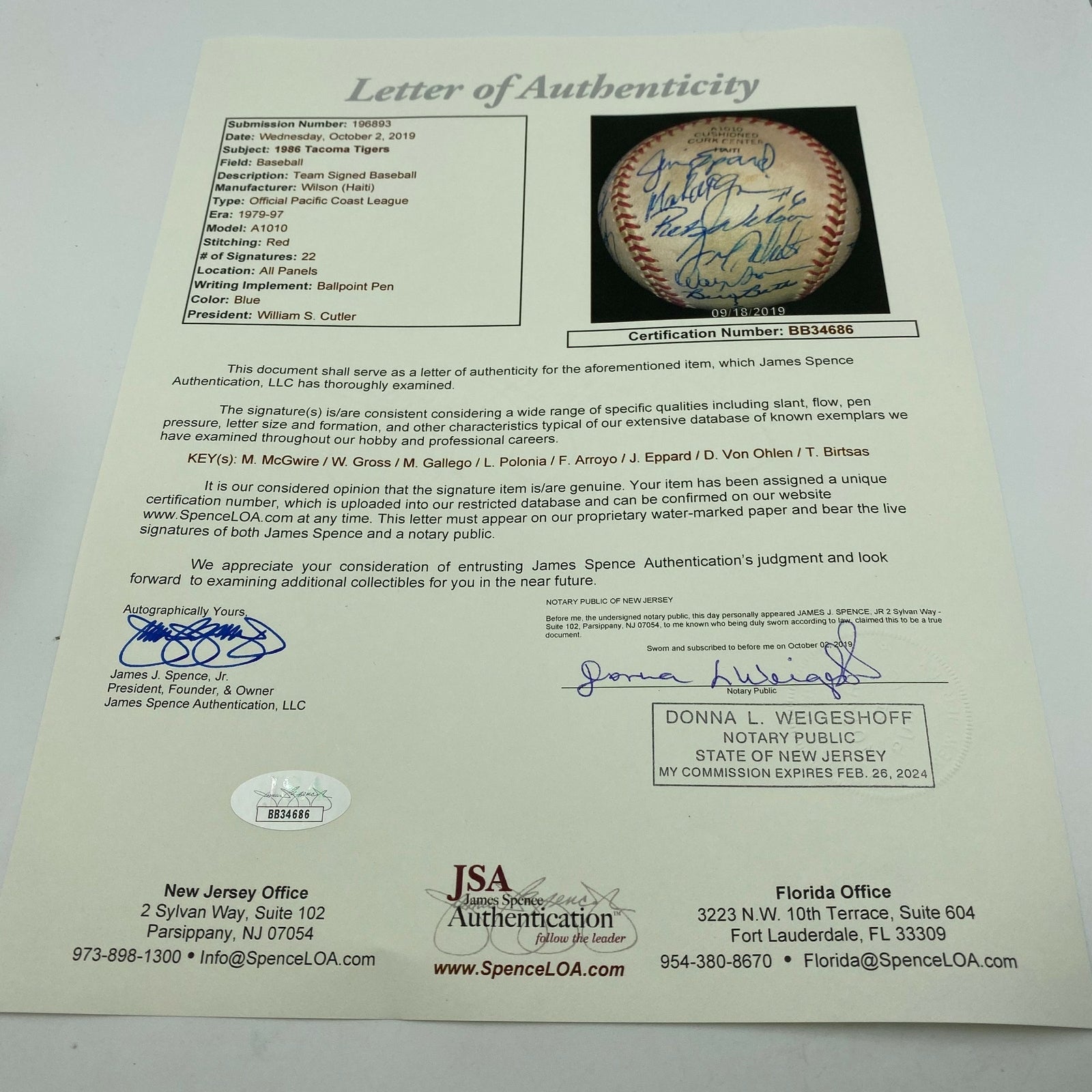 1986 Tacoma Tigers team signed Official Pacific League baseball. AAA Minor League they were 72-72 (2nd in Pacific Coast League Northern). In the Playoffs, they lost in Semifinals. They were MLB Parent Org Oakland Athletics The big stars were Mark McGwire who signed a vintage signature and inscribed#6 and Dave Stewart the both to the big show. Full letter JSA COA.