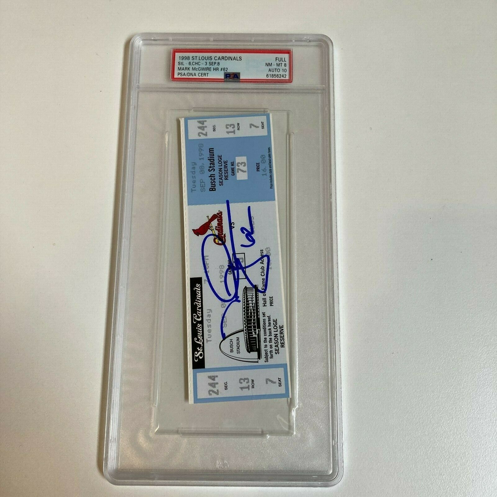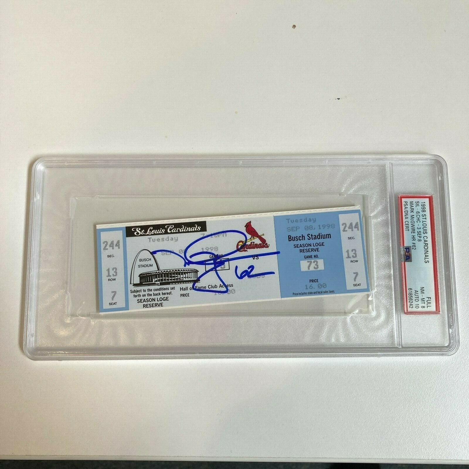 Mark Mcgwire Signed Home Run #62/ 98 Season Ticket Stub Psa/Dna NM-MT 8/10 Auto. Very rare item, was graded by Psa, 8 Ticket, perfect 10 auto. This is the record Breaker Home Run of the legendary 1998 Home run Chase, Mark even inscribed “62”.