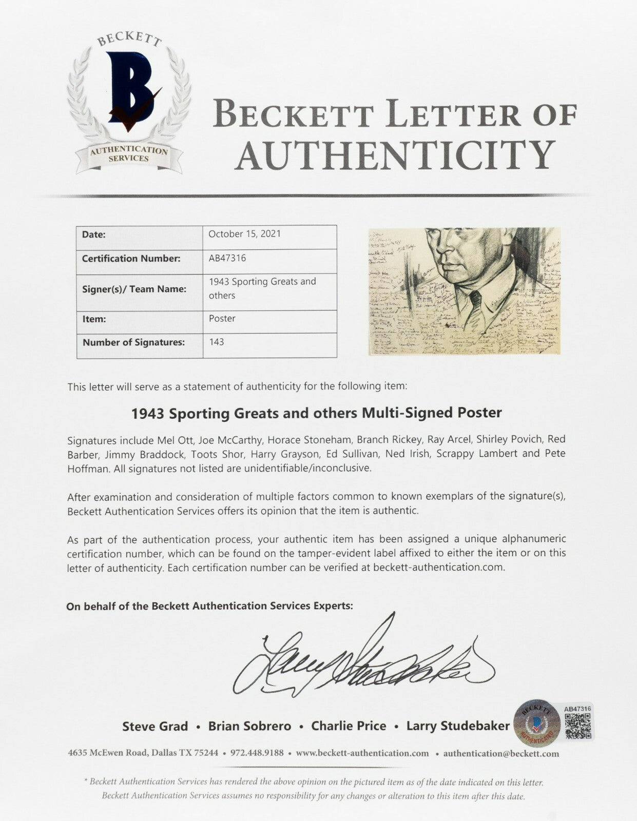 Original LOOK magazine artwork (21 x 26 inches; visible dimensions) entitled "Portrait of A Newspaperman!" by noted newspaper cartoonist Burris Jenkins. Signed by the artist on the left shoulder of the portrait image. The artwork is signed by 143 different individuals from all walks of life, the most notables being Mel Ott, Branch Rickey, Joe McCarthy, Horace Stoneham, Ray Arcel, Shirley Povich, Red Barber, Jimmy Braddock, Toots Shor, Harry Grayson, , Ned Irish, Scrappy Lambert, Pete Hoffman and MANY others .All the signatures have been scripted in bold black ink. The artwork is a mock-up of a magazine cover. The text at the top reads "Look/September 16, 1943/How I Became Famous By Frank Graham (Look's New Sports Editor)." Matted and framed to the total dimensions of 26.5 x 32.5 inches. Full LOA from Steve Grad and Brian Sobrero/Beckett Authentication Services.