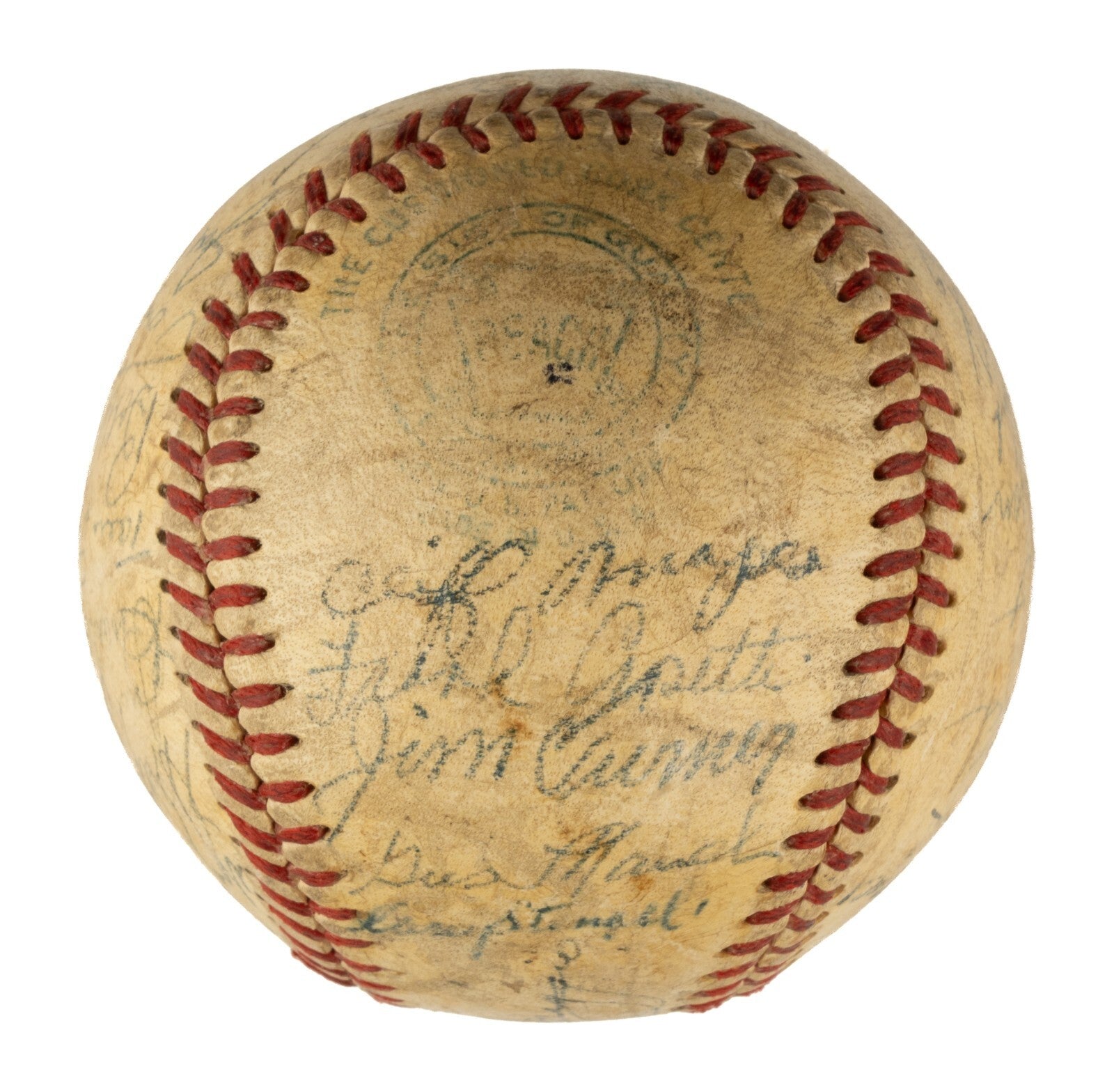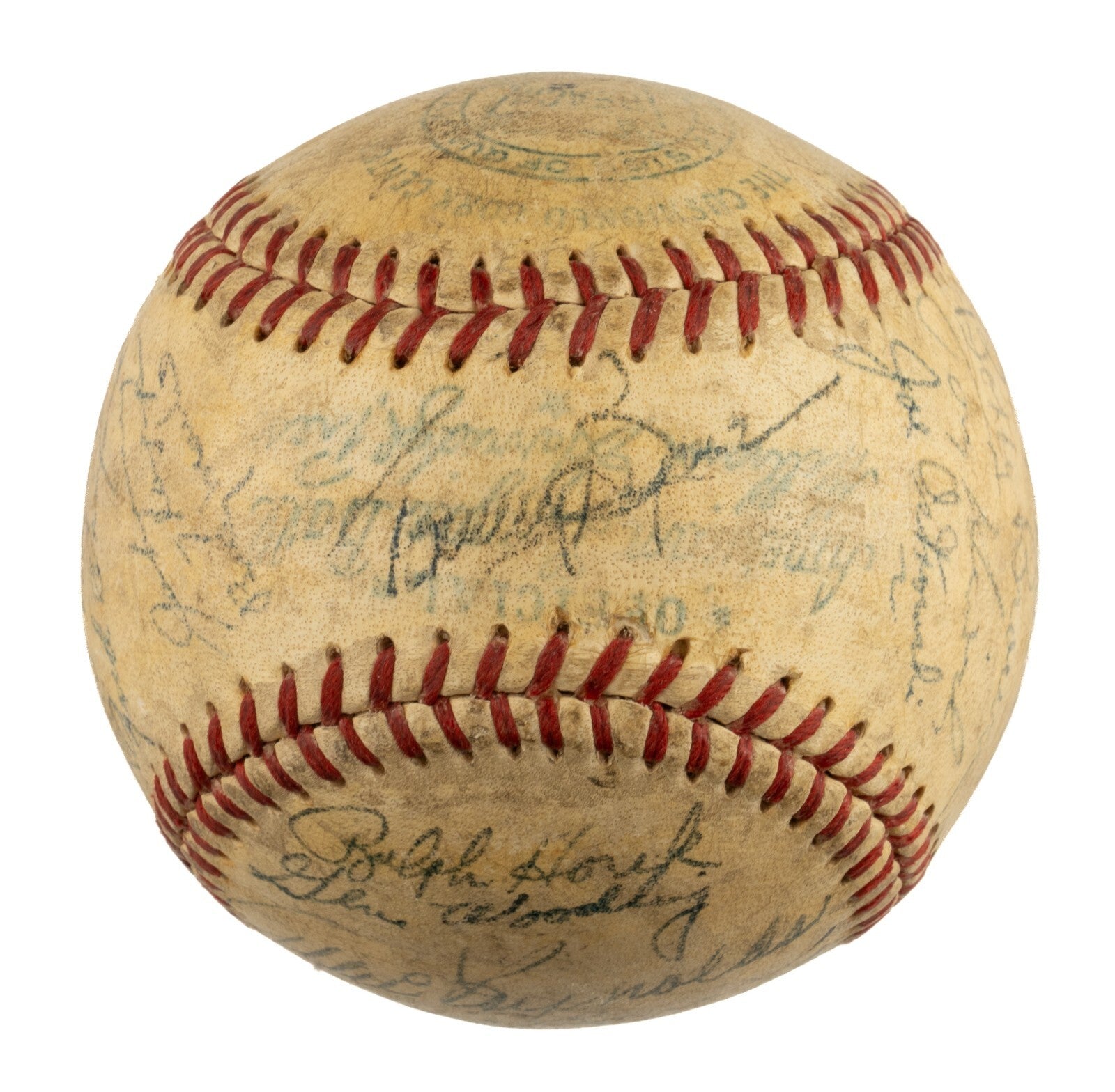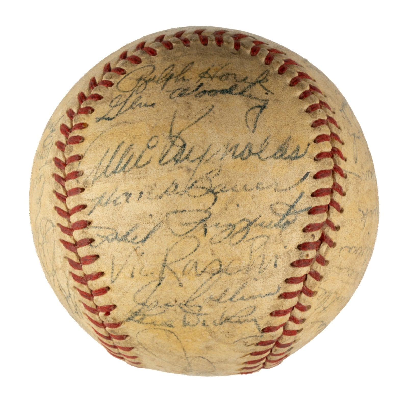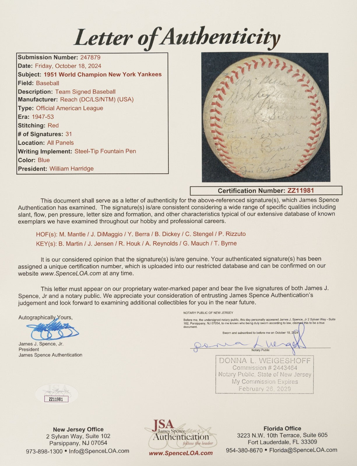 Official American League baseball (Harridge) signed in blue ink by the following 31 members of the 1951 World Champion New York Yankees: Mickey Mantle, Joe DiMaggio (sweet spot), Casey Stengel (Mgr.), Berra, Rizzuto, Dickey (coach), Martin, McDougald, Coleman, Shea, Lopat, Morgan, Sanford, Hopp, Jensen, Silvera, Ferrick, Brown, Henrich (coach), Ostrowski, Byrne, Houk, Woodling, Reynolds, Bauer, Raschi, Collins, Mapes, Crosetti (coach), Turner (coach), and G, Mauch. The year 1951 was a momentous one in Yankees history as the team bid farewell to Joe DiMaggio and welcomed his heir apparent, Mickey Mantle. The transition was certainly a smooth one, as the Yankees captured their third consecutive World Championship (en route to a record five consecutive titles) by defeating the Giants in the World Series. 1951 New York Yankees team-signed balls are among the most desirable from the era, and the offered ball is no exception. All the signatures are authentic. There are NO clubhouse signatures. In Very Good to Excellent condition overall. Full LOA from James Spence/JSA.