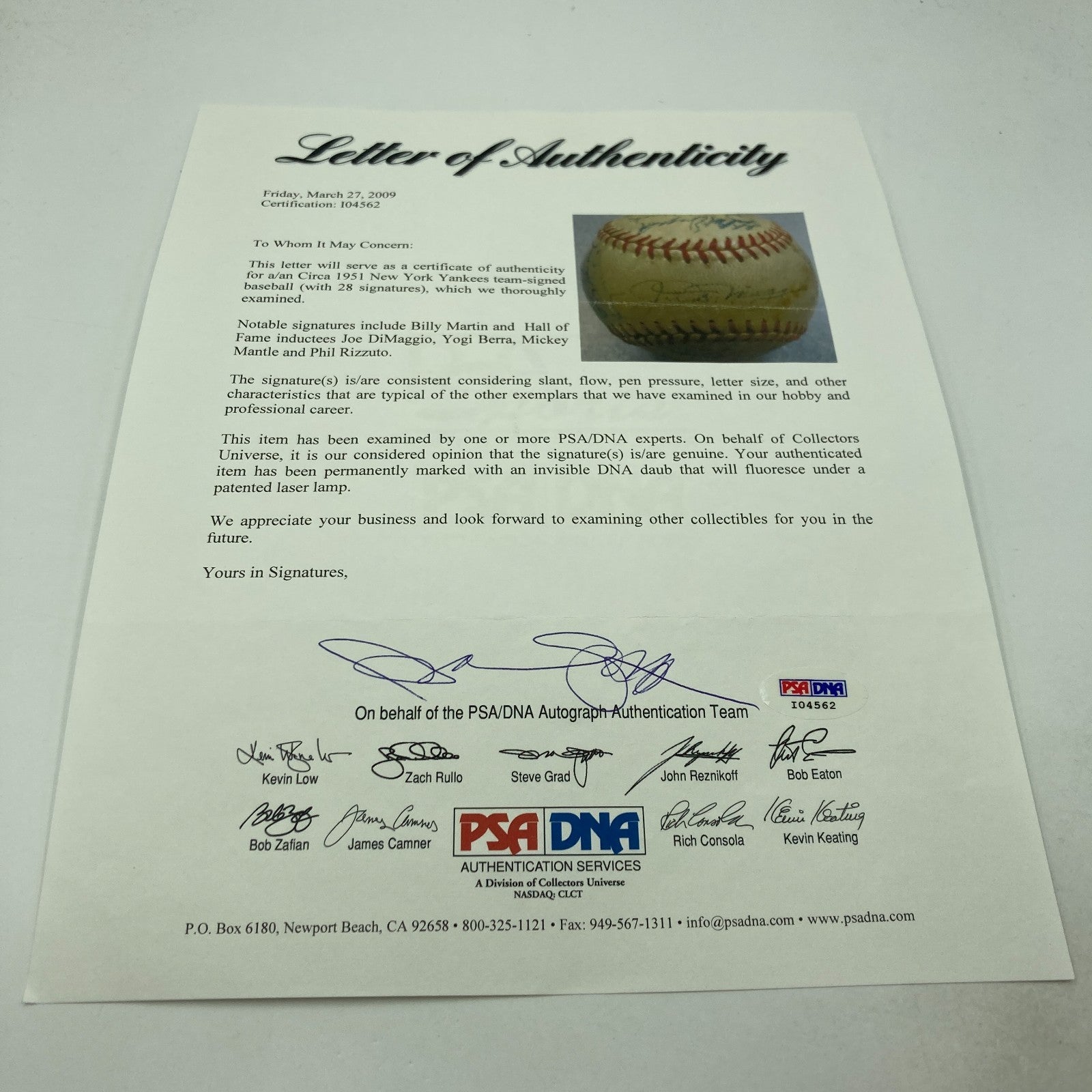 It's universally known that Mantle debuted in 1951, and that DiMaggio tendered his resignation from baseball in the off-season that followed. Moreover, we note that the signatures of Stubby Overmire and Jack Kramer also appear on the ball. The former arrived on the New York roster on June 15th that year, and the latter was released on August 30th... thereby isolating the vintage of this ball's signing to the period of mid-June to late August in 1951.