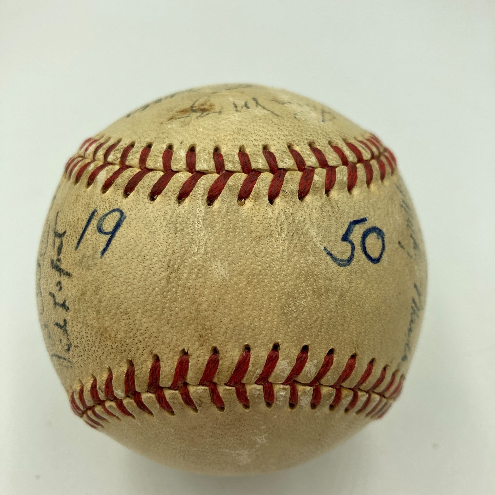 We note that on one of the sweet spots, there appears the handwritten notation "19...50." Such a reference is not uncommon in vintage team signed balls. As is explained below, this ball was signed midway in the 1951 season — but at the time, the Yankees were, indeed, the reigning World Champions (having vanquished the Phillies in the 1950 World Series).