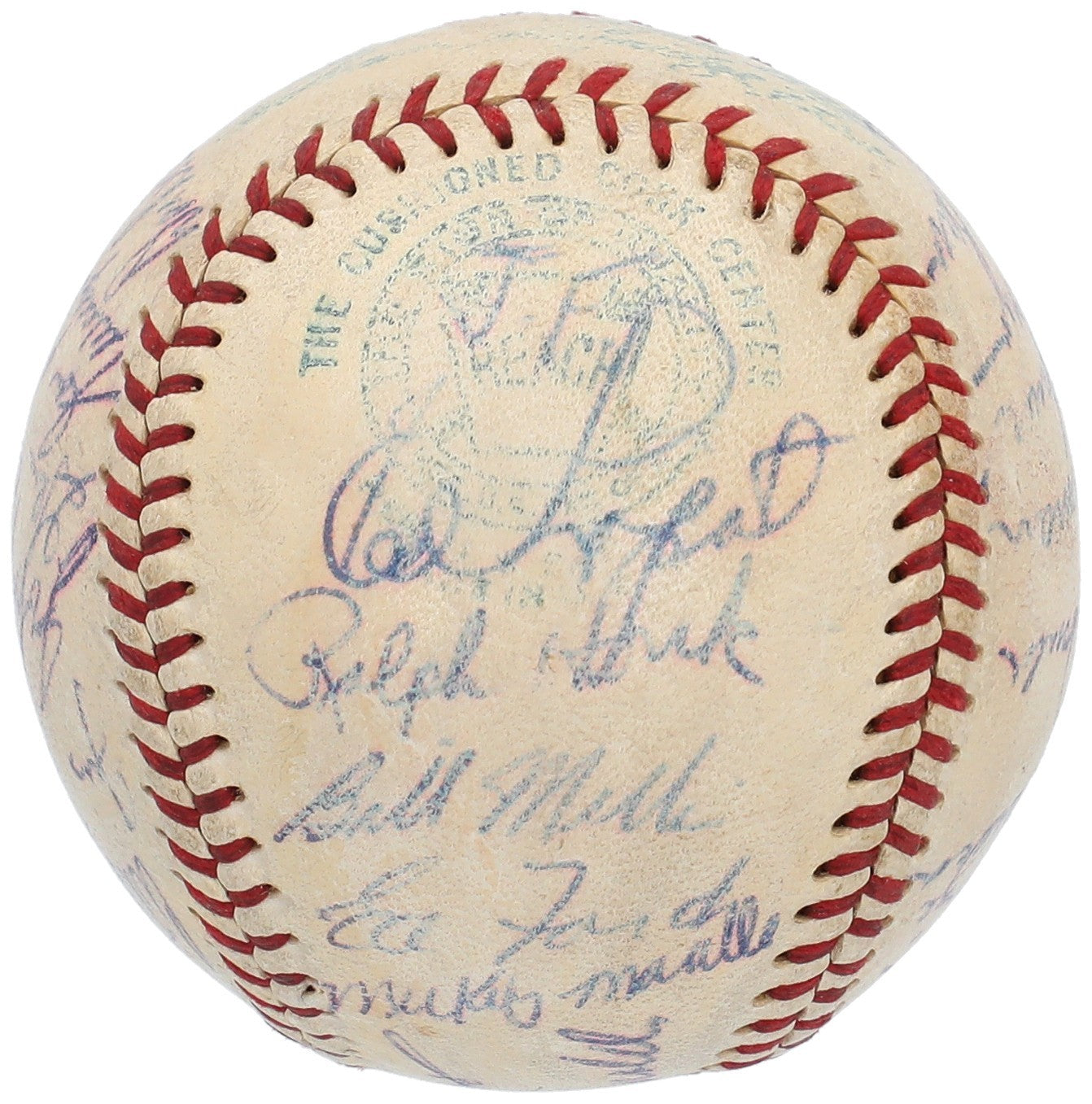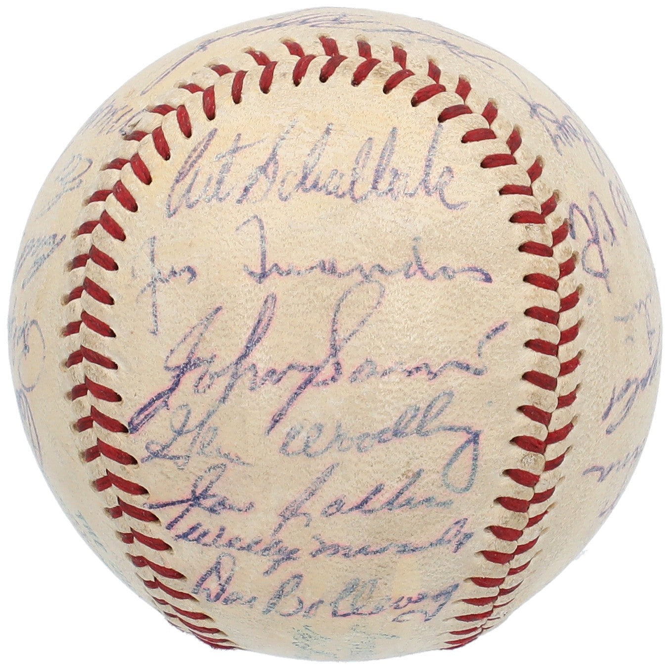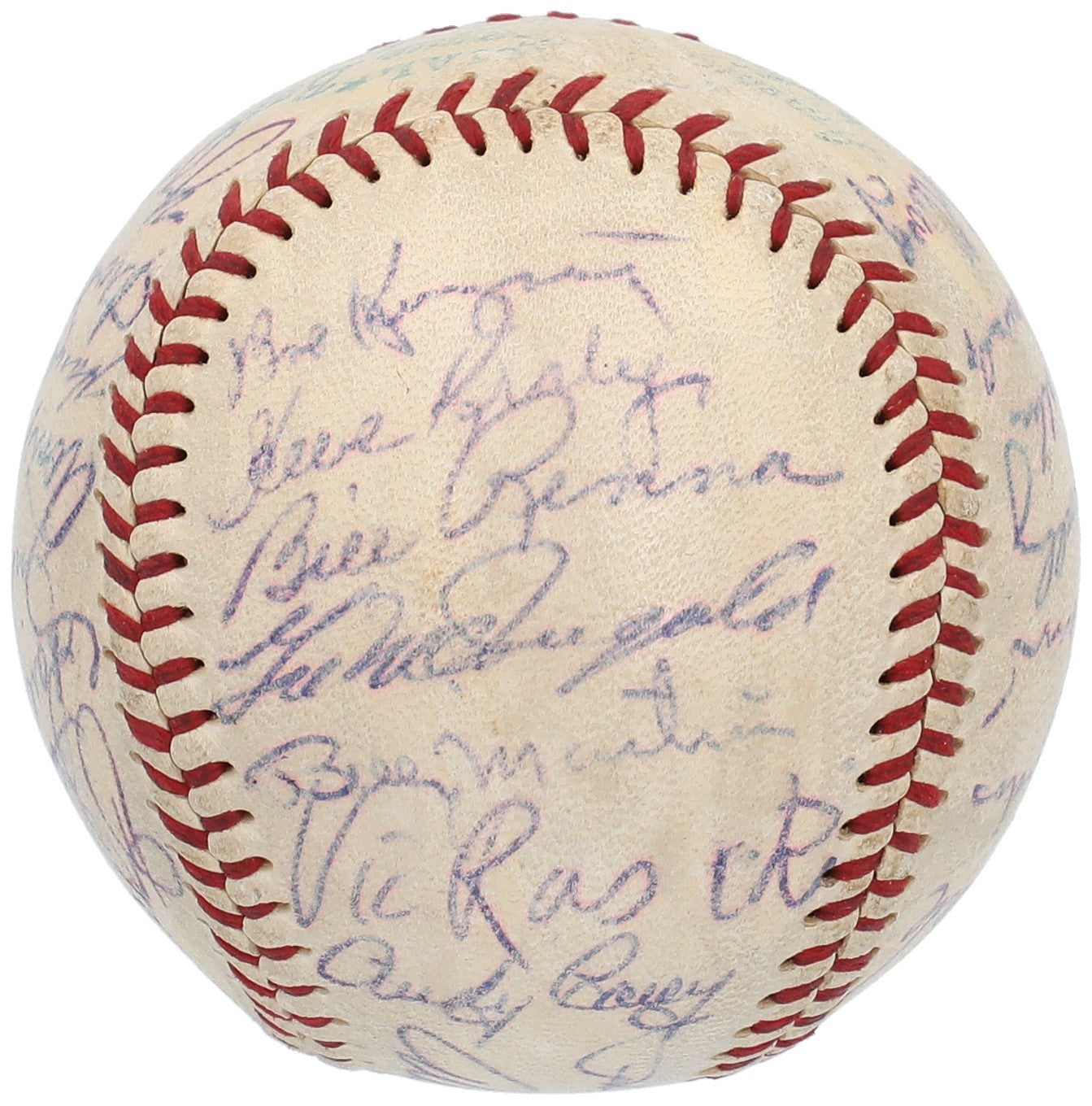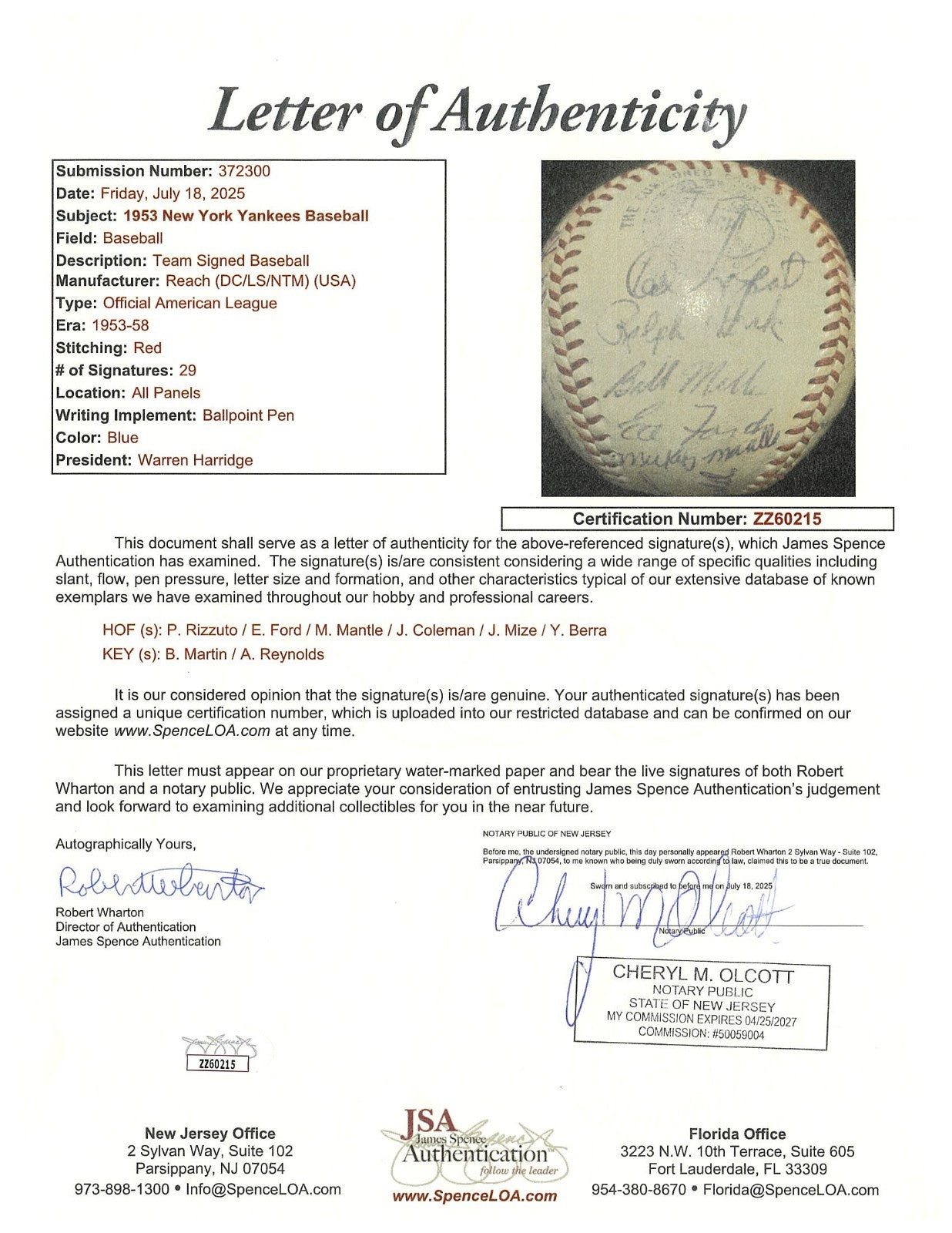 Presented is an Official American League (Harridge) baseball signed by members of the 1953 World Series Champion New York Yankees. Twenty-nine former Yankees including Hall of Famers Mickey Mantle, Yogi Berra, Whitey Ford, Johnny Mize, and Phil Rizzuto, with additional signatures fromJerry Coleman, Billy Martin, and Allie Reynolds, who have penned their blue ink signatures across the entirety of the baseball, with Rizzuto and Reynolds on the sweet spot (29 signatures). The 1953 New York Yankees would make history as the first and only team in MLB history to win five consecutive World Series titles. Behind stand-out hitting from Billy Martin, Mickey Mantle, and Yogi Berra the Yankees would defeat the Brooklyn Dodgers in the series, 4-2. Martin would serve as the Yankees' wonder-boy for the second straight year, and drilled an RBI-single in Game 6 to win the series for New York. TLOA from JSA for the signature accompanies (ZZ60215).