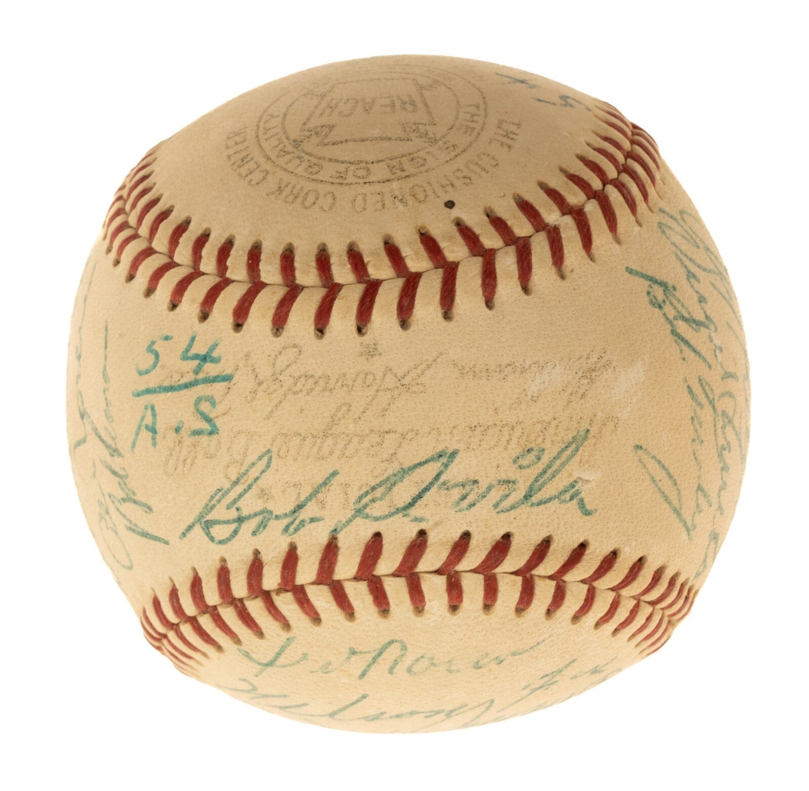Official American League baseball (Harridge) signed in blue ink by the following 27 members of the 1954 American League All-Star team: Mantle, Ted Williams (sweet spot), Berra, Fox, Doby, Ford, Lemon, Minoso, Kuenn, Marion (coach, sweet spot), Bauer, Stone Boone, Consuegra, Keegan, Kellner, Trucks, Turley, Avila, Noren, Swift, Rosen, Pillette, Vernon, Piersall, and Finigan. This ball originated from the personal collection of Nellie Fox and comes with a one-page typed-signed letter of provenance from the public auction house our consignor purchased the ball from in 2006, attesting to its authenticity. In Excellent condition overall. Full LOA from James Spence/JSAD#A2