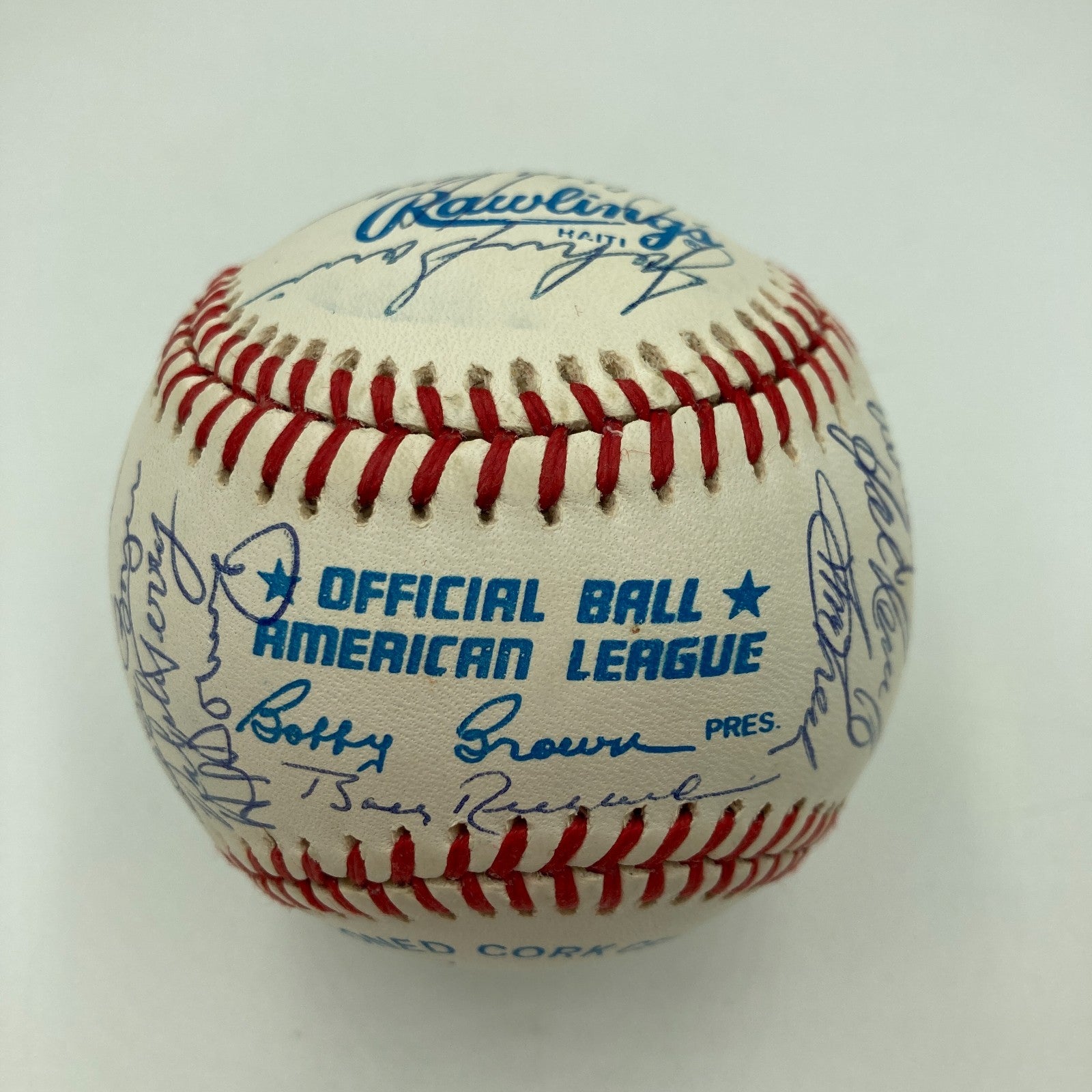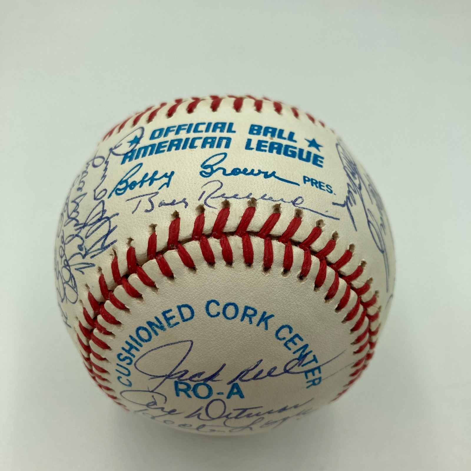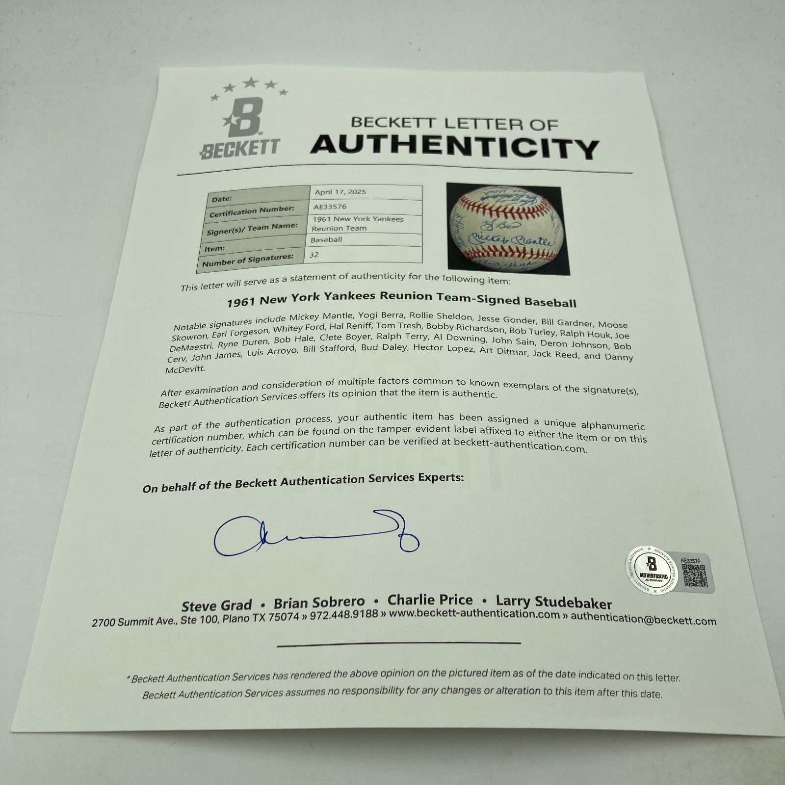 Offered is an Official American League baseball signed by 32 members of the 1961 World Series champion New York Yankees during a reunion of what many consider to be one of the greatest baseball teams in MLB history. Managed by Ralph Houk, the Yankees dominated their opponents, finishing the season with a remarkable 109-53 record and going on to defeat the Cincinnati Reds in five games during the 1961 World Series. The season was famously marked by the intense home run chase between Roger Maris and Mickey Mantle for the coveted single-season home run record held by Hall of Famer Babe Ruth, with Maris ultimately breaking the record by hitting 61 home runs. The ball is signed in blue ballpoint pen by Hall of Famers Mickey Mantle, Yogi Berra, and Whitey Ford, with additional signatures from Rollie Sheldon, Jesse Gonder, Billy Gardner, Moose Skowron, Earl Torgeson, Hal Reniff, Tom Tresh, Bobby Richardson, Bob Turley, Ralph Houk, Joe DeMaestri, Ryne Duren, Bob Hale, Clete Boyer, Ralph Terry, Al Downing, Johnny Sain, Deron Johnson, Bob Cerv, Johnny James, Luis Arroyo, Bill Stafford, Bud Daley, Hector Lopez, Art Ditmar, Jack Reed, and Danny McDevitt. The ball is white with vibrant red stitching and clear signatures. Accompanied by an LOA from Beckett for the signatures.