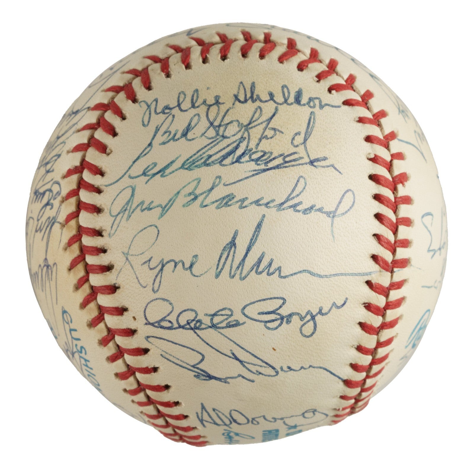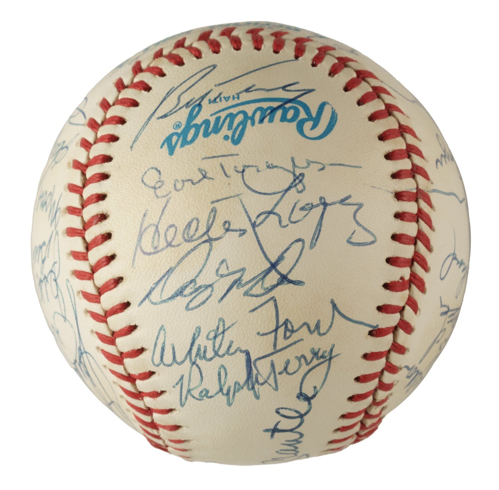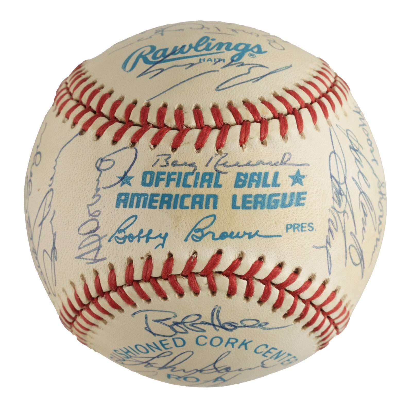 Official American League reunion baseball (Bobby Brown) signed in blue ink by thirty-three members of the 1961 World Champion New York Yankees. Notable signatures include Mickey Mantle (sweet spot), Yogi Berra (sweet spot), Clete Boyer, Ralph Houck (mgr.), Bill Skowron, Tom Tresh, Bobby Richardson, Johnny Blanchard, Earl Torgeson, and Ralph Terry. This ball originates from the very well-documented "1961 Yankees reunion" show in 1989 which to the best of our knowledge was the team's only formal post-1961 signing event. Full LOA from James Spence/JSA.