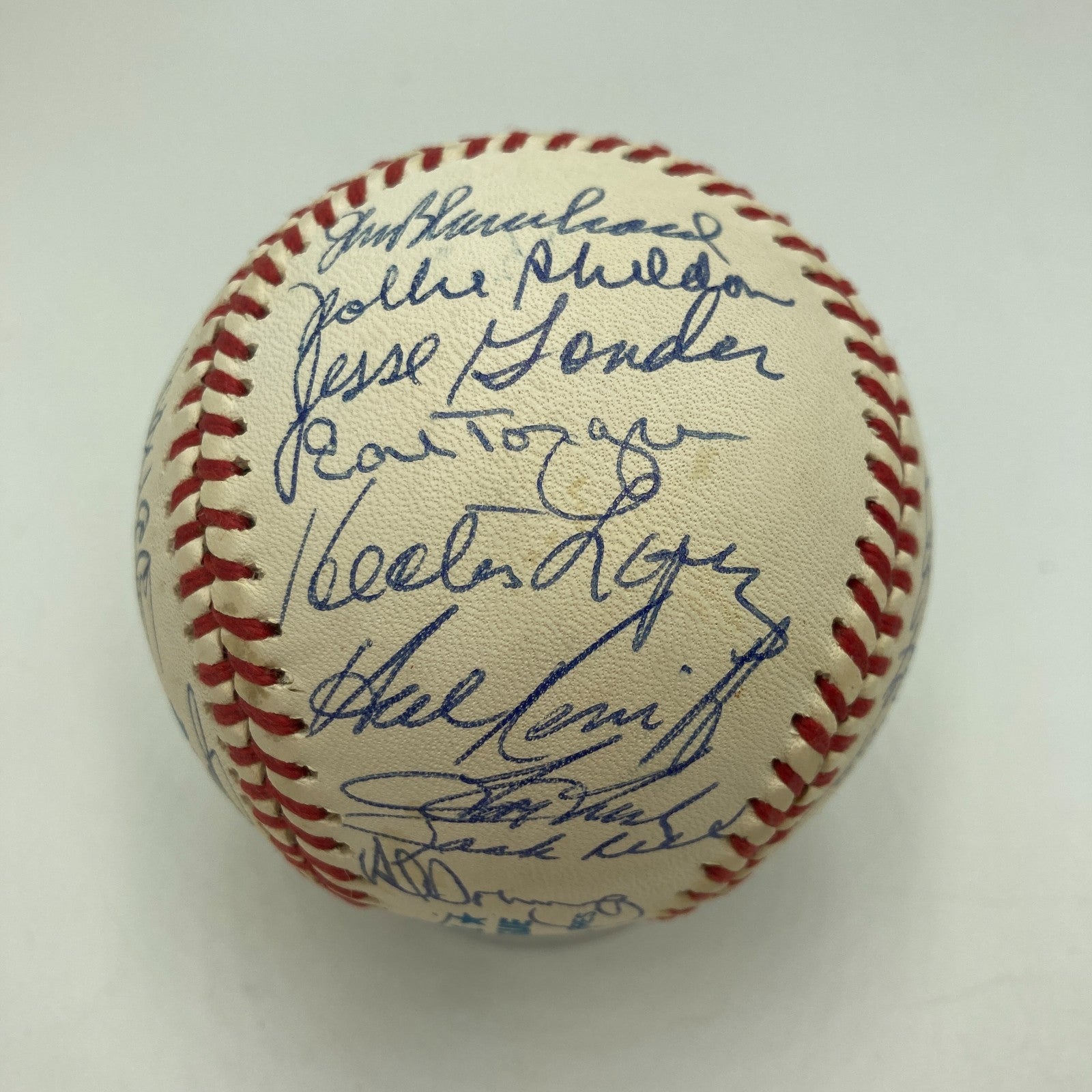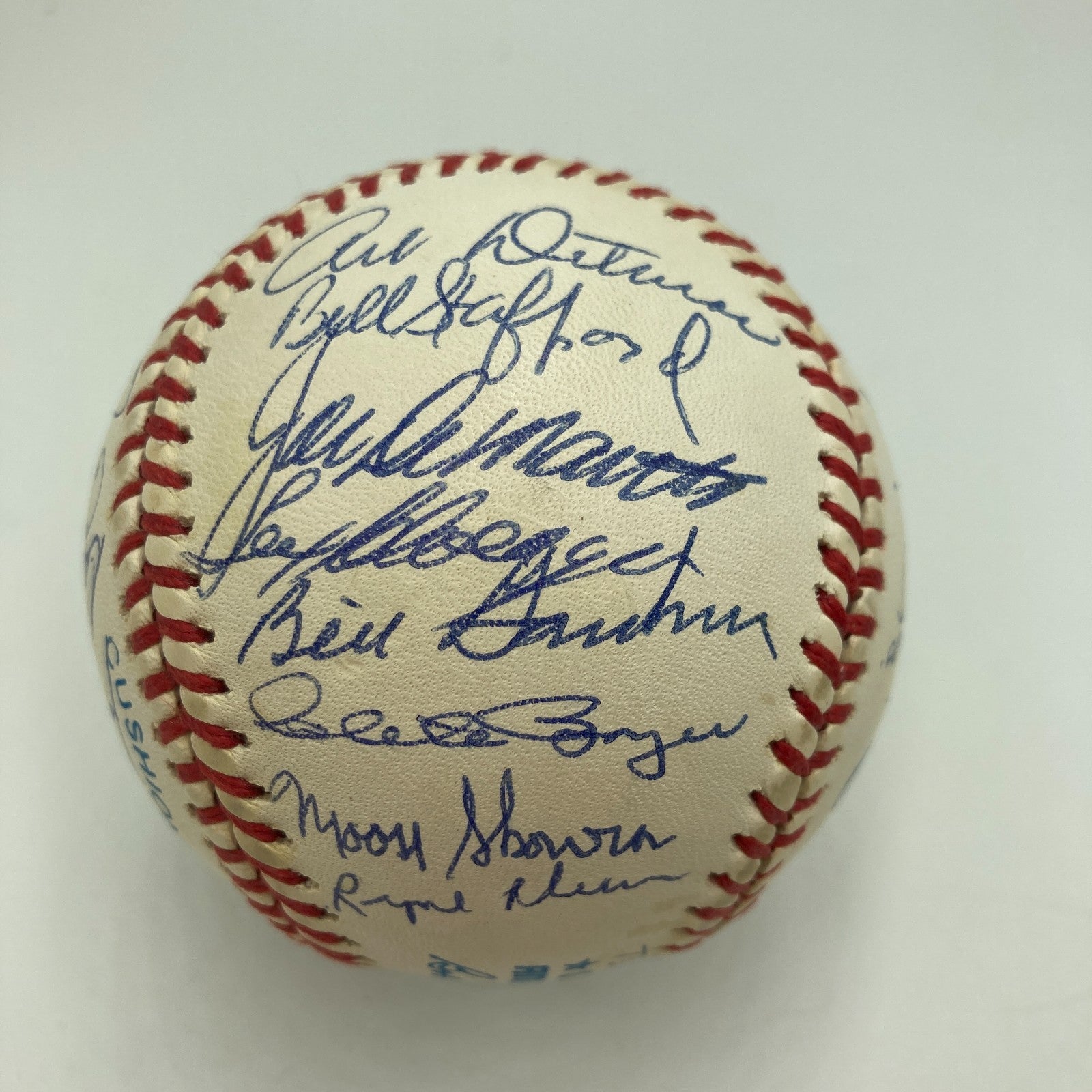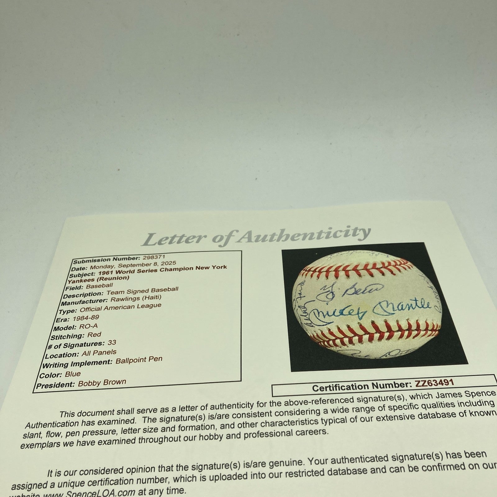 Displayed is a 1961 World Champion New York Yankees reunion team-signed baseball with 31+ autographs, including Mickey Mantle and fellow Hall of Famers Yogi Berra and Whitey Ford. The '61 Yankees went 109-53 in the season to take the AL pennant, and the Bronx Bombers went 4-1 in games to defeat the Cincinnati Reds in the World Series. The regular season featured a riveting challenge by Roger Maris and Mickey Mantle to Babe Ruth's single-season record of 60 home runs: Maris edged Ruth by crashing 61 round-trippers and Mantle, beset by injury, finished with 54 dingers. Whitey Ford was the Yanks' pitching ace, with an AL leading 25 wins. The signatures on the Official American League Ball are in blue ballpoint ink. Mantle and Berra signed on the sweet spot. Ford signed just to the left of the sweet spot. In addition to the aforementioned Hall of Famers, the ball was signed by manager Houk, Turley, Downing, Richardson, Daly, Terry, Sain, Arroyo, Blanchard, Torgeson, Sheldon, Lopez, Tresh, Reed, Skowron, Boyer, Stafford, and more.