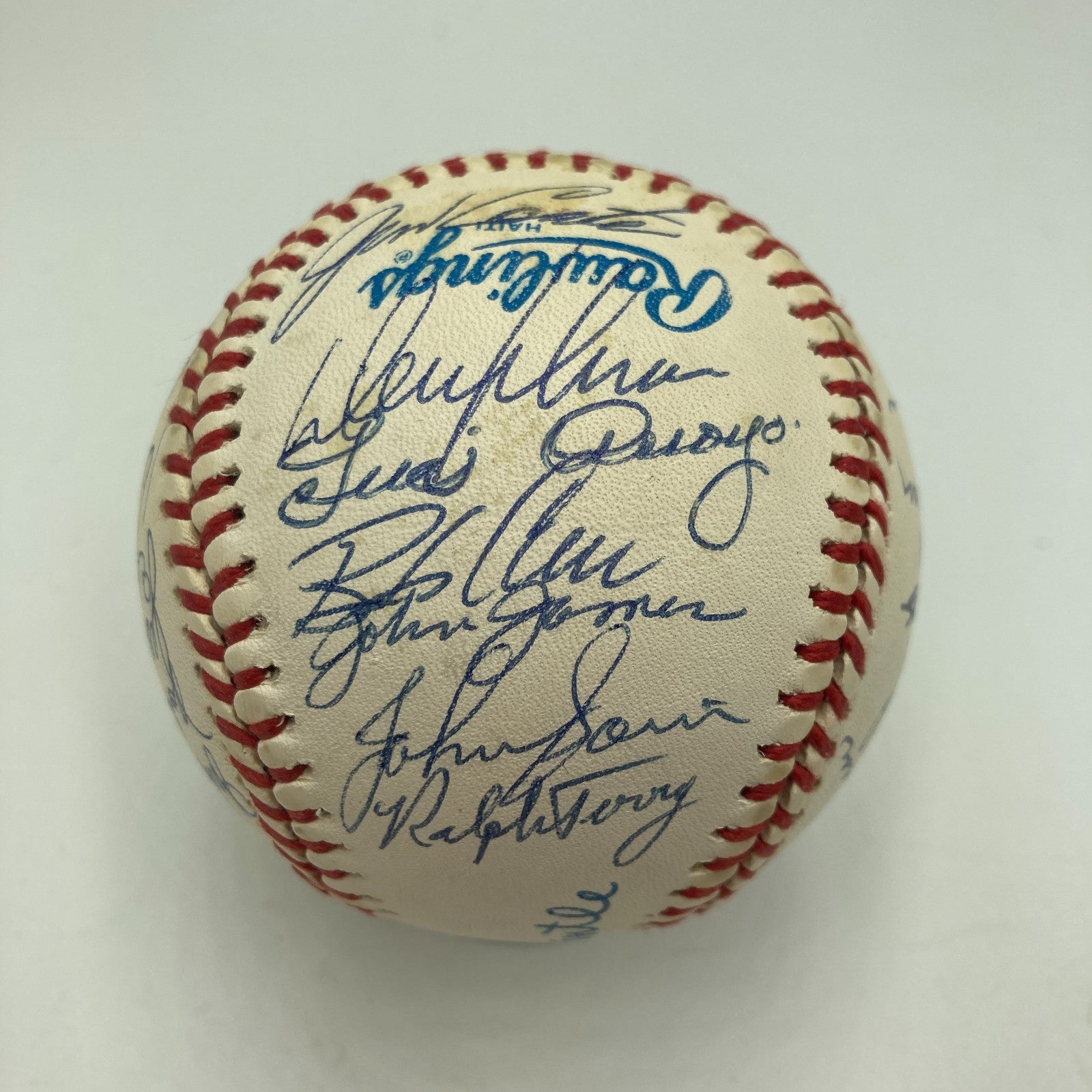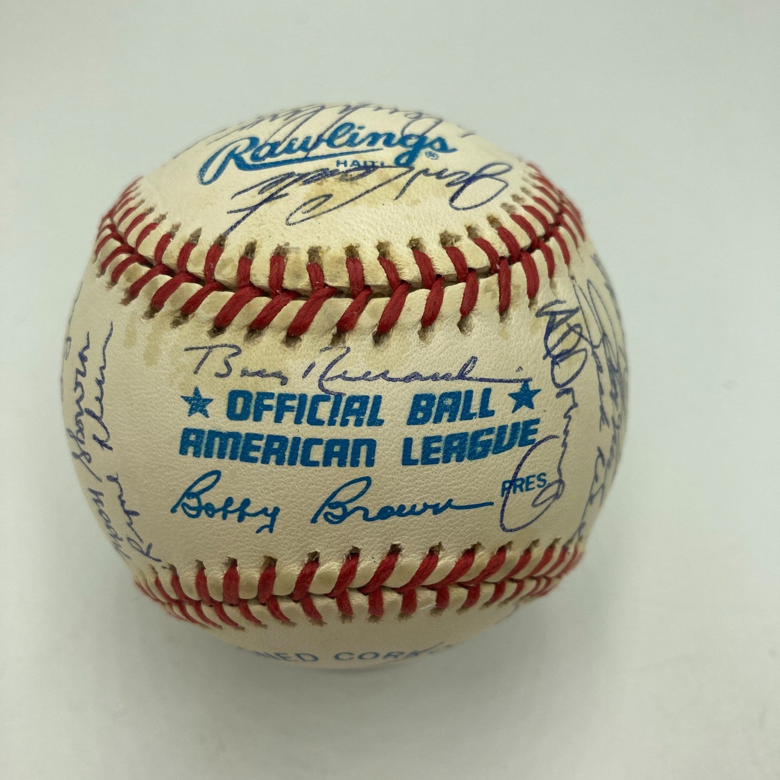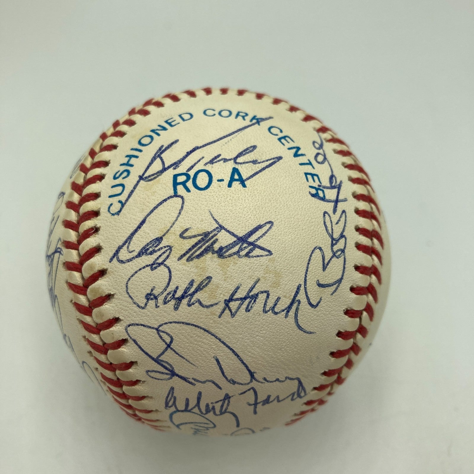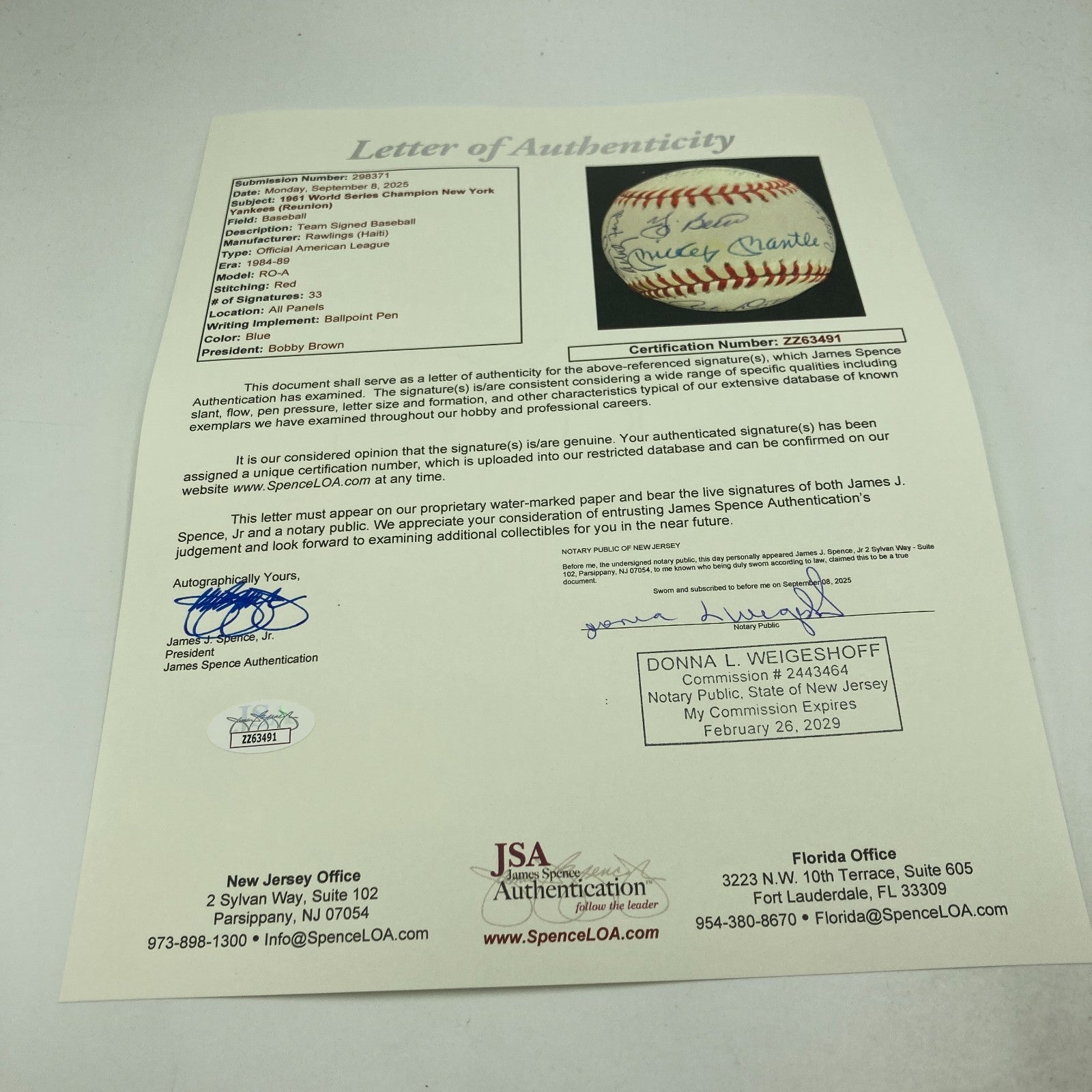 Displayed is a 1961 World Champion New York Yankees reunion team-signed baseball with 31+ autographs, including Mickey Mantle and fellow Hall of Famers Yogi Berra and Whitey Ford. The '61 Yankees went 109-53 in the season to take the AL pennant, and the Bronx Bombers went 4-1 in games to defeat the Cincinnati Reds in the World Series. The regular season featured a riveting challenge by Roger Maris and Mickey Mantle to Babe Ruth's single-season record of 60 home runs: Maris edged Ruth by crashing 61 round-trippers and Mantle, beset by injury, finished with 54 dingers. Whitey Ford was the Yanks' pitching ace, with an AL leading 25 wins. The signatures on the Official American League Ball are in blue ballpoint ink. Mantle and Berra signed on the sweet spot. Ford signed just to the left of the sweet spot. In addition to the aforementioned Hall of Famers, the ball was signed by manager Houk, Turley, Downing, Richardson, Daly, Terry, Sain, Arroyo, Blanchard, Torgeson, Sheldon, Lopez, Tresh, Reed, Skowron, Boyer, Stafford, and more.
