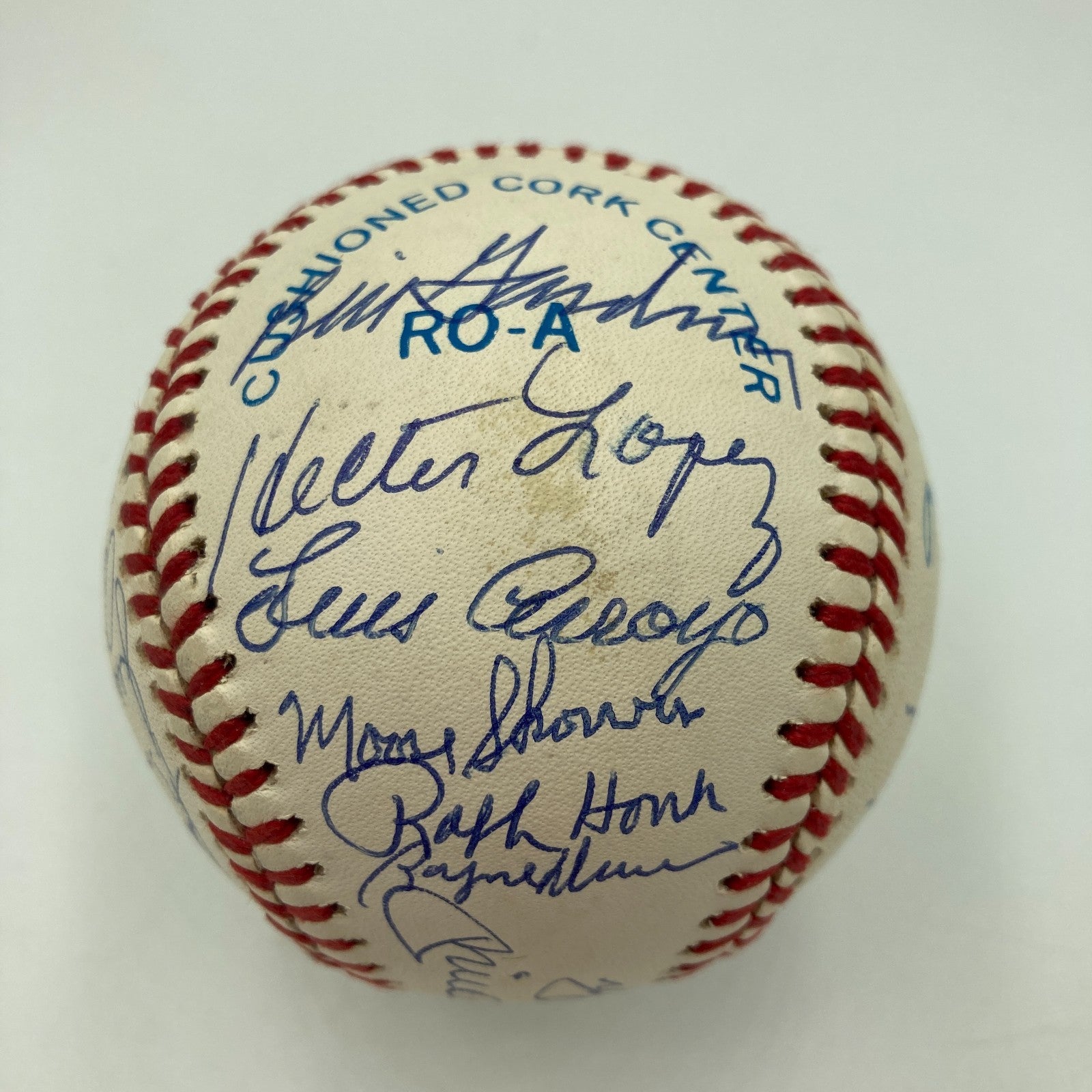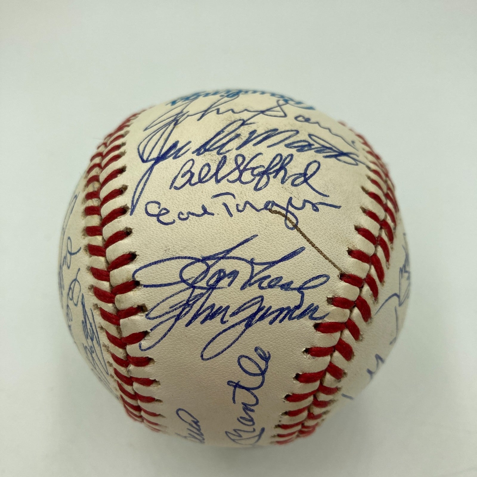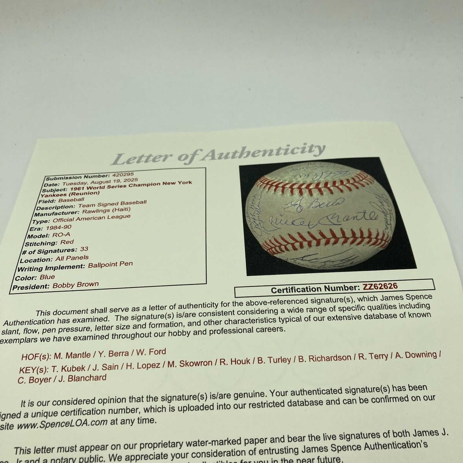 Displayed is a 1961 World Champion New York Yankees reunion team-signed baseball with 31+ autographs, including Mickey Mantle and fellow Hall of Famers Yogi Berra and Whitey Ford. The '61 Yankees went 109-53 in the season to take the AL pennant, and the Bronx Bombers went 4-1 in games to defeat the Cincinnati Reds in the World Series. The regular season featured a riveting challenge by Roger Maris and Mickey Mantle to Babe Ruth's single-season record of 60 home runs: Maris edged Ruth by crashing 61 round-trippers and Mantle, beset by injury, finished with 54 dingers. Whitey Ford was the Yanks' pitching ace, with an AL leading 25 wins. The signatures on the Official American League Ball are in blue ballpoint ink. Mantle and Berra signed on the sweet spot. Ford signed just to the left of the sweet spot. In addition to the aforementioned Hall of Famers, the ball was signed by manager Houk, Turley, Downing, Richardson, Daly, Terry, Sain, Arroyo, Blanchard, Torgeson, Sheldon, Lopez, Tresh, Reed, Skowron, Boyer, Stafford, and more.