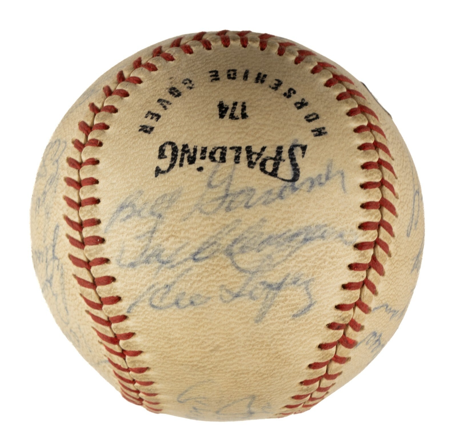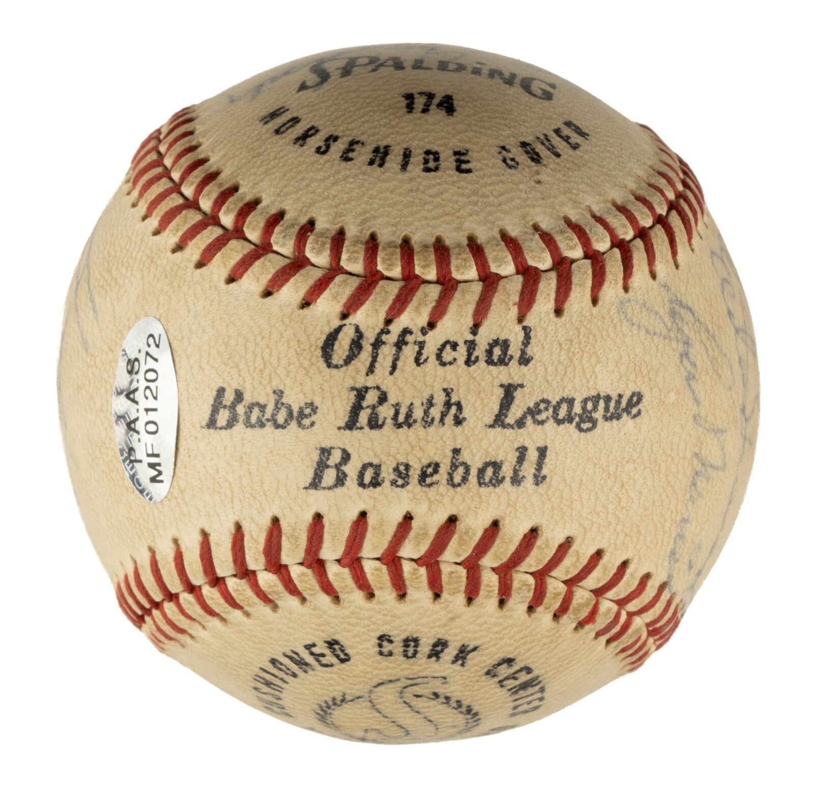 Spalding "Official Babe Ruth League" baseball signed in blue ink by the following eighteen members of the 1961-62 World Champion New York Yankees: Mickey Mantle (sweet spot), Yogi Berra (sweet spot), Roger Maris, Howard, Arroyo, Moses (coach), Reniff, Clevenger, Kubek, Lopez, Skowron, Terry, Gardner, Hegan (coach), Downing, Crosetti (coach), Richardson, and Murray (batting practice pitcher). 1961 Yankees balls are among the most desirable of all team-signed balls due to the historic nature of the season. The club not only amassed a then-record 240 home runs but also won 109 games, which was the third-highest win total in American League history at the time. Despite those two lofty achievements, both paled in comparison to the daily drama presented by the famed "M&M Boys," Mantle and Maris. The sluggers waged a classic season-long home-run duel that recalled the epic battle between Ruth and Gehrig in 1927. Just as in 1927, the contest ended with a home-run record being broken, as Maris bested Ruth's single-season mark in the final game of the year. The postseason was equally unkind to Ruth, as Whitey Ford broke the Babe's streak of consecutive scoreless innings in World Series play, leading the Yankees to an easy five-game victory over the Reds and cementing their place as one of the greatest ball clubs of all time. The ball has light toning but otherwise is in Excellent to Mint condition overall. Full LOA from James Spence/JSA.