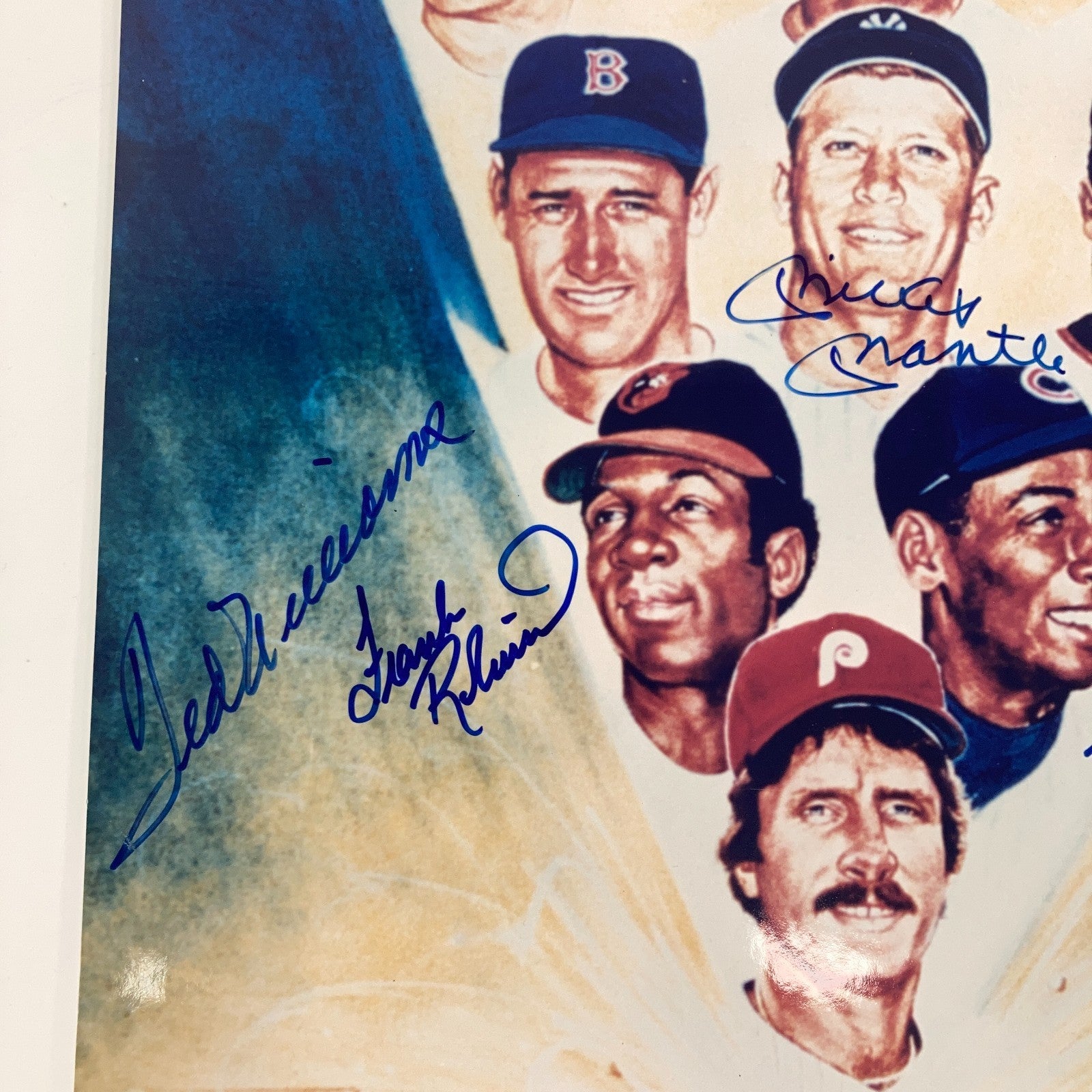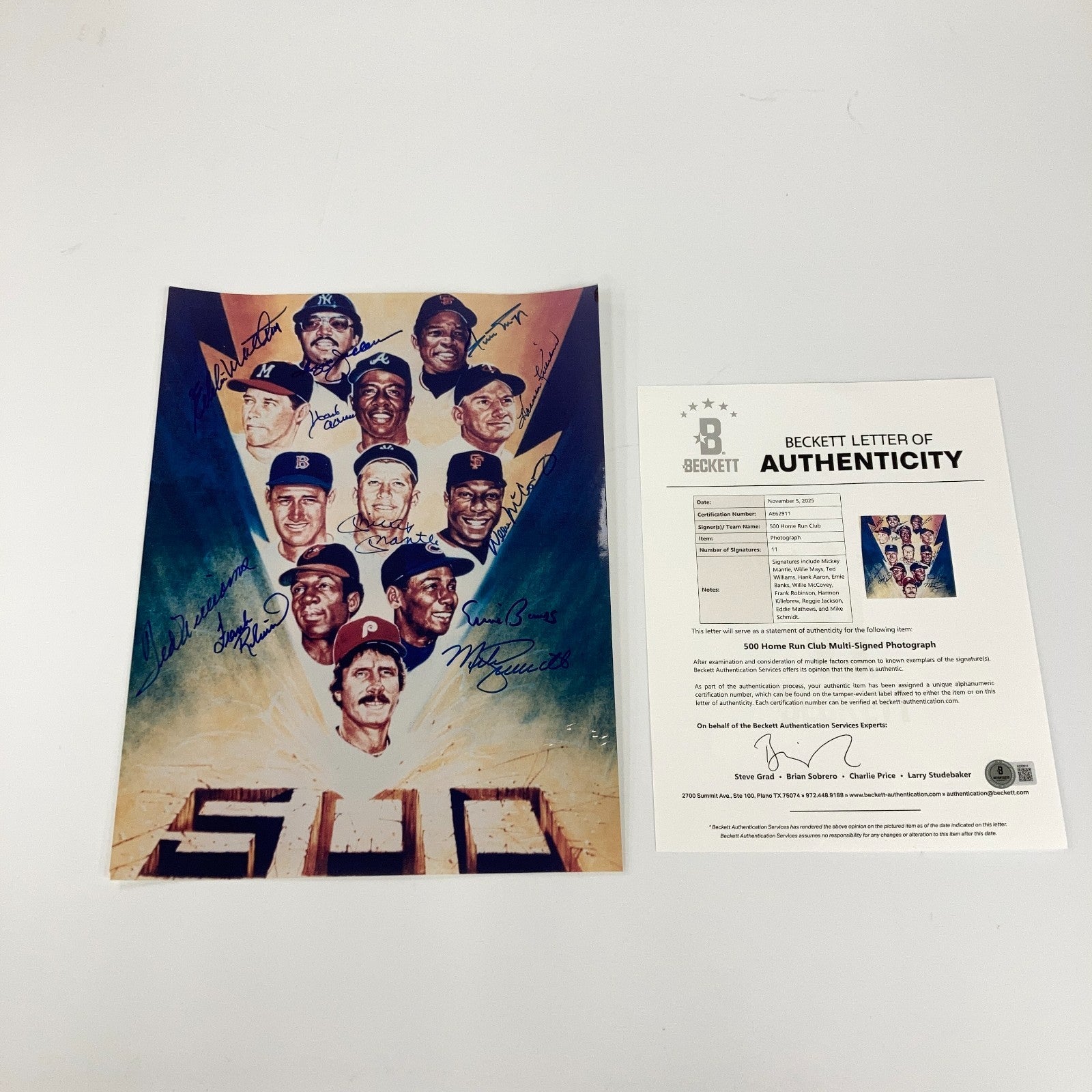 Hall of Famers. Presented is a Major League Baseball 500 Home Run Club photograph signed by 11 members of baseball's greatest class of sluggers. National Baseball Hall of Famers Willie Mays, Harmon Killebrew, Willie McCovey, Mickey Mantle, Frank Robinson, Ernie Banks, Mike Schmidt, Ted Williams, Hank Aaron, and Reggie Jackson have penned their blue ink signatures across the front of the poster adjacent to their likeness (11 signatures). The photograph measures 10.5-by-14 inches. LOA from Beckett for the signatures accompanies.
