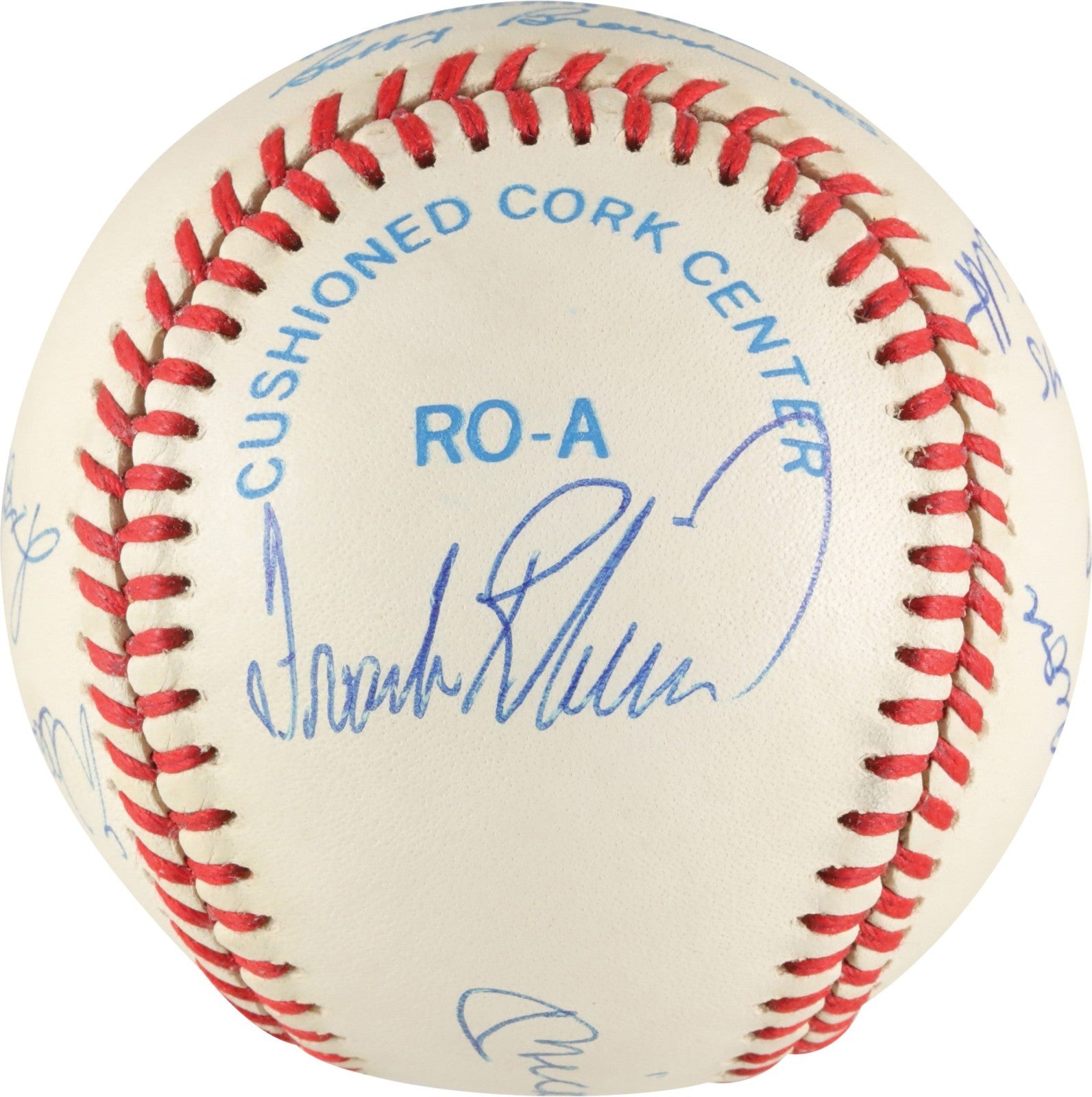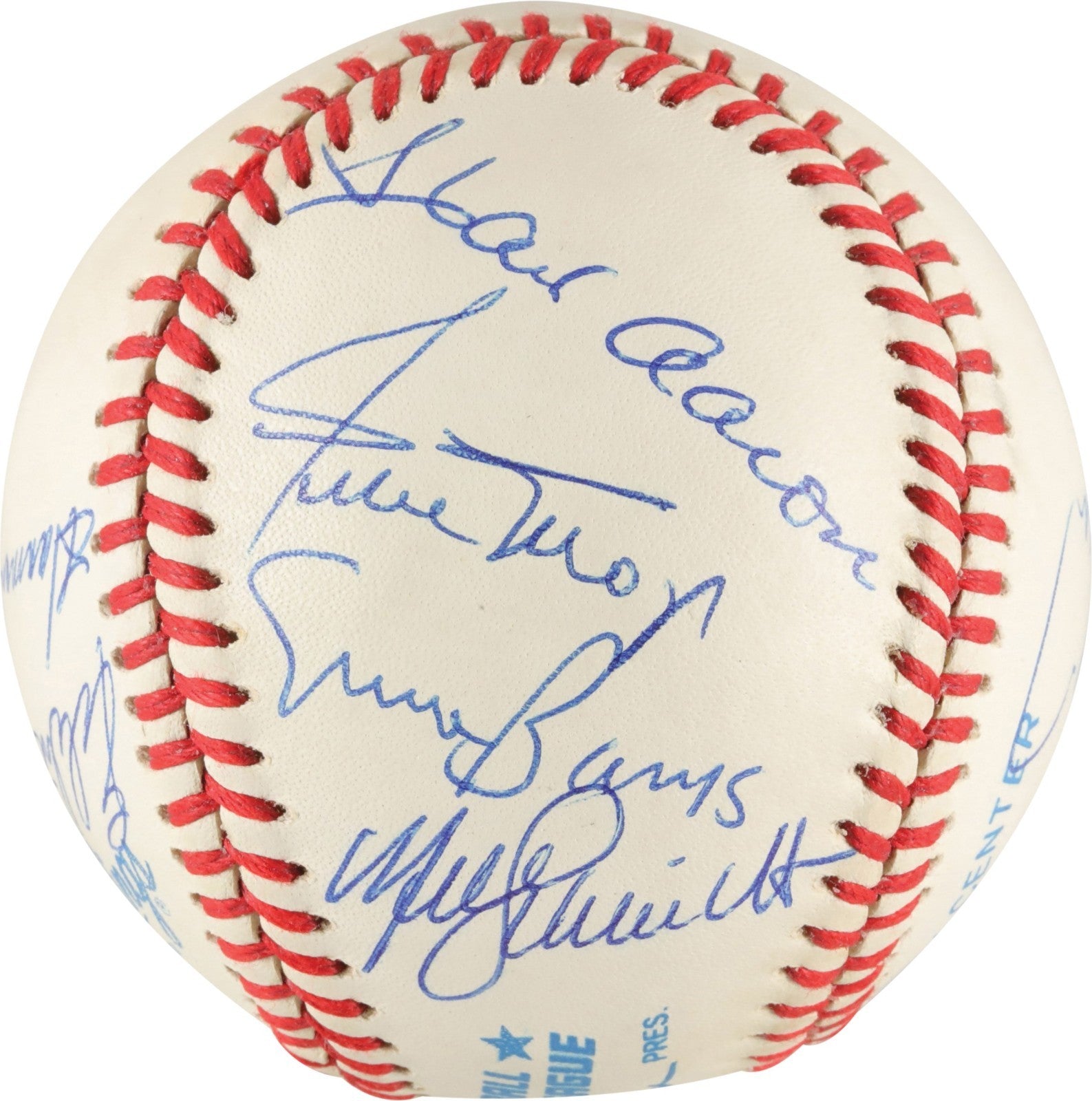 500 Home Run Club signed baseball with 10 signatures. Mickey Mantle signed the sweet spot of this Rawlings Official American League baseball. It is also signed by Frank Robinson, Eddie Mathews, Harmon Killebrew, Hank Aaron, Willie Mays, Ernie Banks, Mike Schmidt, Willie McCovey, and Reggie Jackson. The baseball is in near-mint condition, and the signatures rate 9/10. Includes a full LOA from PSA.