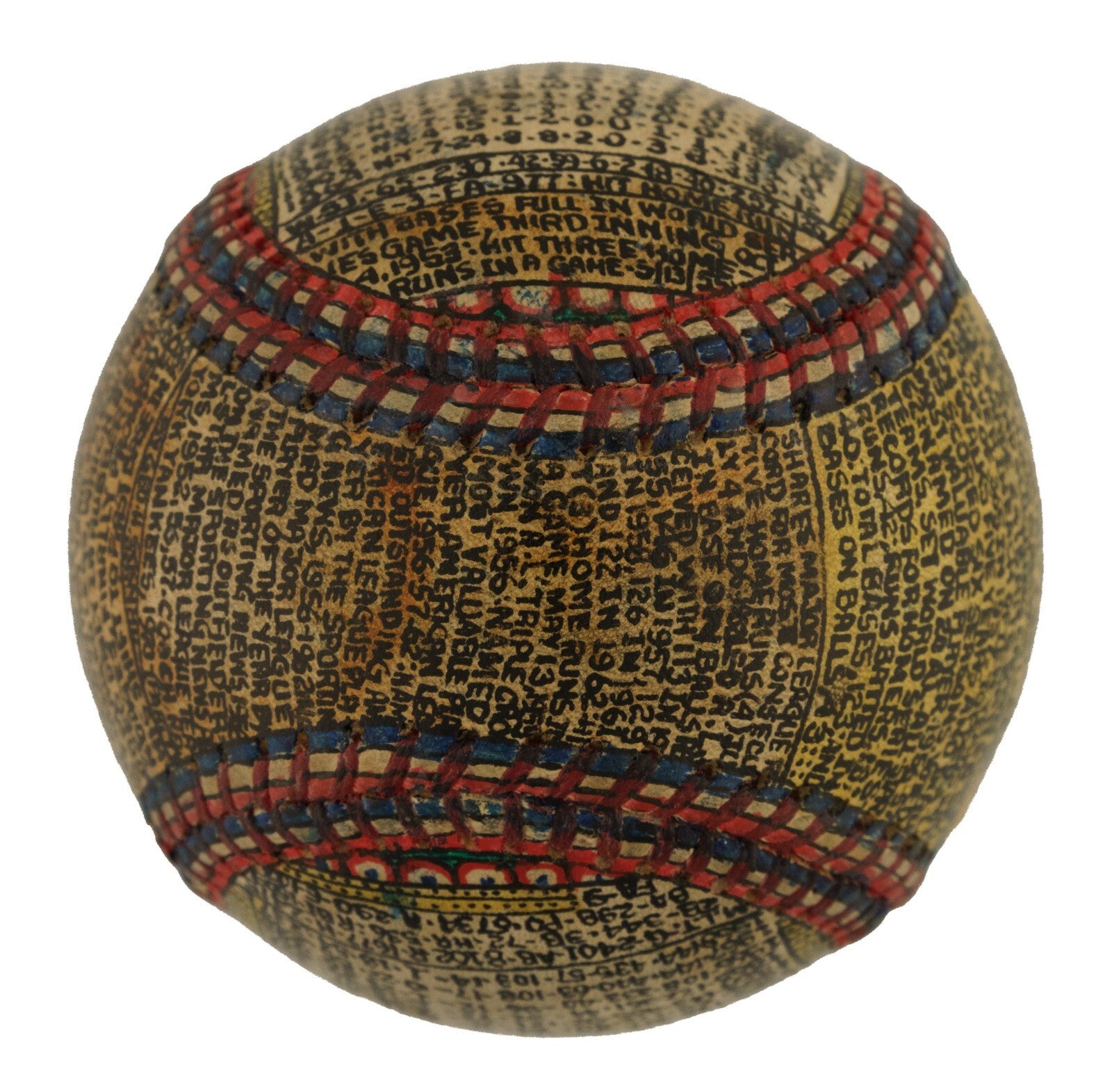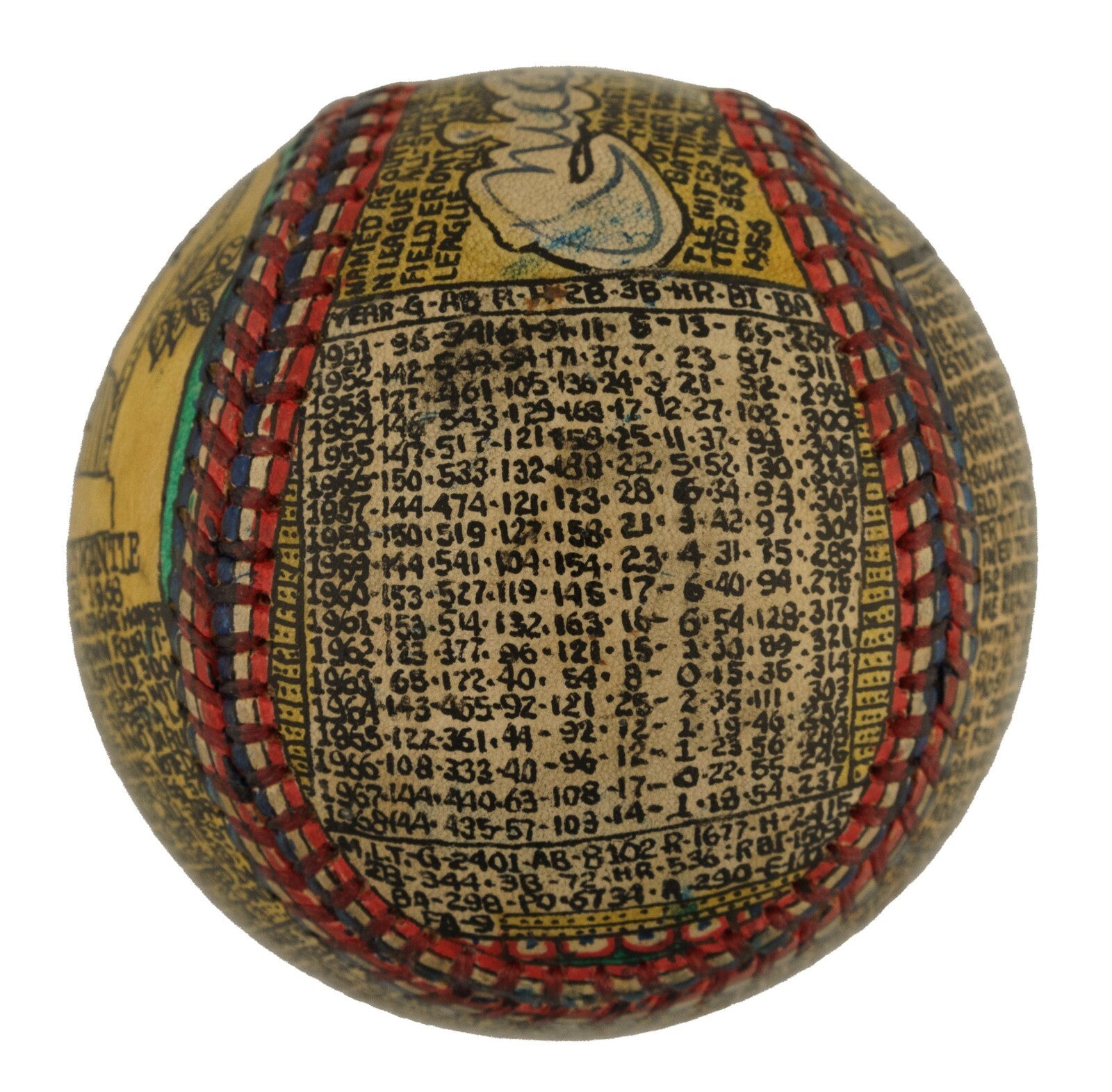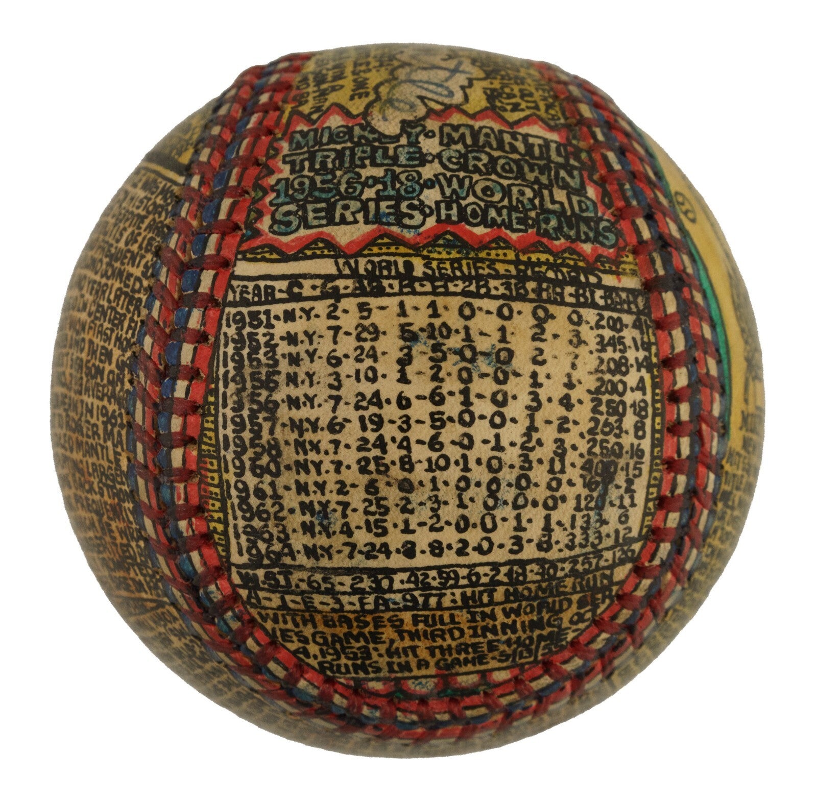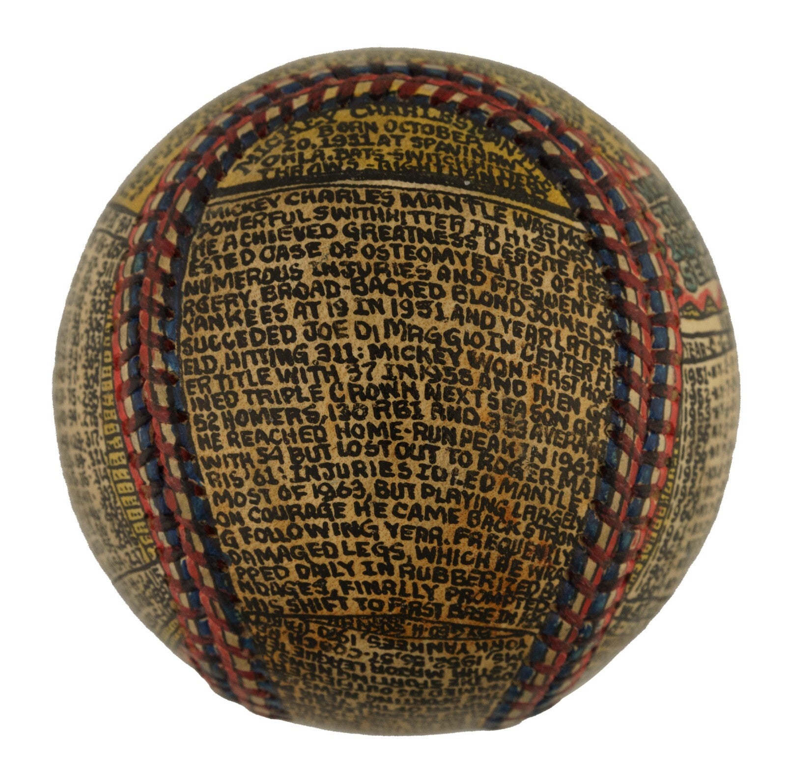 Elaborate folk-art tribute ball hand-painted by former minor-league umpire George Sosnak (1922-1992), commemorating the baseball career of Mickey Mantle. An illustration of Mantle's Hall of Fame plaque appears on one panel. All of the remaining surface area features Sosnak's meticulous hand-painted lettering that provides copious biographical information pertaining to Mantle's career, including a year-by-year listing of his batting statistics. When creating a ball dedicated to a specific individual, Sosnak customarily began with a ball autographed by that person. He then incorporated the autograph within his design. Sosnak was a prolific artist, by some accounts creating over 800 illustrated baseballs, the popularity of his works has continued to grow with each passing decade. Those featuring iconic players, such as this example, have always been particularly highly prized by collectors. Sosnak is nearly as well known in the folk-art community as he is in the field of baseball collectibles, so it is no surprise that examples of his work can be found in both the Baseball Hall of Fame in Cooperstown, New York, and the American Folk Art Museum in New York City. One of Sosnak's balls (detailing JFK's Opening Day pitch at a 1962 Senators game) can even be found in the John F. Kennedy Presidential Library. Near Mint condition. Full LOA from James Spence/JSA.