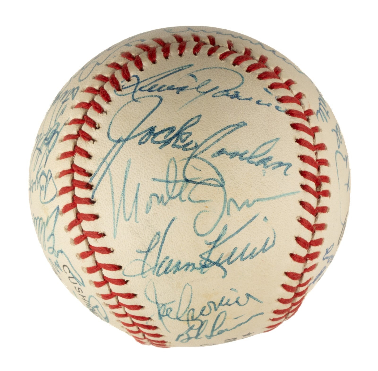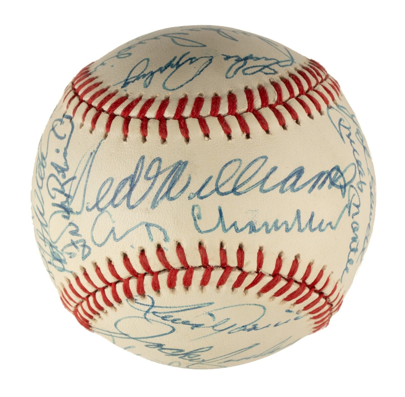 Official National League baseball (Feeney) featuring the signatures of 26 Hall of Fame and star players. The ball has been signed in blue ink by the following players: Mickey Mantle, Ted Williams (sweet spot), Roush, Hubbell, Grimes, Cronin, Averill, Appling, Snider, Feller, Mize, Aparicio, Conlan, Irvin, Killebrew, Lemon, Bell, Carter, Sewell, Chandler (sweet spot), Mathews, B. Williams, Leonard, Wilhelm, F. Robinson, and Madlock. The ball is in Near Mint condition. Full LOA from James Spence/JSA.