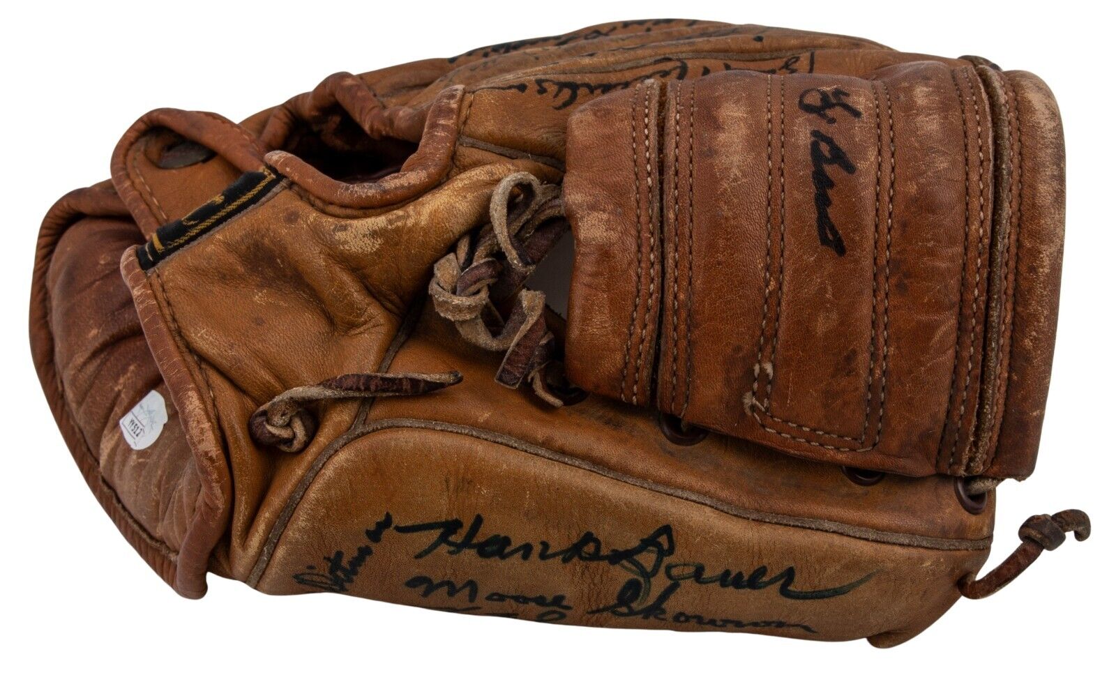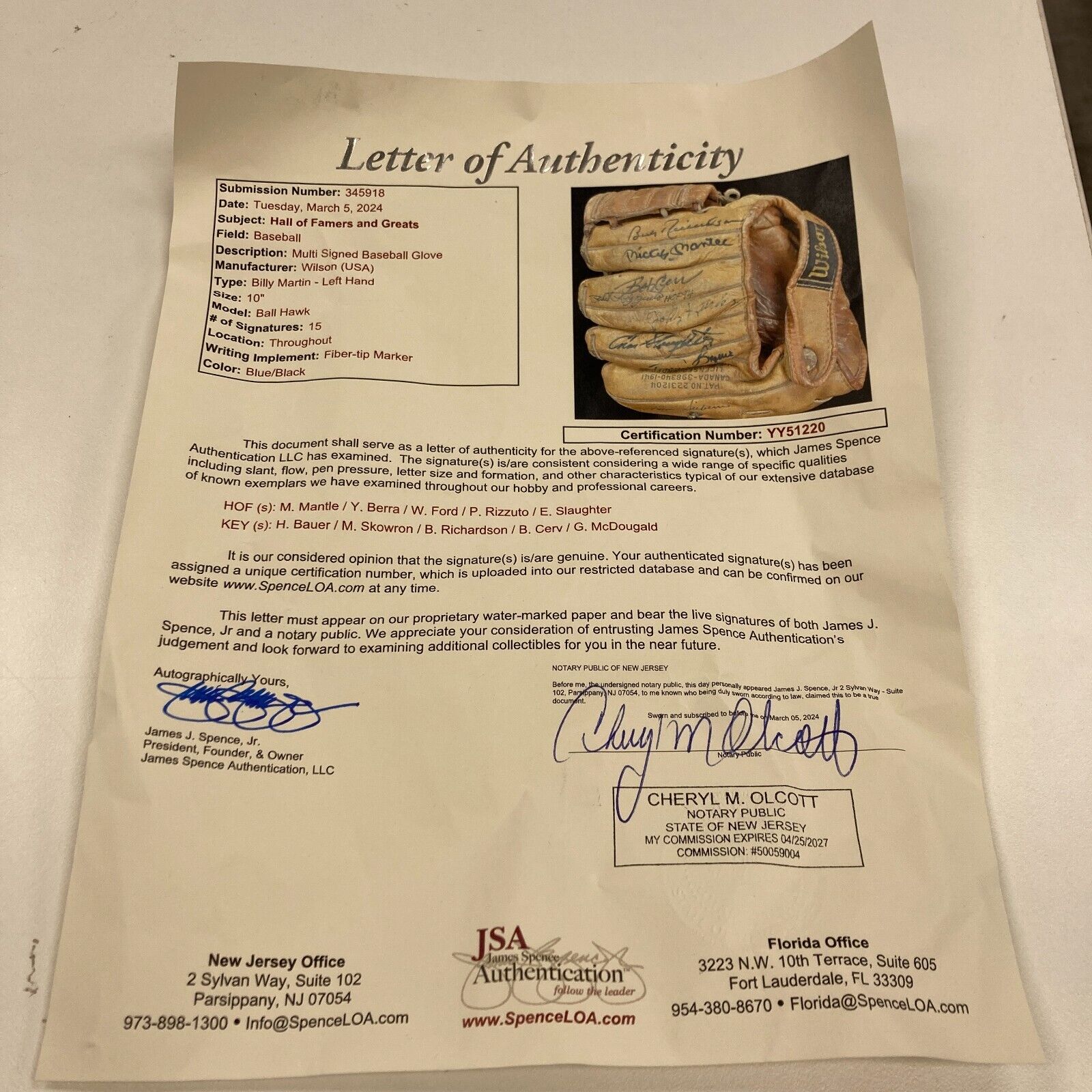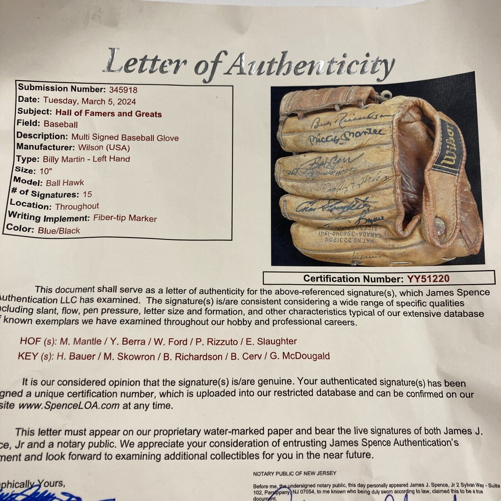 Presented is a 1957-59 Billy Martin model baseball glove containing 15 signatures from MLB Hall of Famers and Greats. Signatures belong to Hall of Famers Mickey Mantle, Yogi Berra, Whitey Ford, Phil Rizzuto, and Enos Slaughter. Additional signatures include Hank Bauer, Bill Skowron, Bobby Richardson, Bob Cerv, and Gil McDougald. The glove comes with an LOA from JSA (YY51220) for signatures.