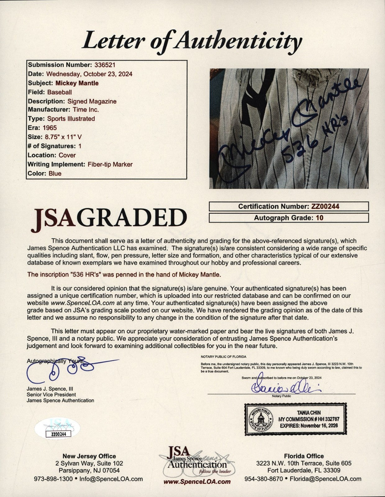 Displayed is a Mickey Mantle signed and inscribed June 21, 1965, Sports Illustrated #v22 #25 magazine. After winning the American League pennant in nine of the previous ten years, and 14 of the previous 16 seasons, the 1965 Yankees seemed to fall apart and slumped to a 77-85 record, and the team finished in 6th place out of the ten AL squads. Mantle also suffered a downturn, as in 122 games, the 33-year-old slugger batted only .255 with 19 home runs and 46 RBIs. The offered Sports Illustrated magazine measures 8.25x11". Mantle, appearing somewhat dejected, is on the cover, carrying his bat. The cover reads, "NEW YORK YANKEES/END OF AN ERA." Mantle was a large part of that 1951-64 Yankees success, as he helped the Bronx Bombers to seven World Series crowns in his career. The magazine article on the Yankees is called, "Decline and Fall of a Dynasty." Mantle finished his career in the 1968 season, with 536 lifetime home runs, still more than any other switch-hitter in history.