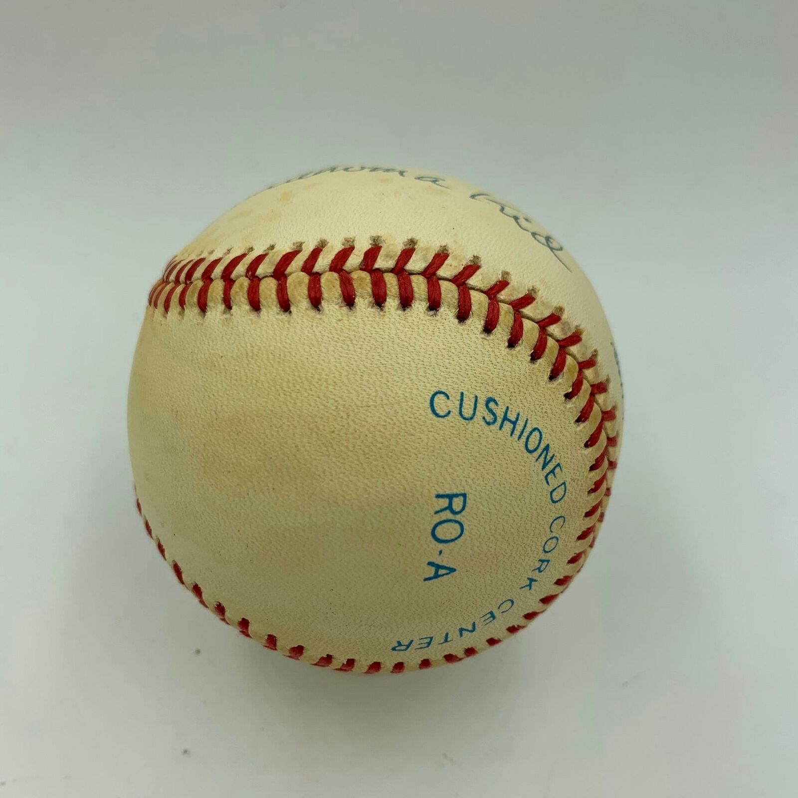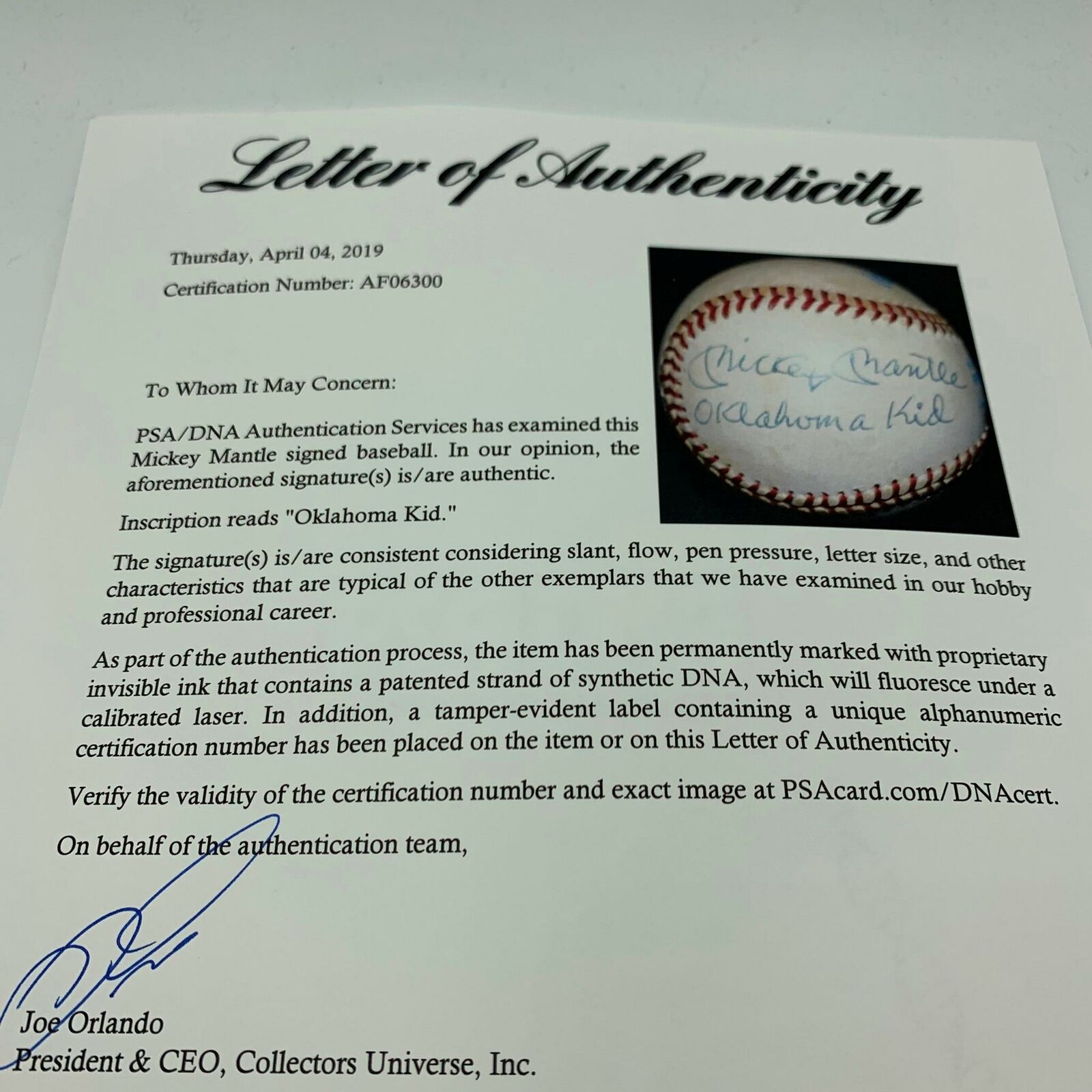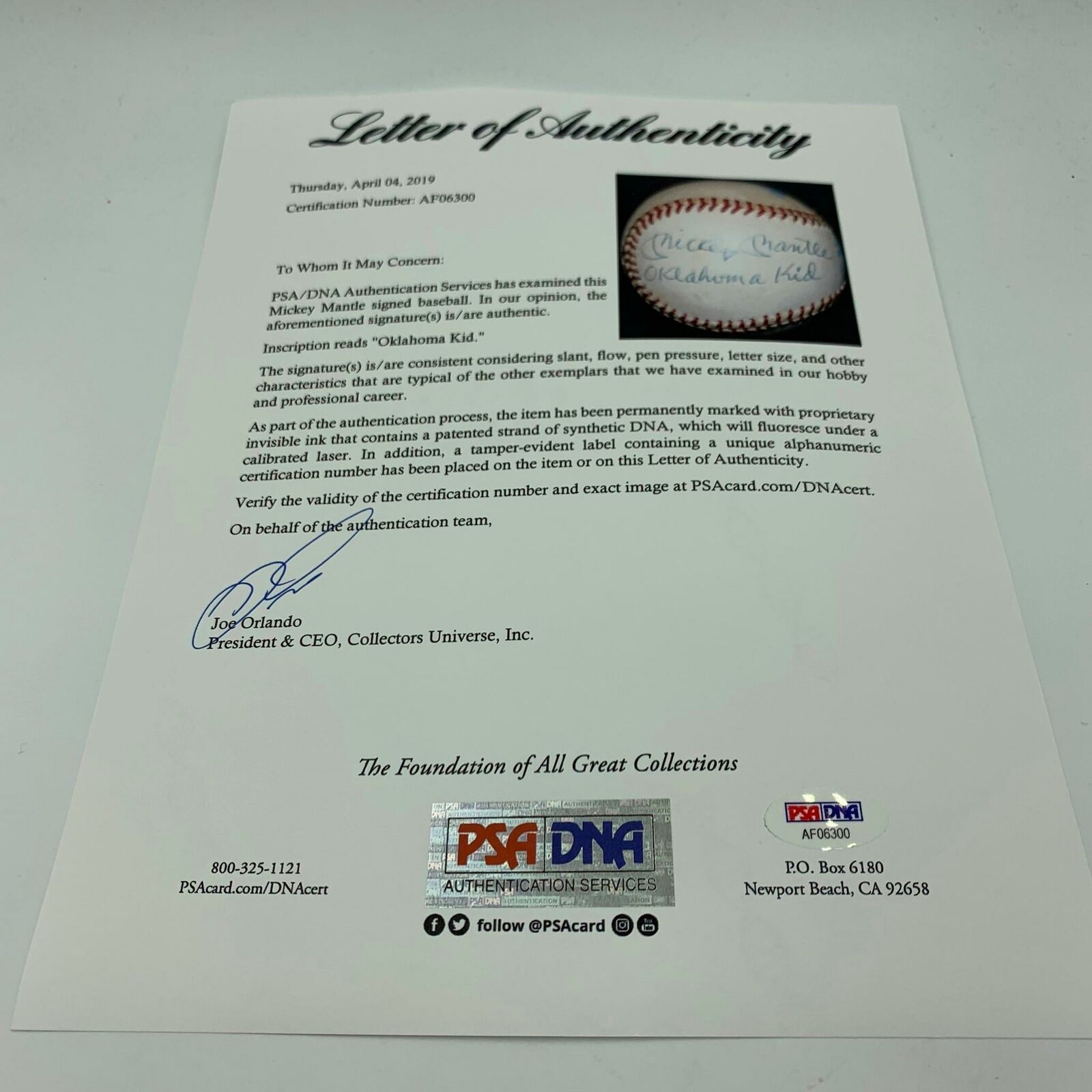 Extraordinary Mickey Mantle "Oklahoma Kid" single signed inscribed Official American League Baseball. This is the rarest of all Mantle inscription baseballs. This is one of only a few known to exist. Jimmy Spence Of JSA once said that in his over thirty years in the hobby, he had never seen a Mantle single-signed baseball inscribed "Oklahoma Kid" nor did he have any exemplars on a baseball in his one thousand plus Mantle signatures on file. The ball has been authenticated by PSA DNA with a full Letter Certificate Of Authenticity. Full letter COA from SGC as well.