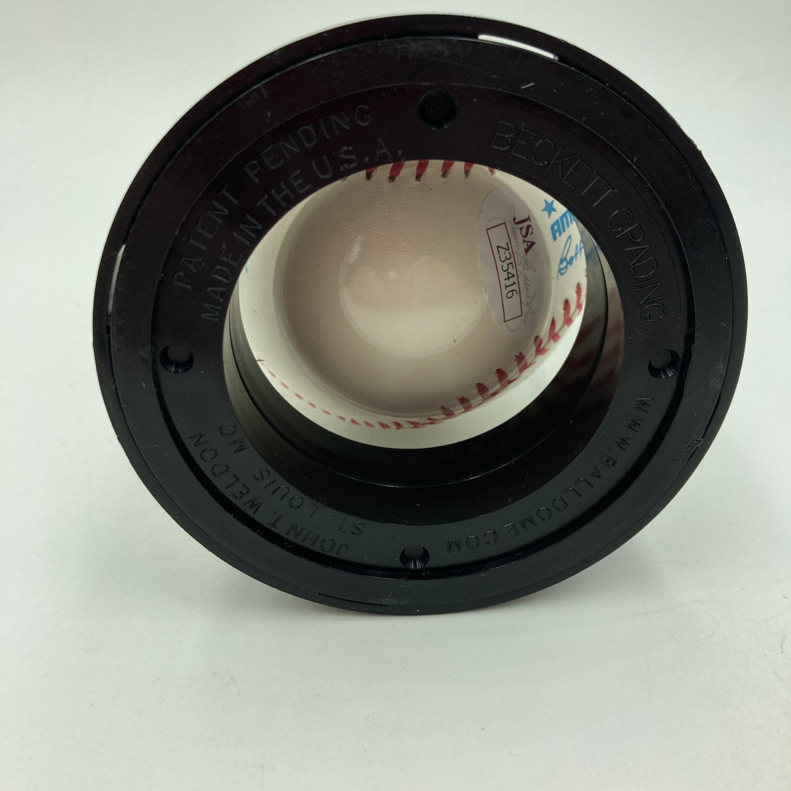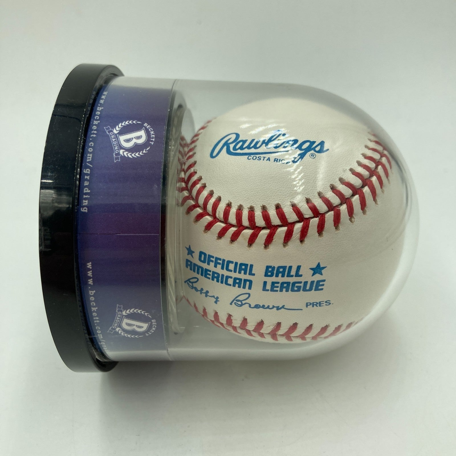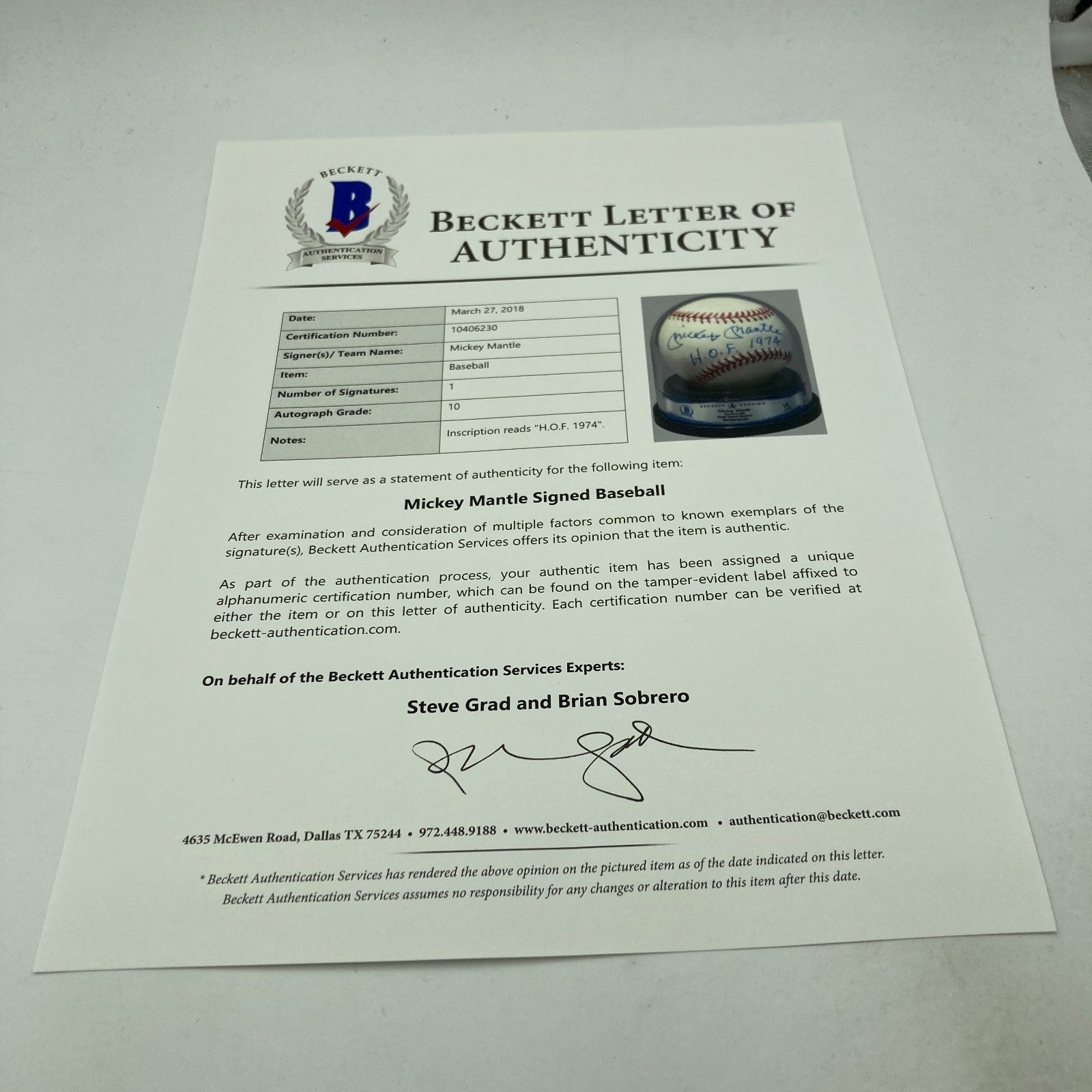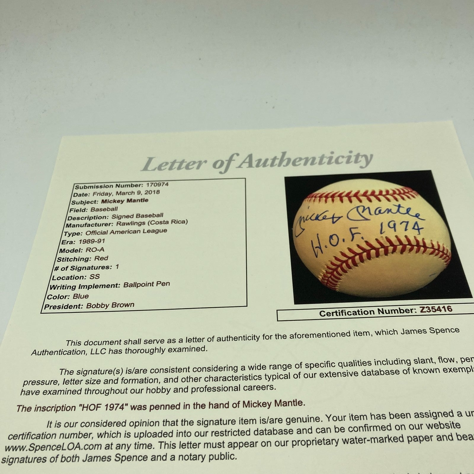 Offered is a Rawlings Official American League baseball signed by Mantle on the sweetspot. He inscribed "H.O.F. 1974". LOA from JSA, Z35416. Encapsulated by Beckett, Graded Gem Mint 10. Full LOA from Beckett Authentication Services.