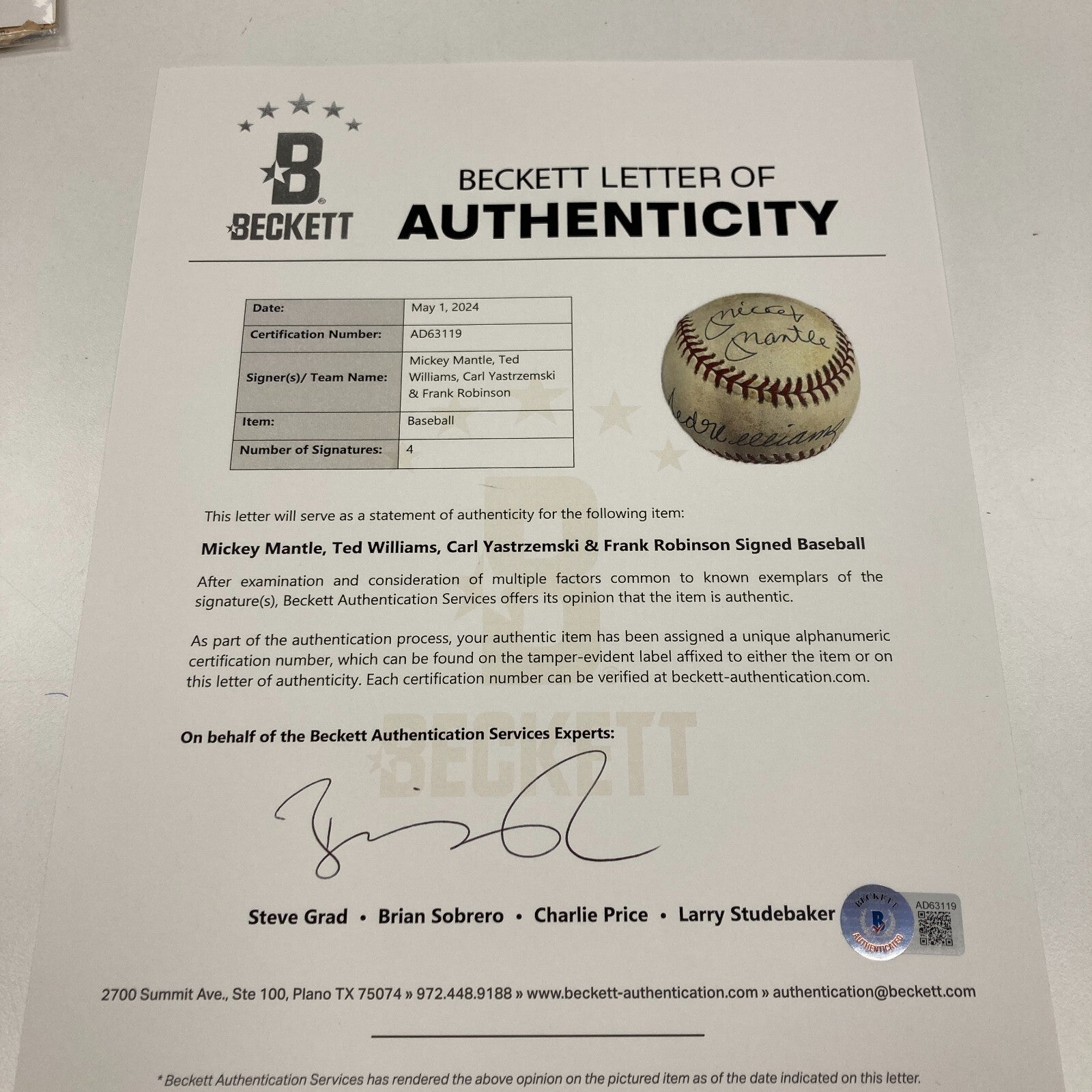 A quartet of home run legends are featured on this impressive ball from the 1990's. Signatures include: Mickey Mantle, Frank Robinson, Ted Williams and Yaz. A UDA hologram is affixed to the side panel of the sphere. UDA hologram #UDS23135. Full LOA from Beckett Authentication Services.
