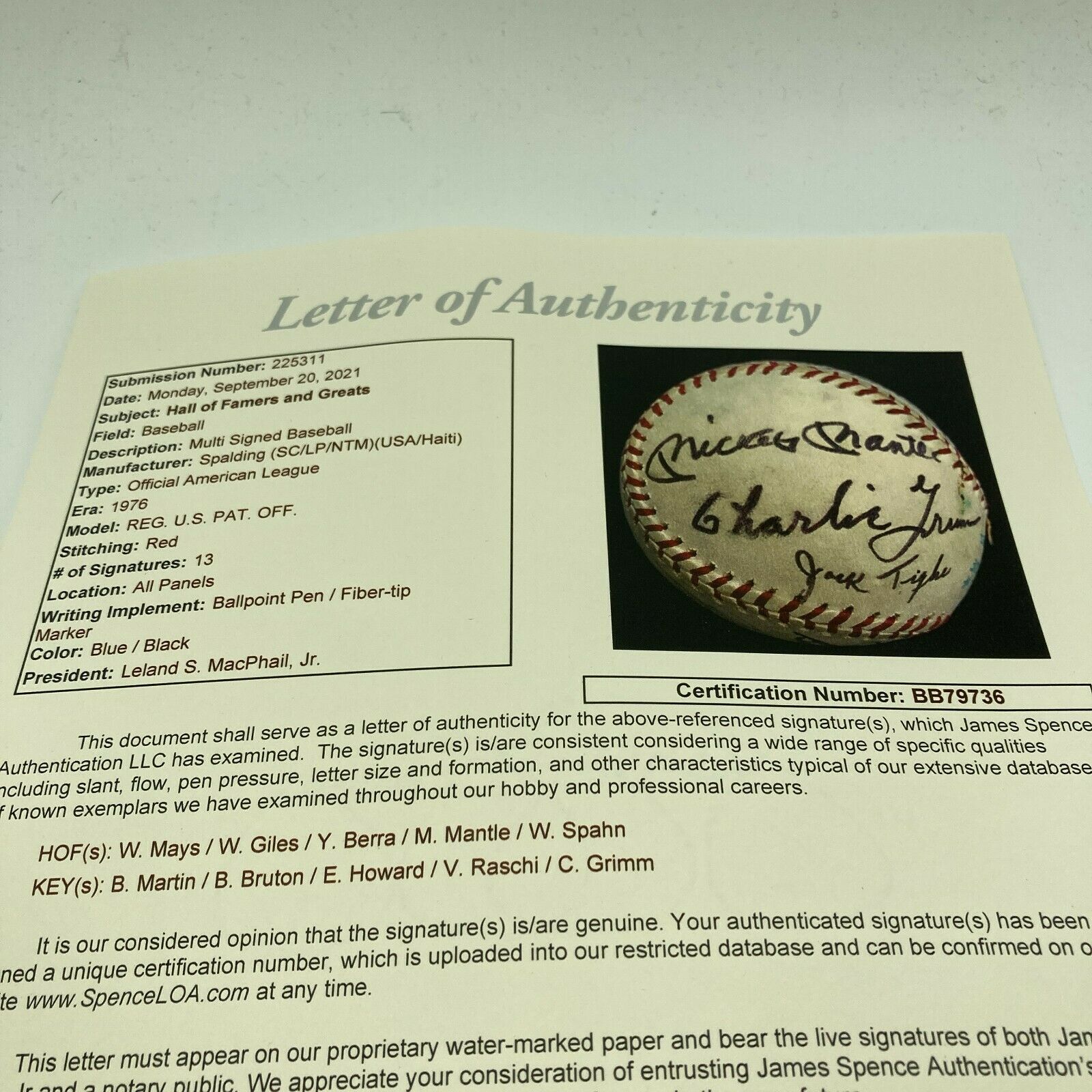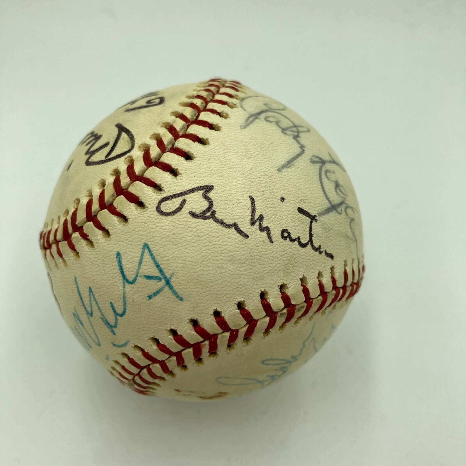 Rare Hall Of Fame multi signed American League baseball. Rare Warren Giles sweet spot signature. Also signed by Mickey Mantle, Willie Mays, Elston Howard, Yogi Berra, Billy Martin and others.