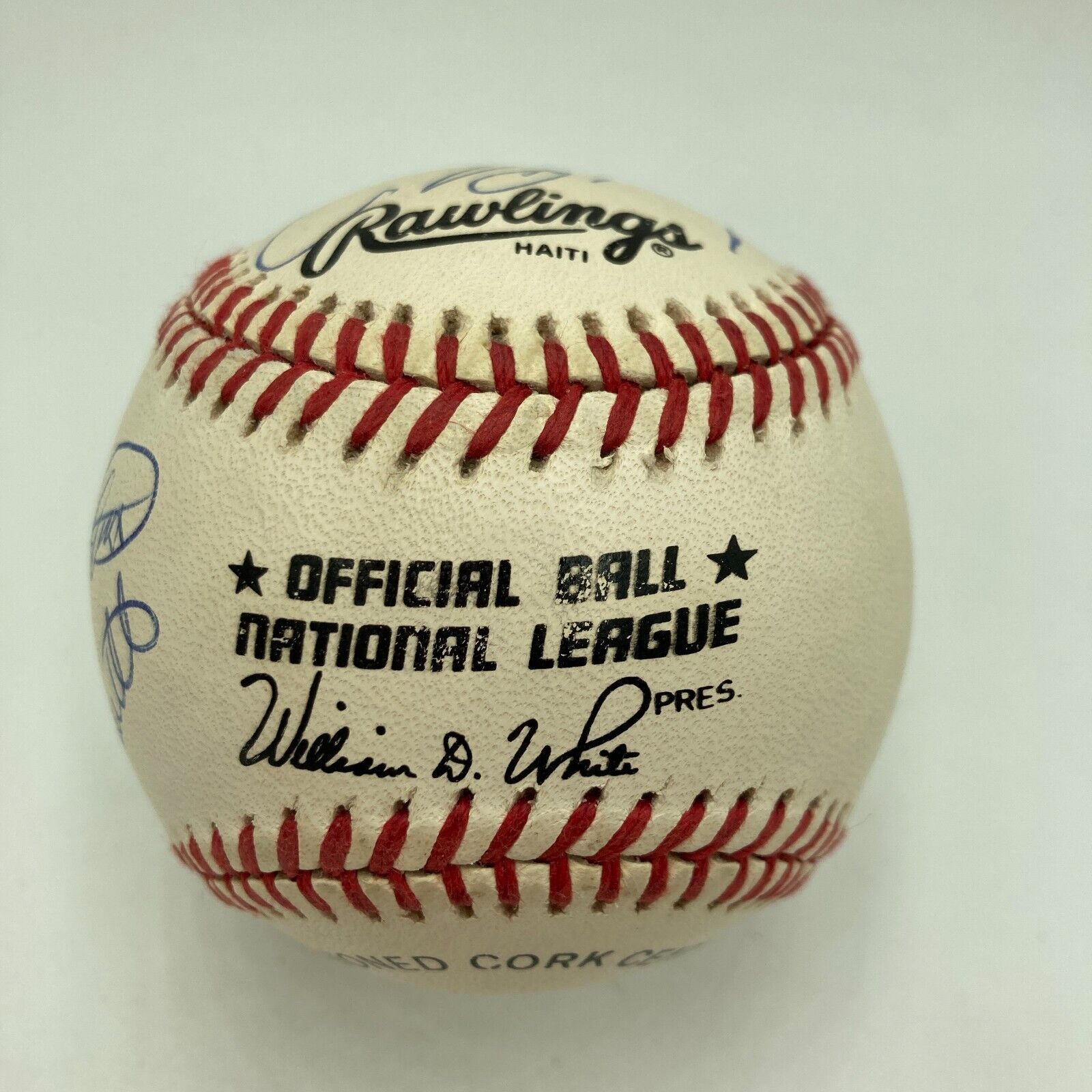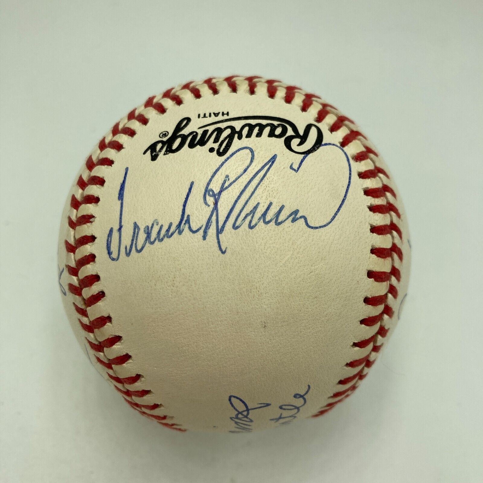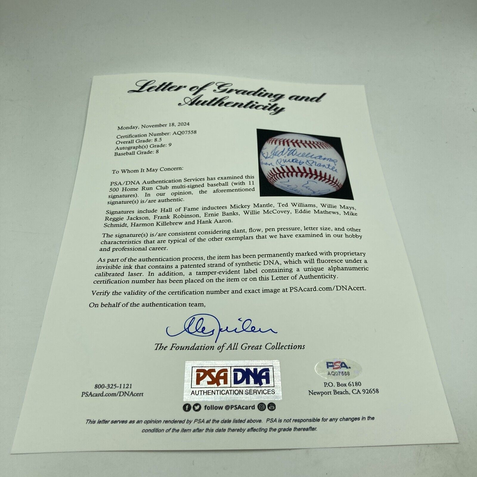 This beautifully signed 500 Home Run Club signed baseball has all the big names. Signed Official American League baseball features 11 signatures including: Mickey Mantle, Ted Williams, Hank Aaron, Willie Mays, Willie McCovey, Harmon Killebrew, Ernie Banks, Mike Schmidt, Frank Robinson, Reggie Jackson and Eddie Mathews; all signatures in blue ink. Full letter PSA DNA COA signatures graded MINT 9.