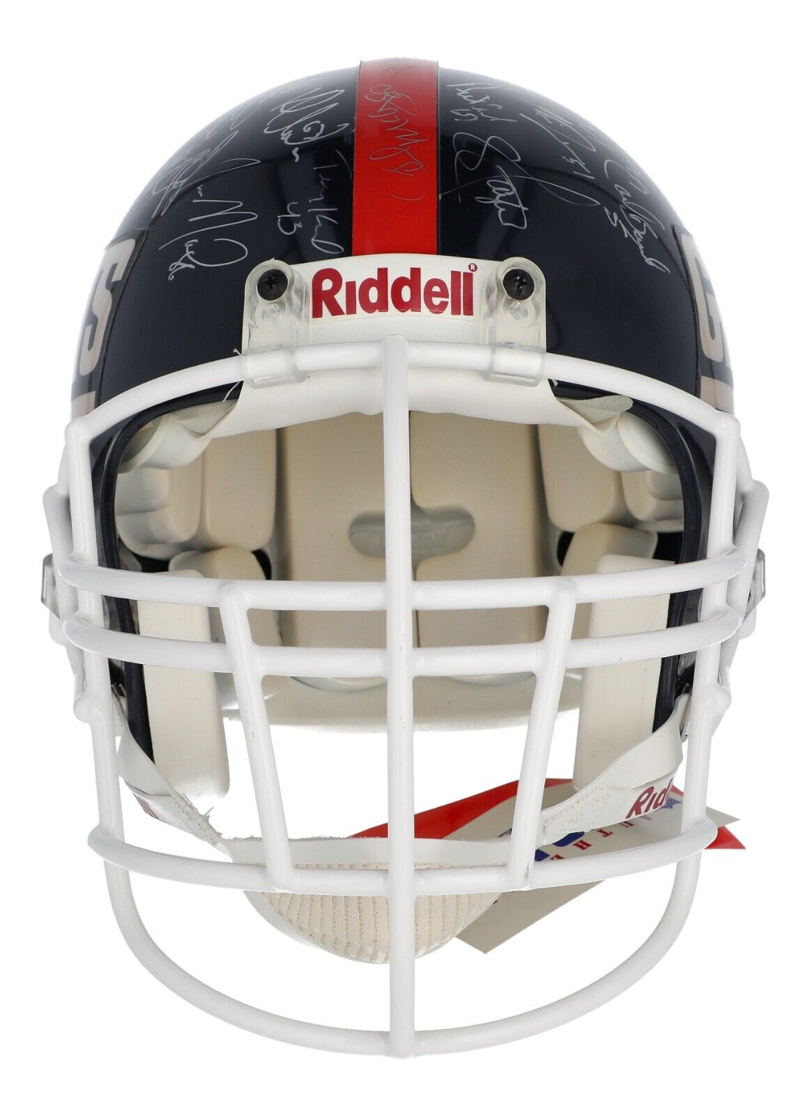 Presented is a New York Giants Riddell authentic game model football helmet containing more than 40 signatures from membersof the 1986 Super Bowl-winning Giants football team. Each signature has been penned in silver marker throughout the helmet. Notable signatures include Hall of Famers Lawrence Taylor and Harry Carson, plus Phil Simms, Lionel Manuel, Terry Kinard, Karl Nelson, Brian Johnston, Ottis Anderson, Phil McConkey, Robbie Jones, Lee Rouson, Sean Landeta, Kenny Hill, and Mark Bavaro. The helmet comes with an LOA from JSA for signatures.